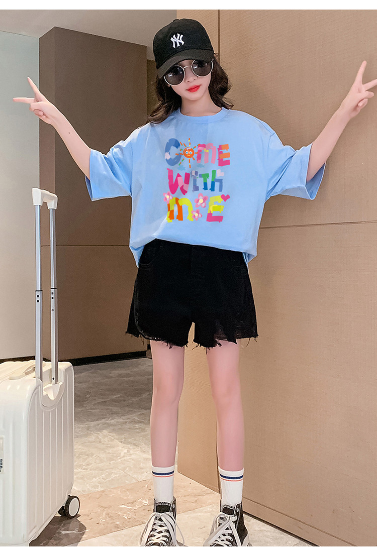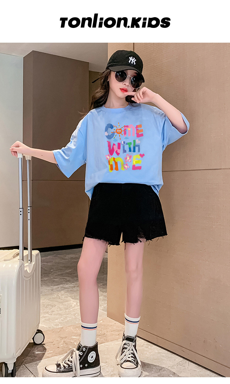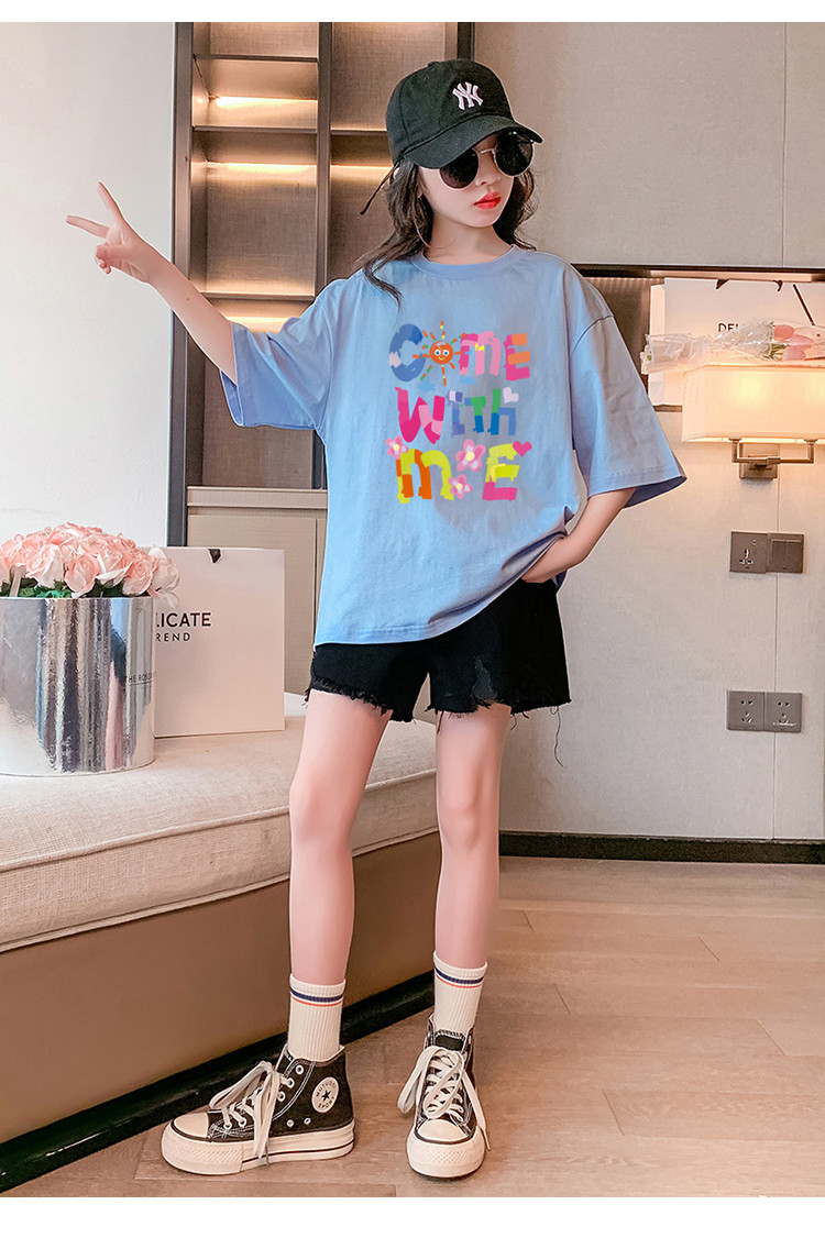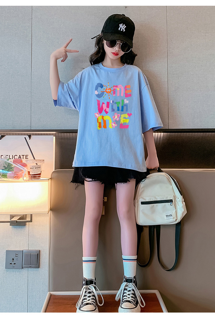 【纯棉吸汗】女童T恤春秋时尚儿童短袖衫中大童落肩短袖T恤上衣 002639