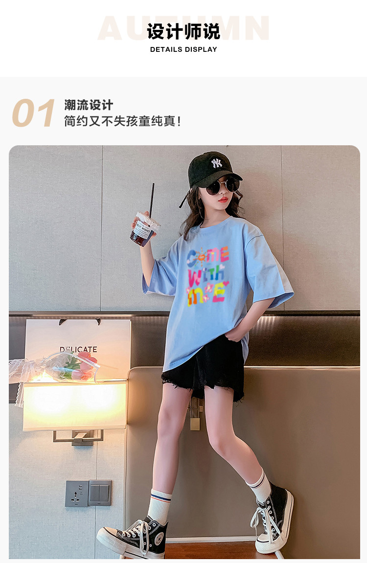 商品名称:【纯棉吸汗】女童T恤春秋时尚儿童短袖衫中大童落肩短袖T恤上衣 002639