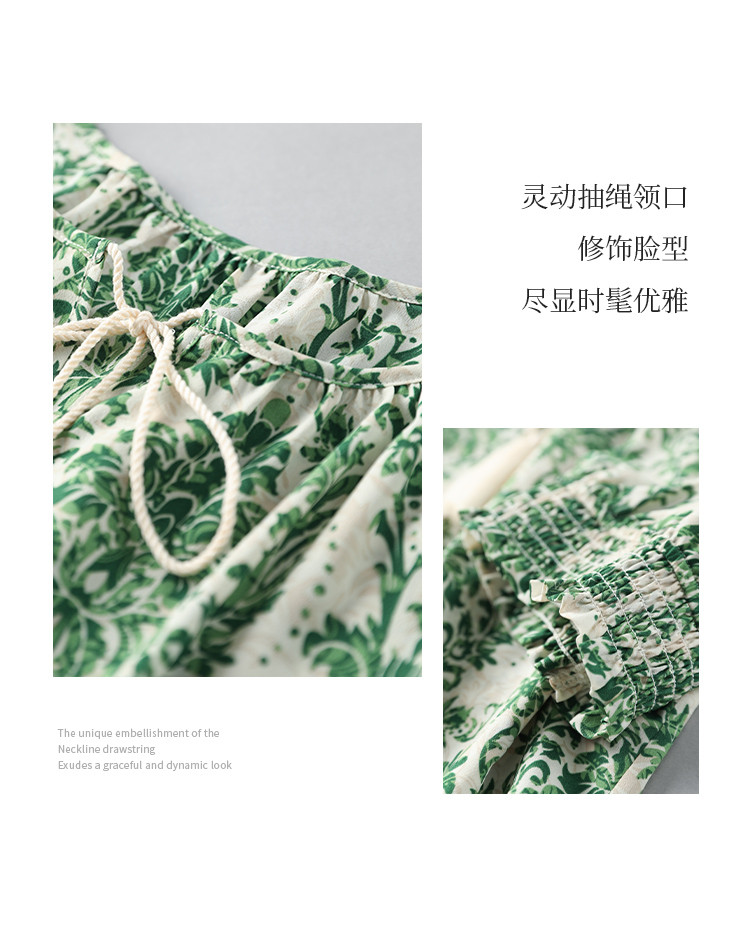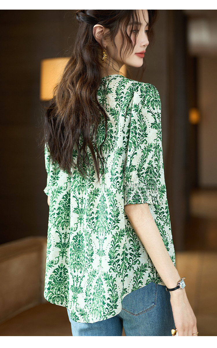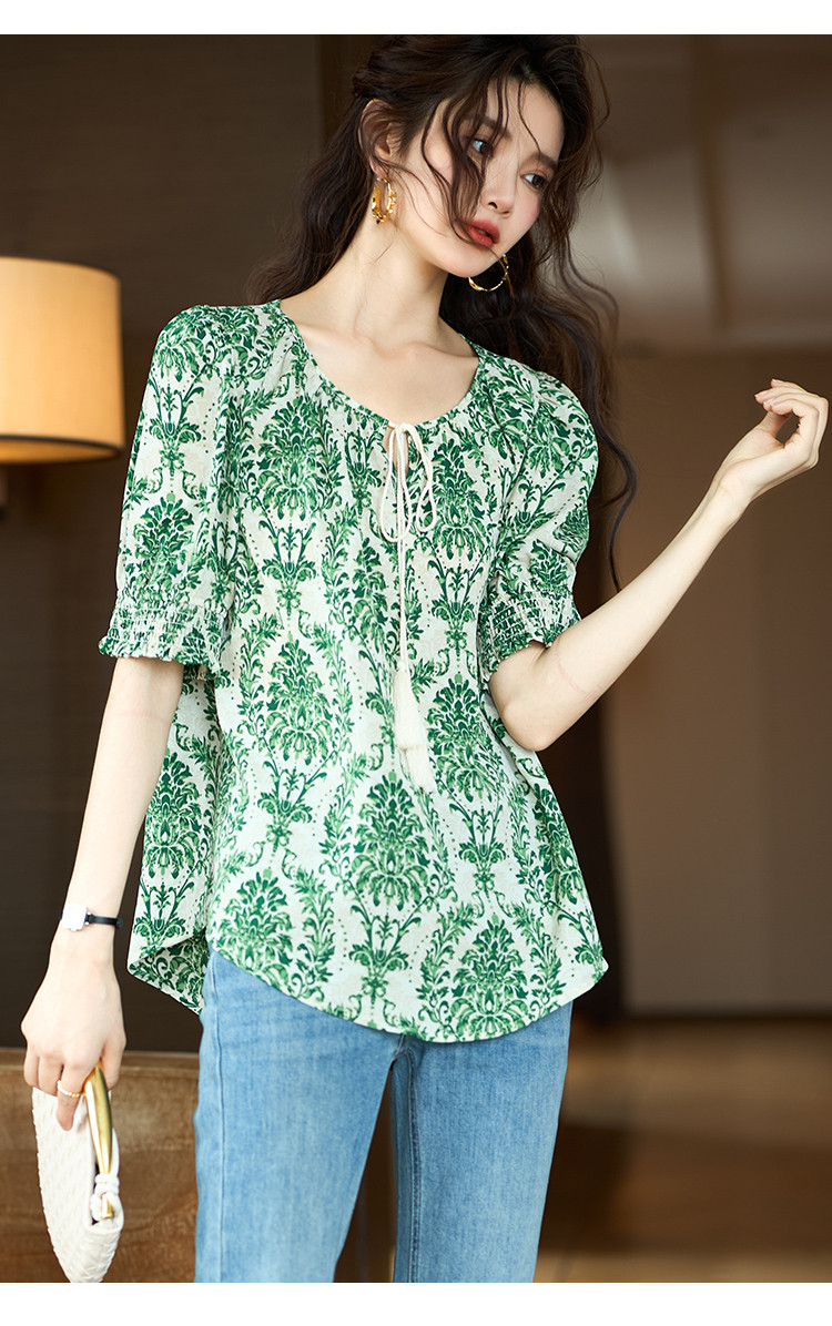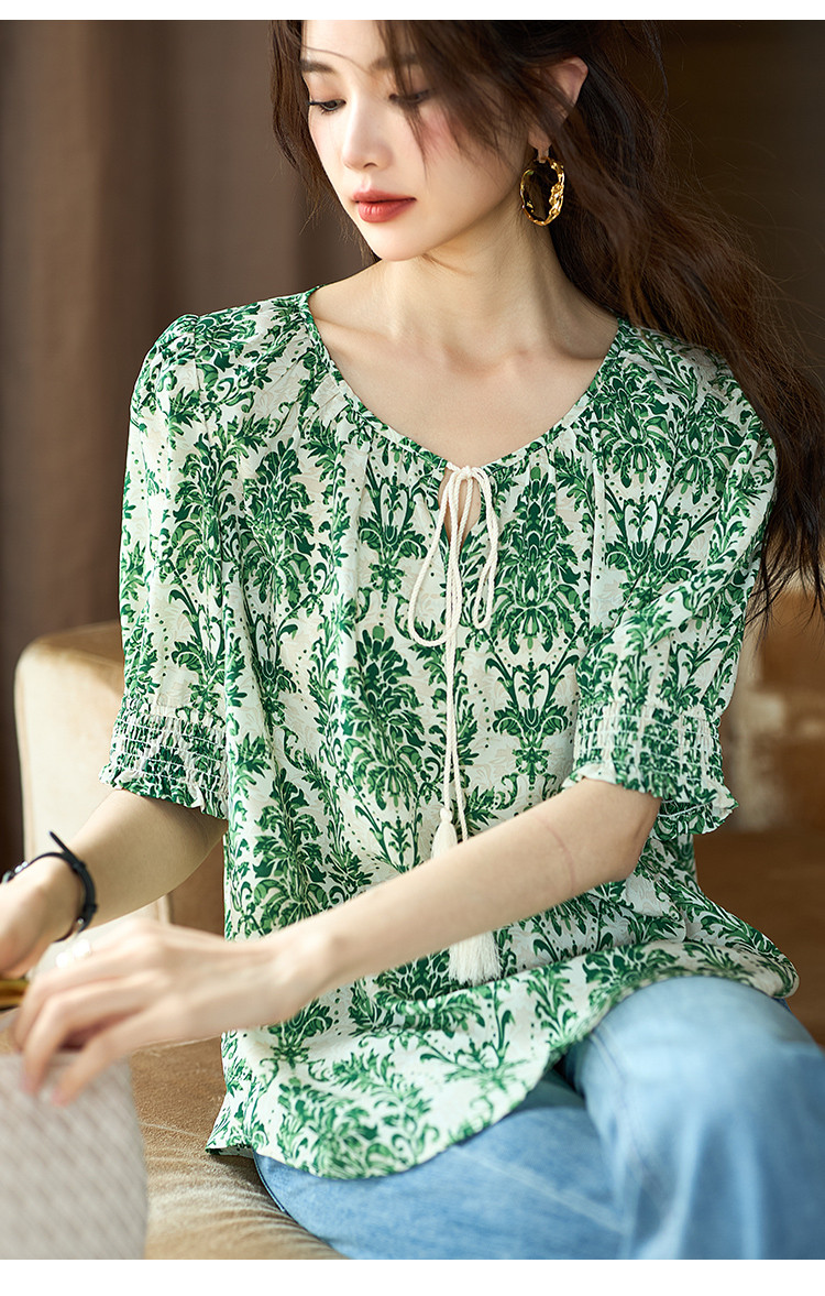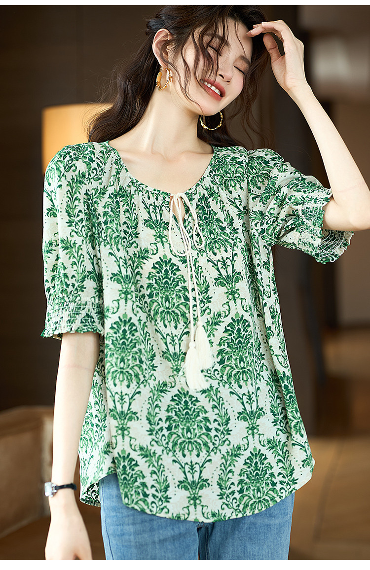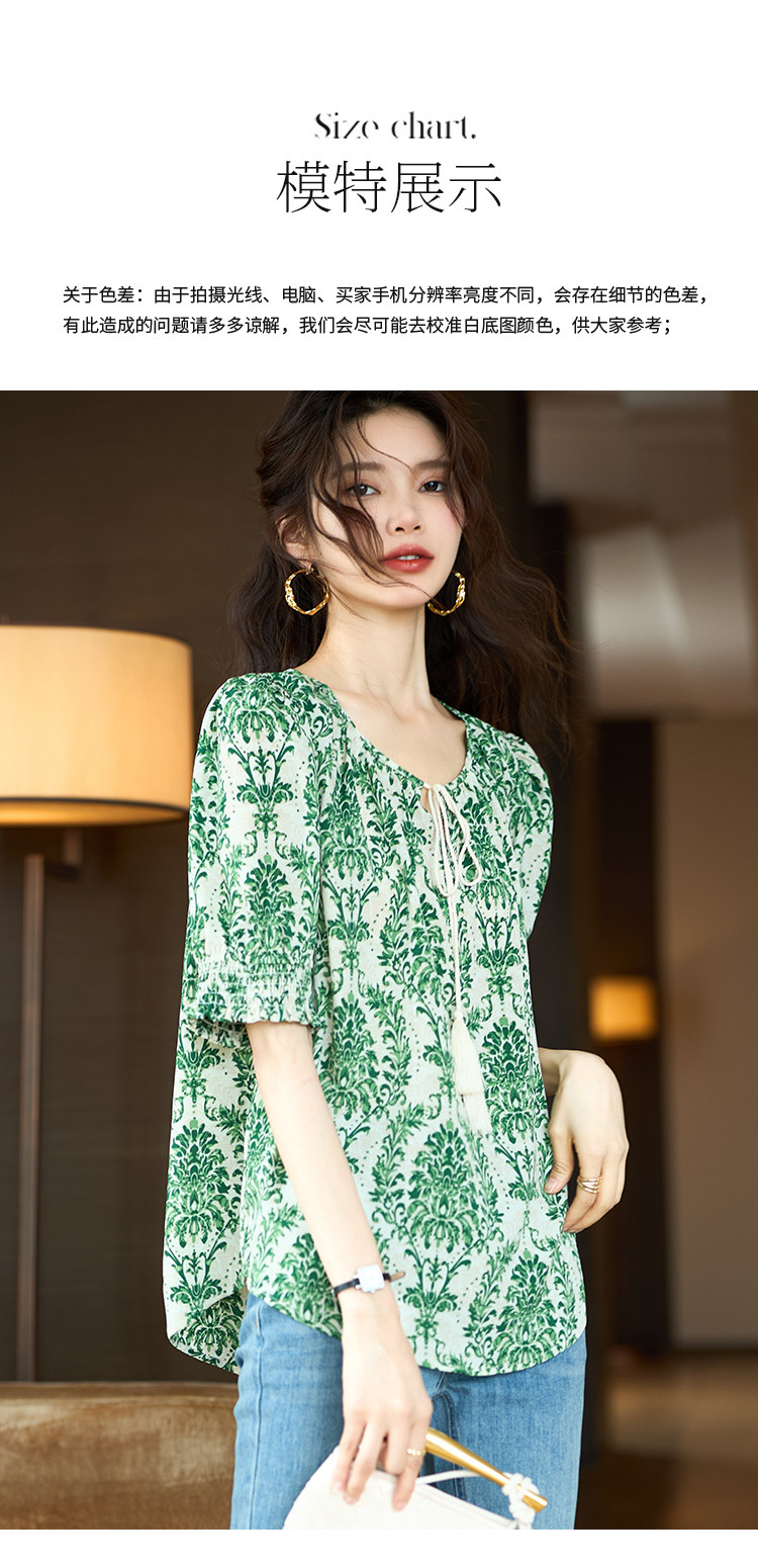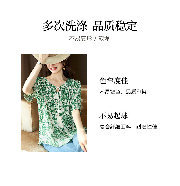 商品名称:【民族风印花】2025夏季女短袖T恤系带领衬衫上衣宽松休闲 783945
