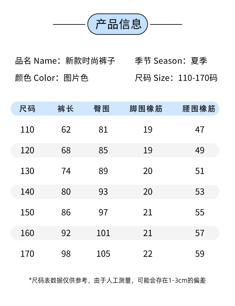 | 尺码 | 身高(cm) | 腰围(cm) | 裤长(cm) | 臀围(cm) | 适合年龄 | 号型 |