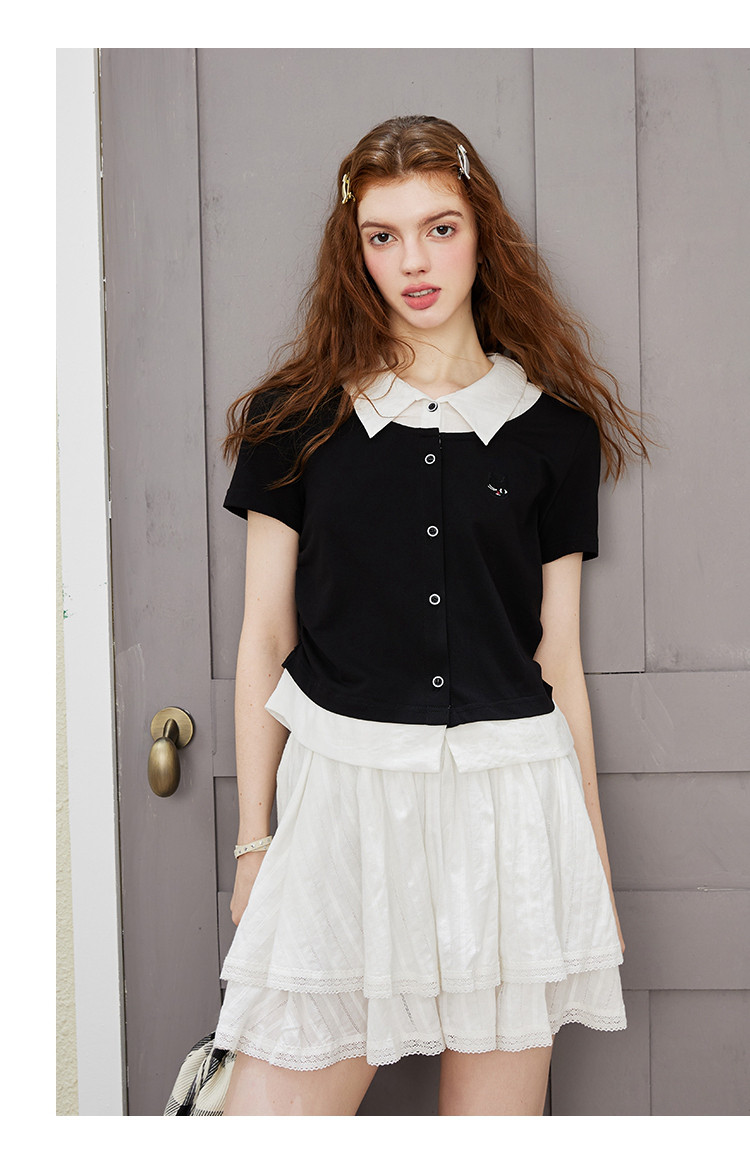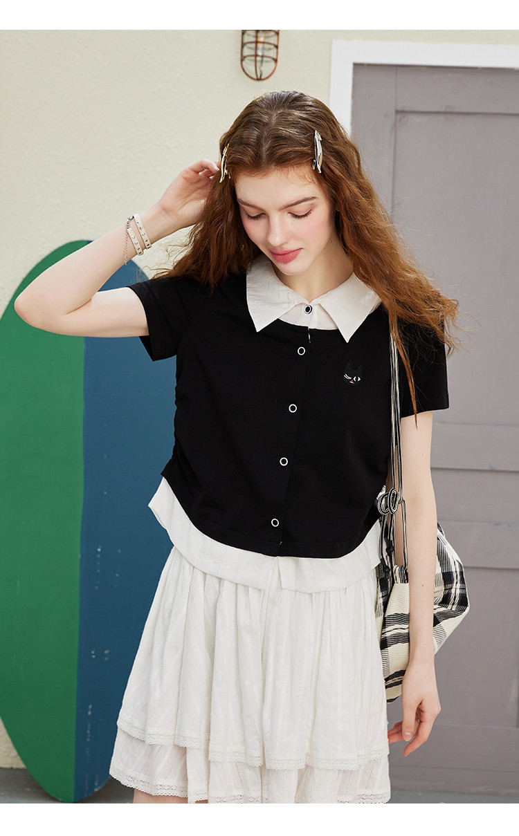 撞色假两件设计感休闲女式T恤夏季减龄收腰百搭短袖上衣 372061