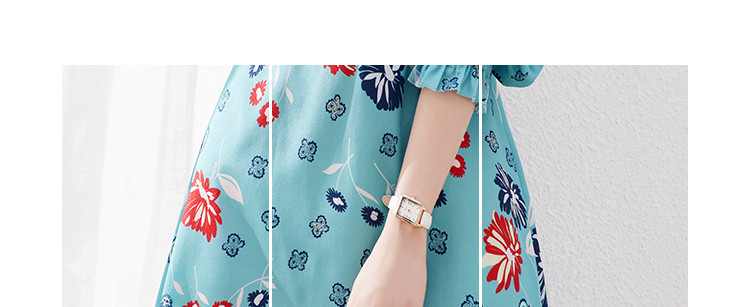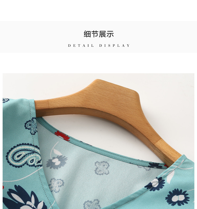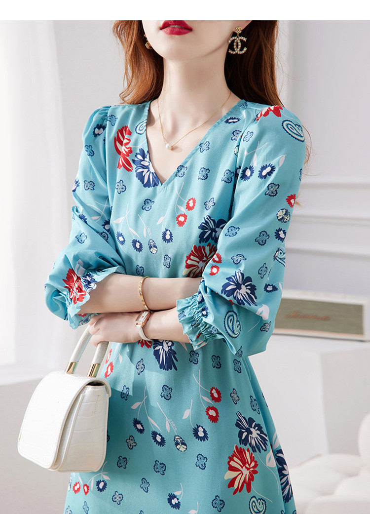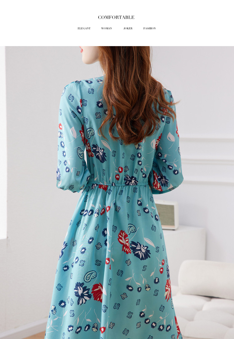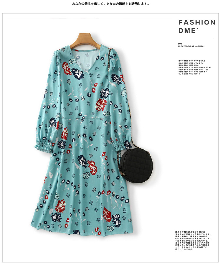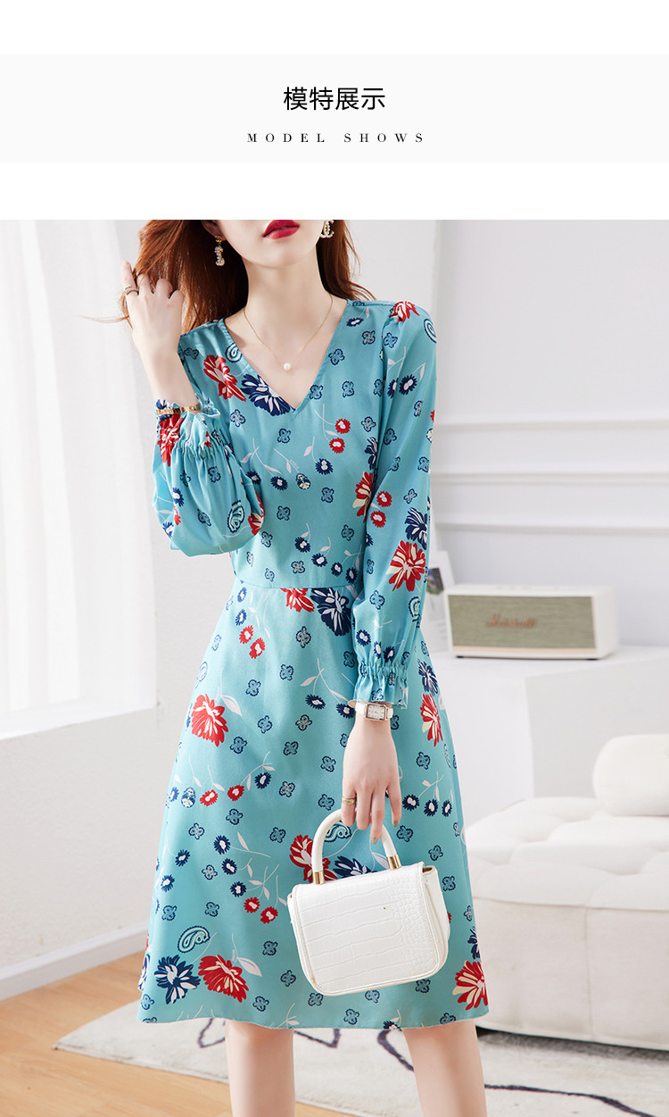 商品名称:【法式通勤】春秋V领长袖印花抽褶a字连衣裙女 649537