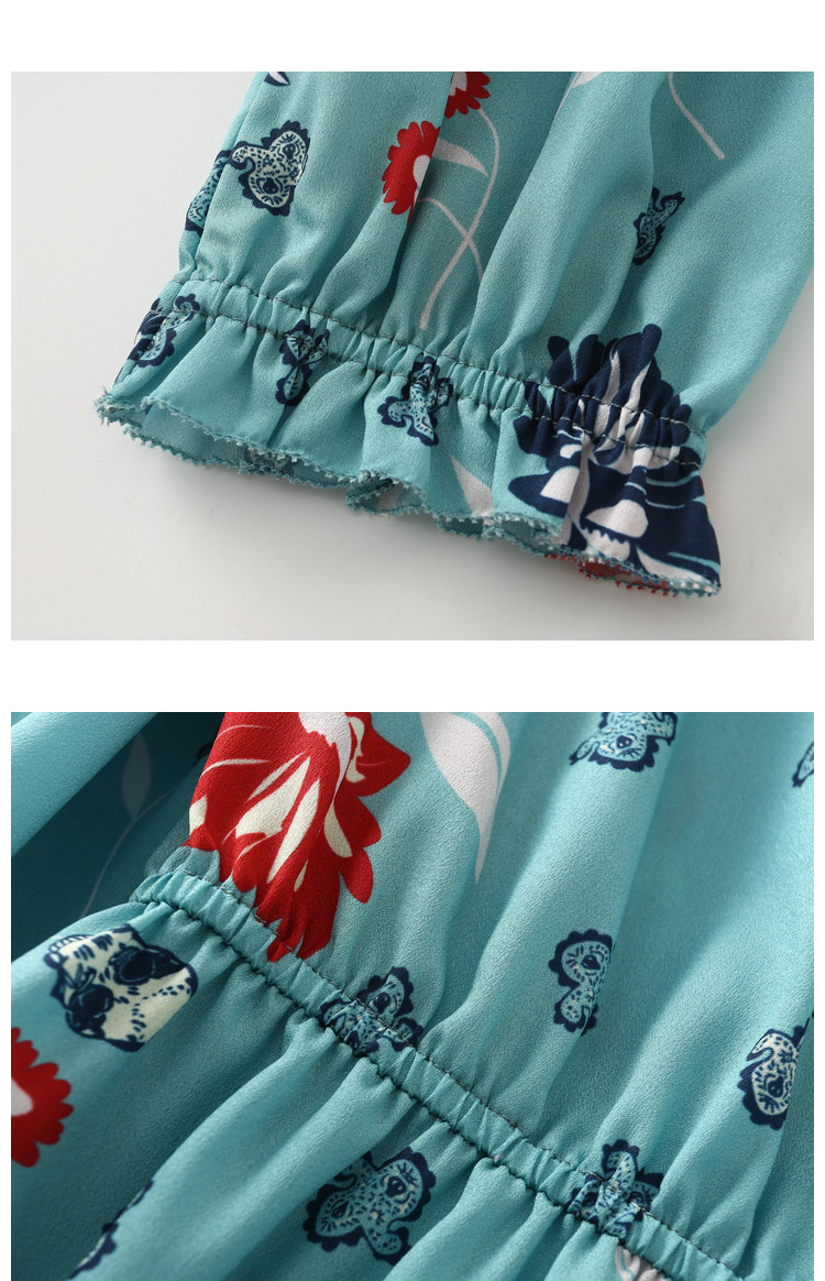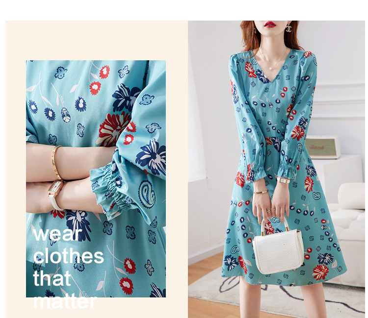 【法式通勤】春秋V领长袖印花抽褶a字连衣裙女 649537