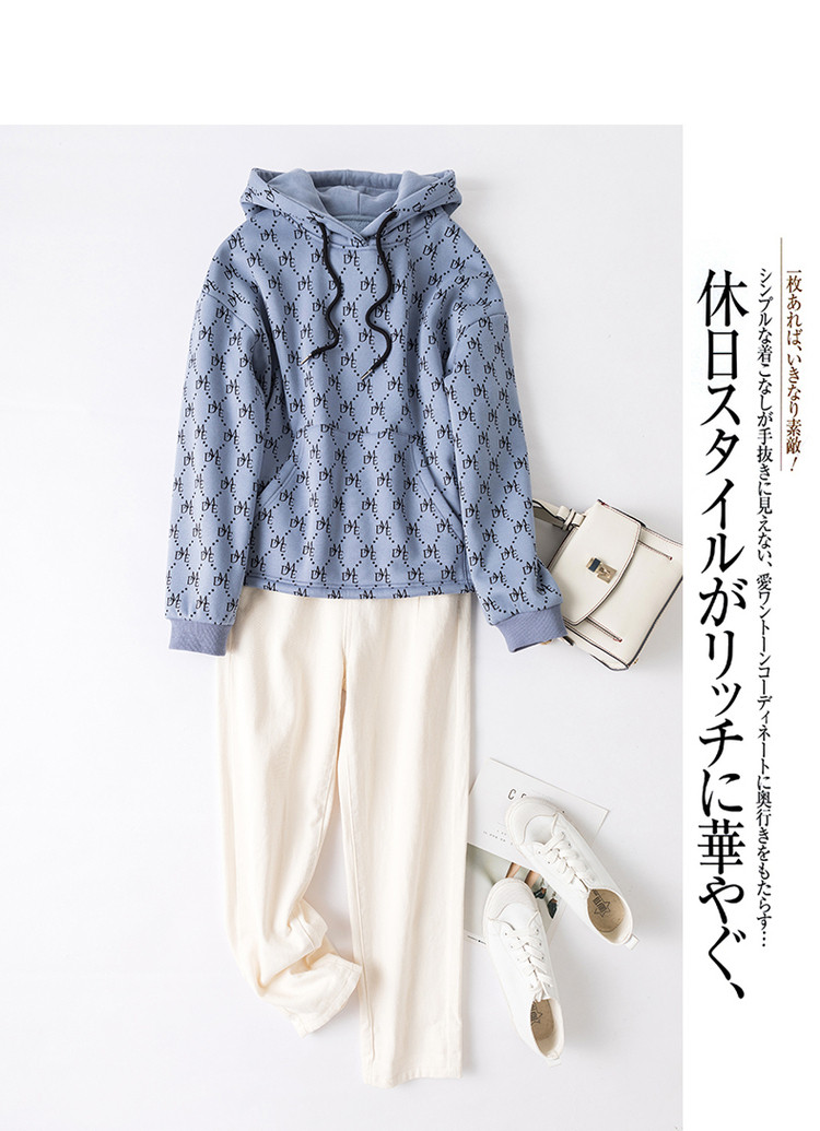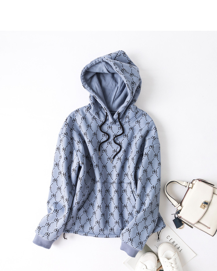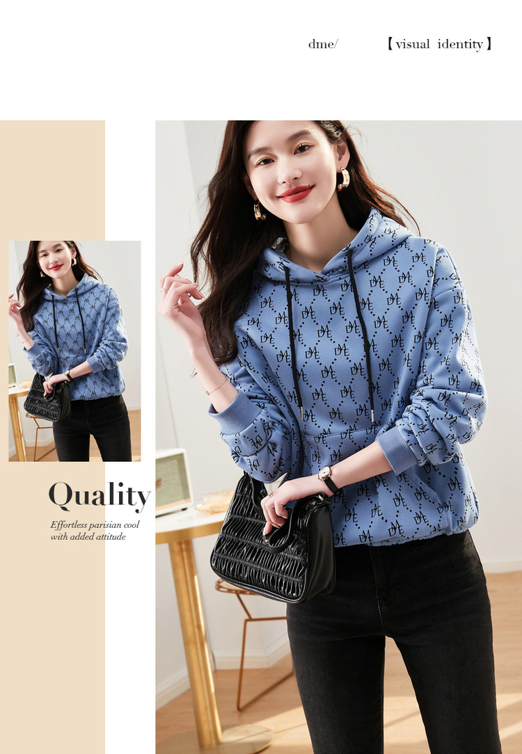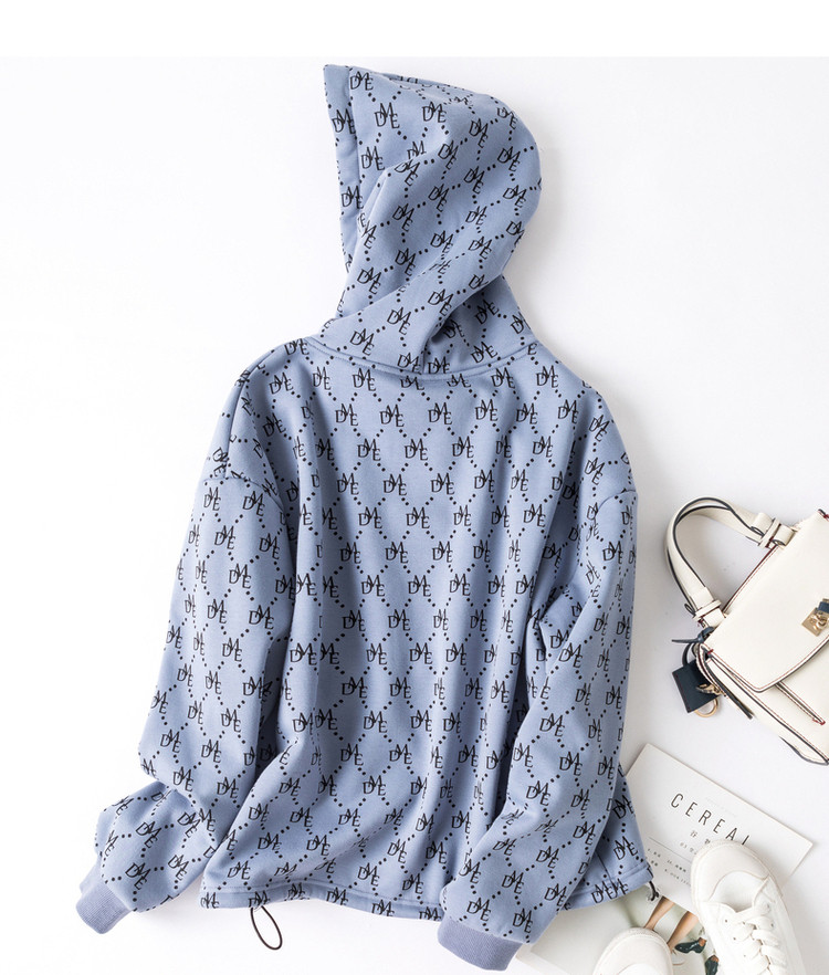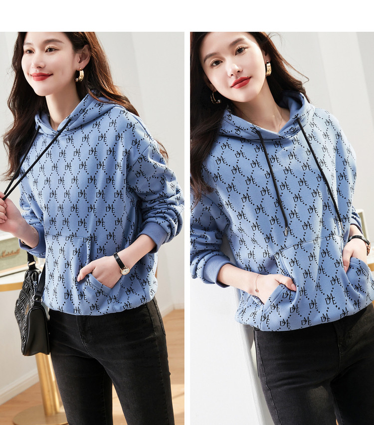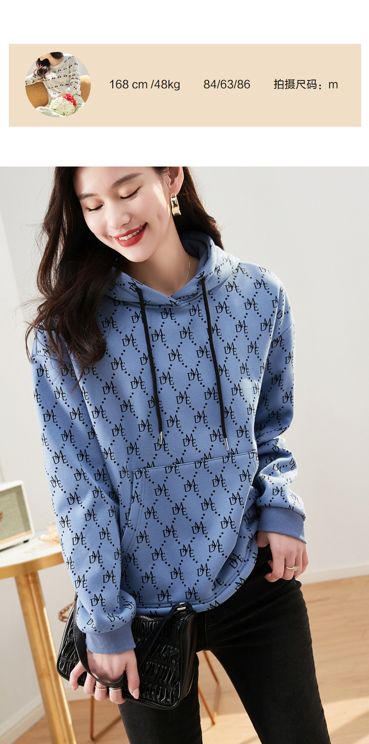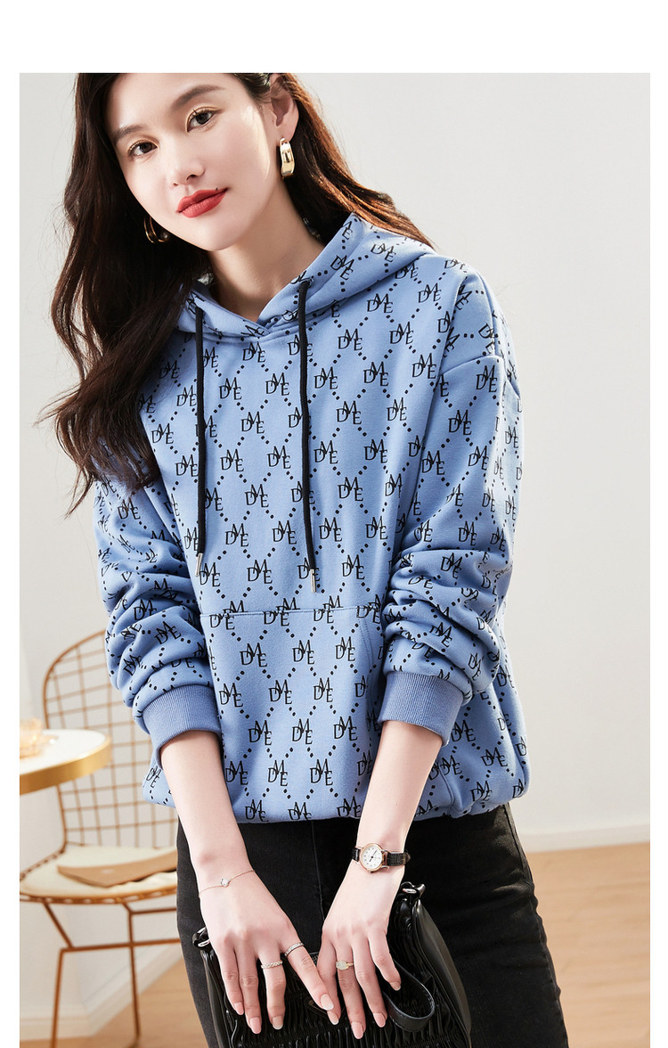 【字母印花】春秋连帽含棉宽松落肩微弹抽绳长袖卫衣女 701377