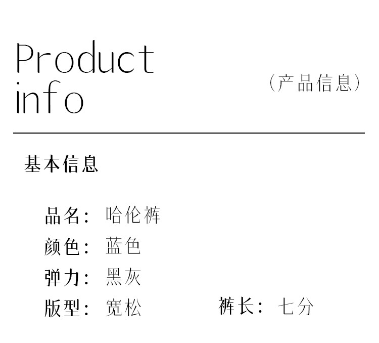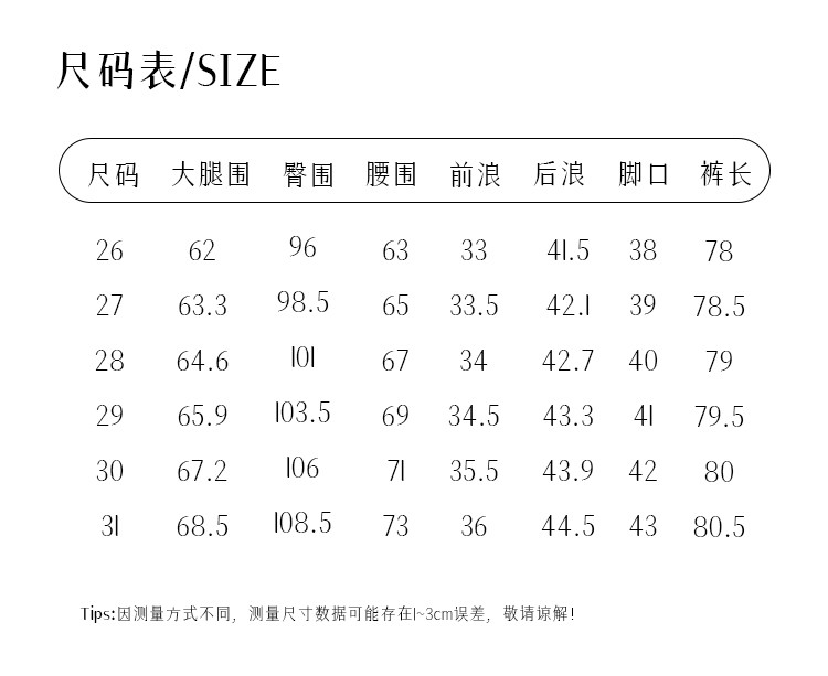| 尺码 | 大腿围(cm) | 裤脚围(cm) | 前浪(cm) | 后浪(cm) | 腰围(cm) | 裤长(cm) | 膝围(cm) | 臀围(cm) | 号型 |
