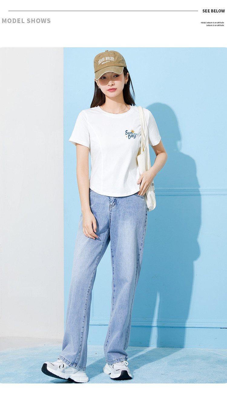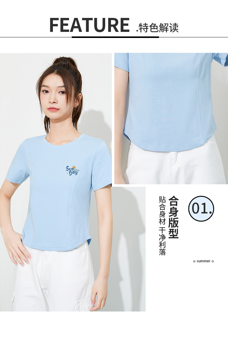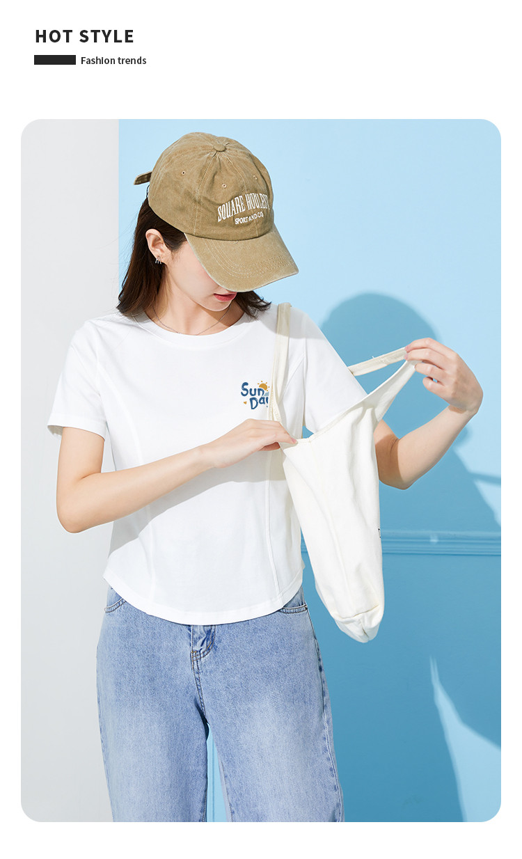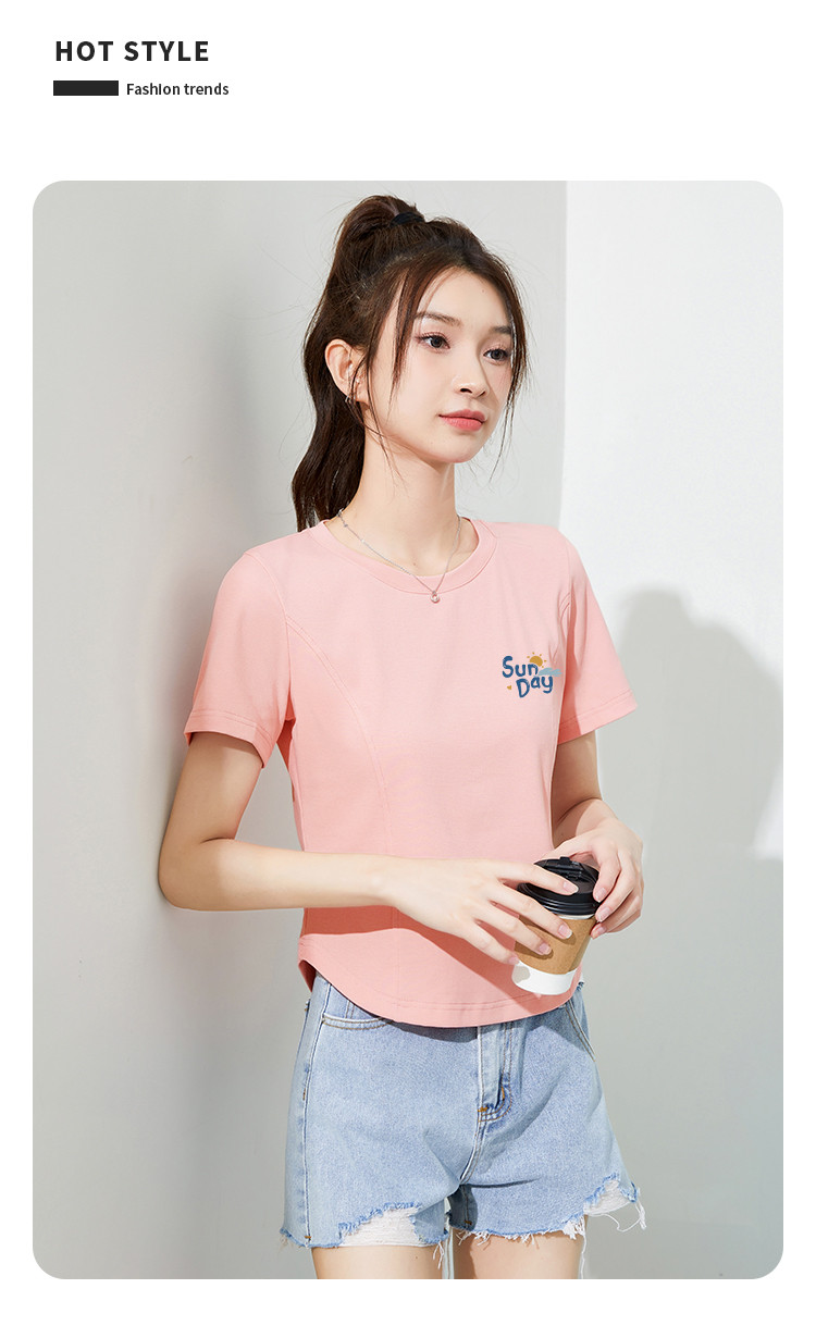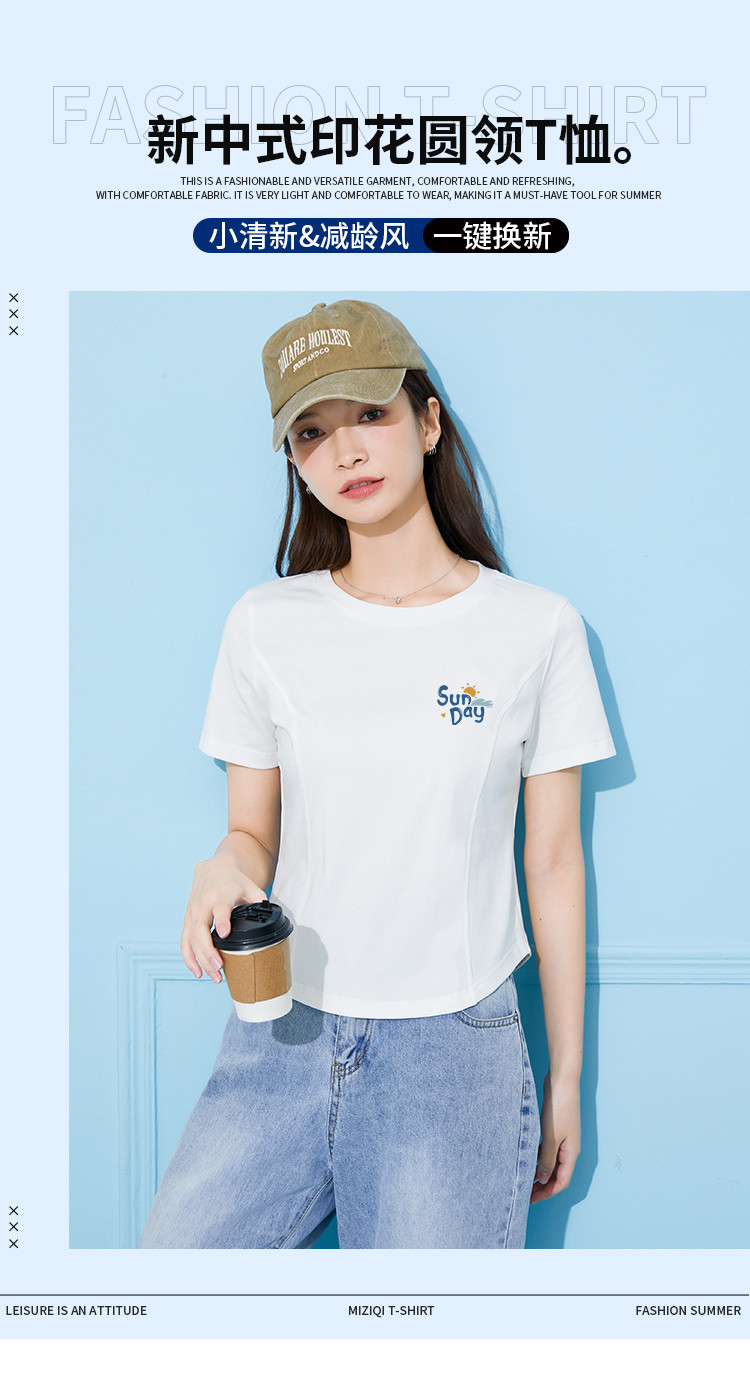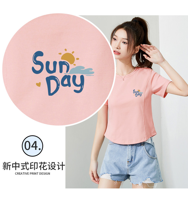 商品名称:米子旗夏季女字母印花圆领T恤弧形下摆显瘦舒适短袖上衣 394522