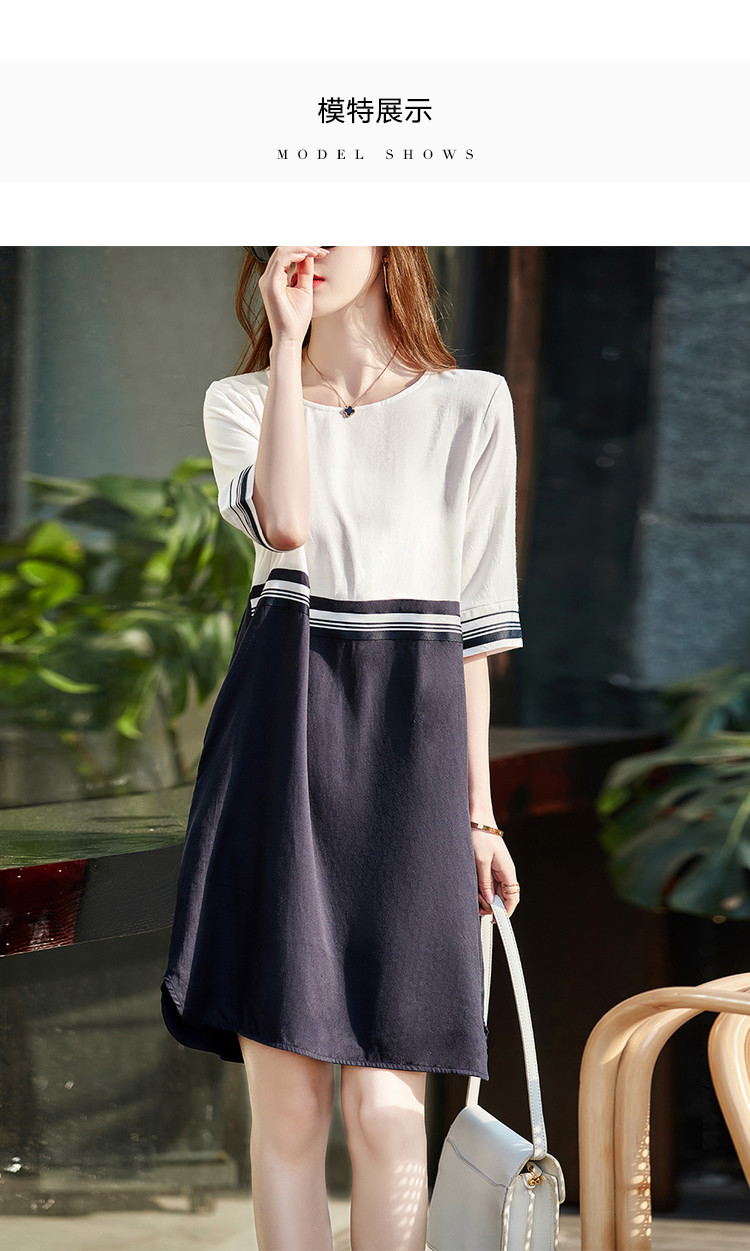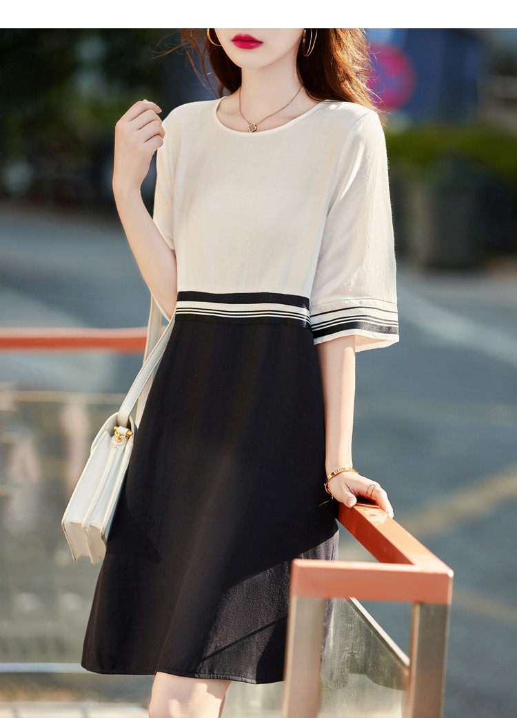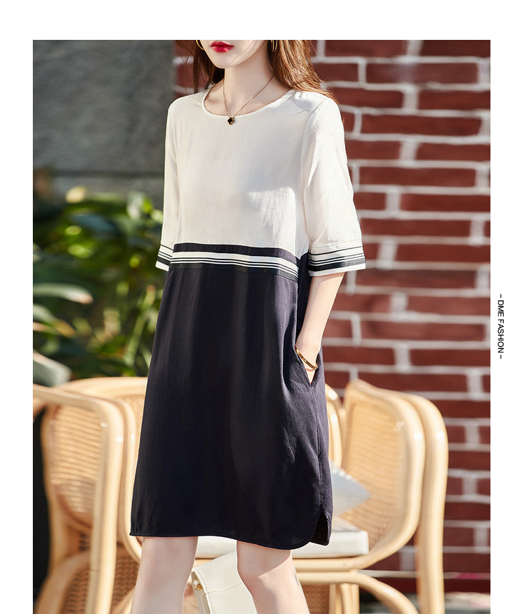【莱赛尔亚麻】夏季圆领宽松撞拼中袖裙子连衣裙女夏 594625