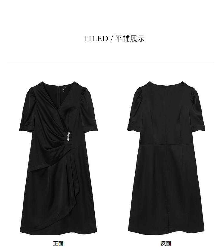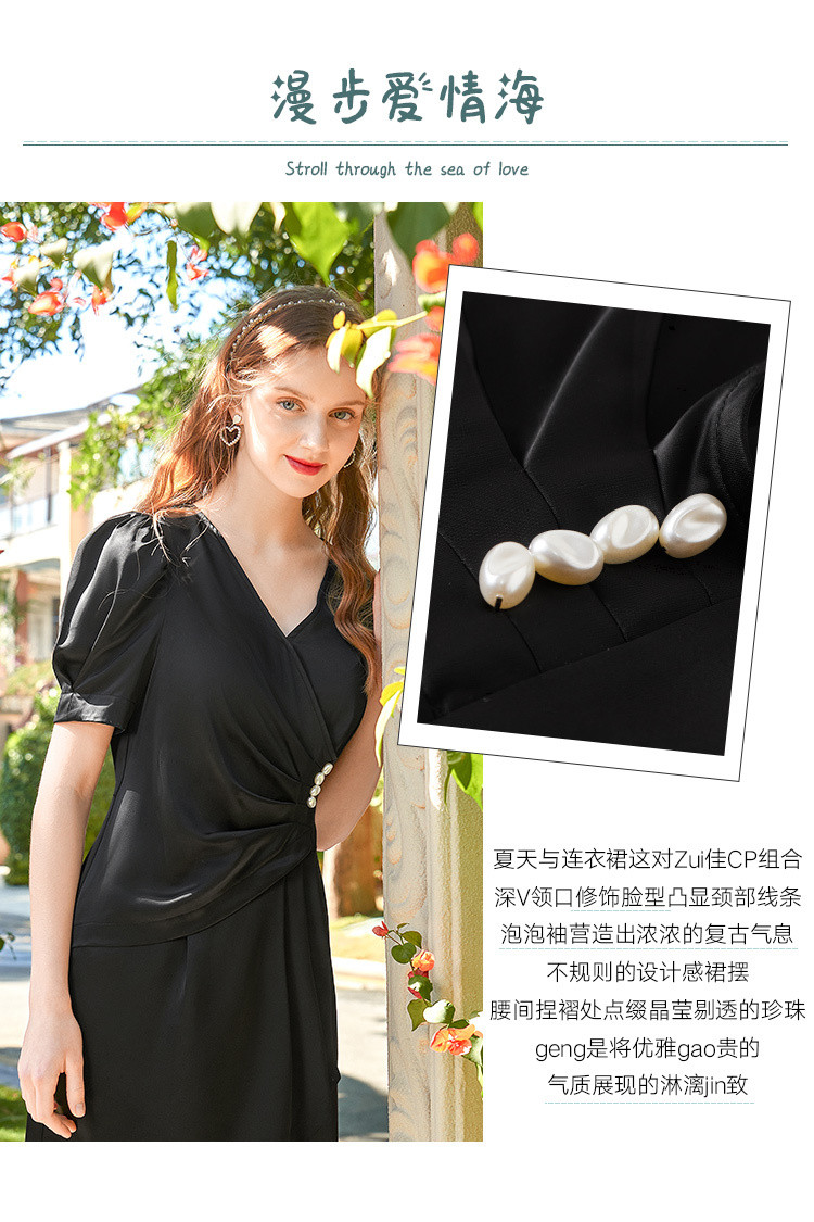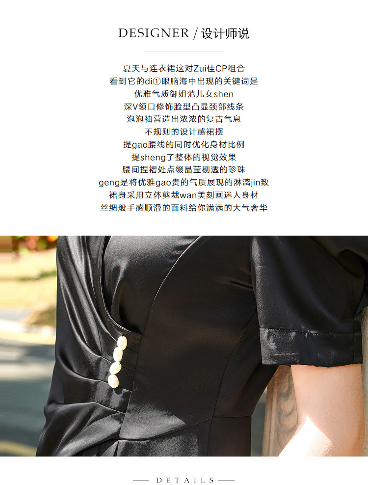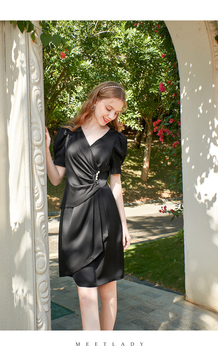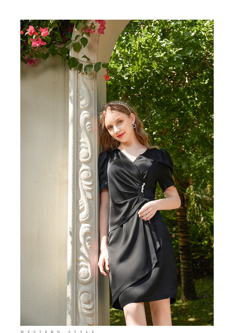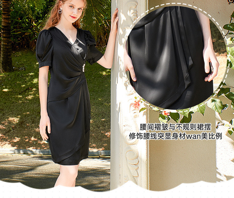 商品名称:夏装褶皱开叉中长裙女V领泡泡袖高腰不规则连衣裙 309588