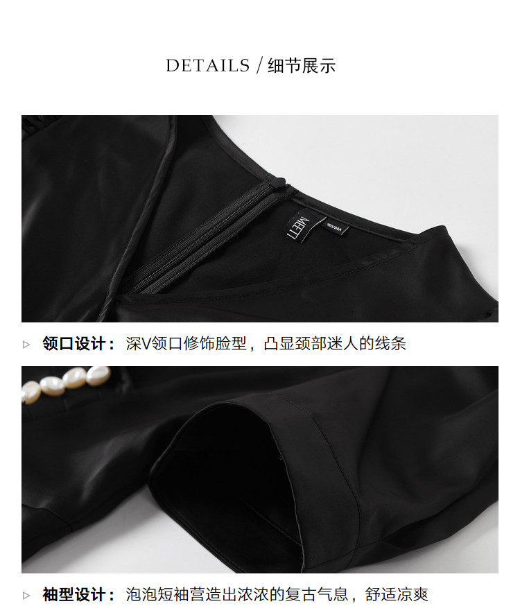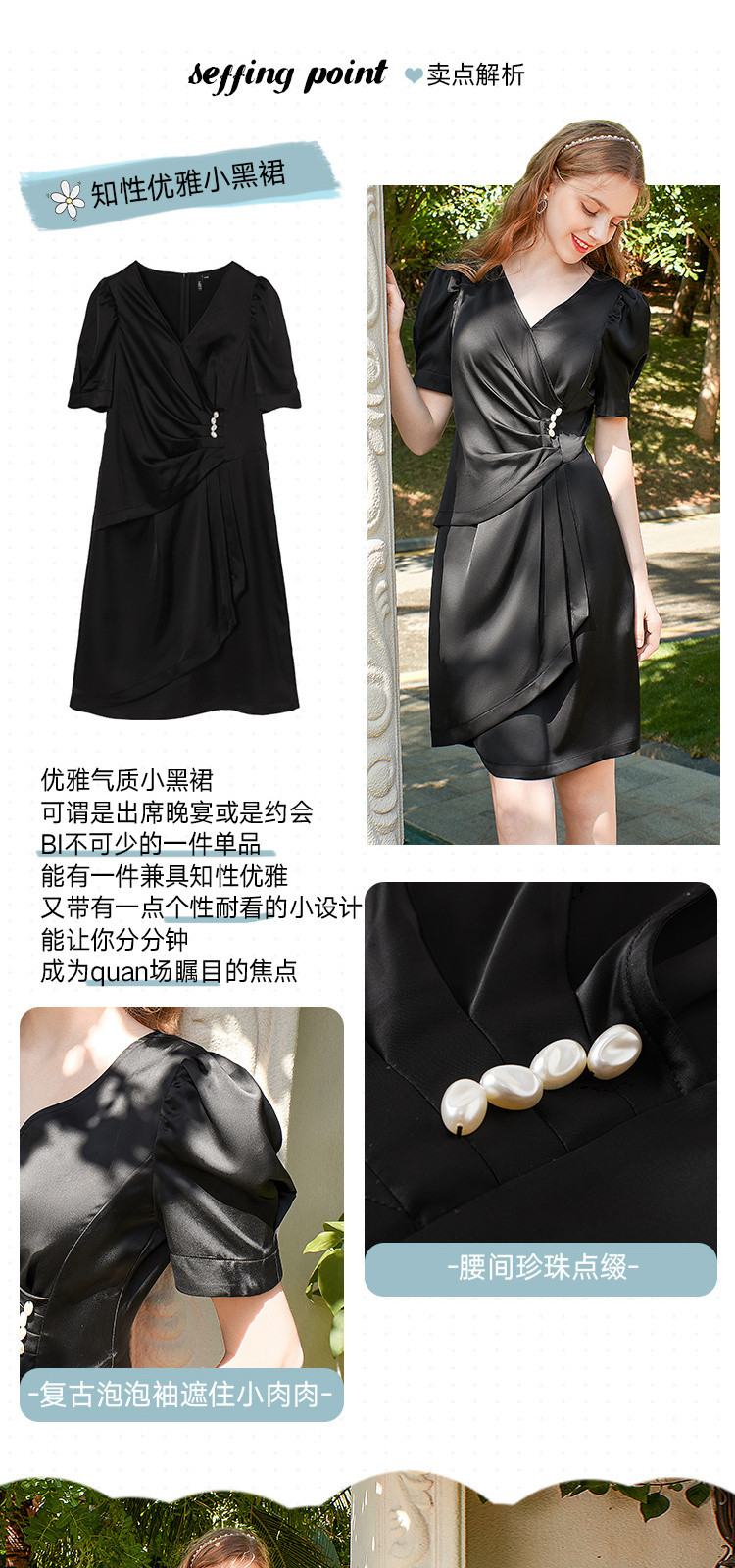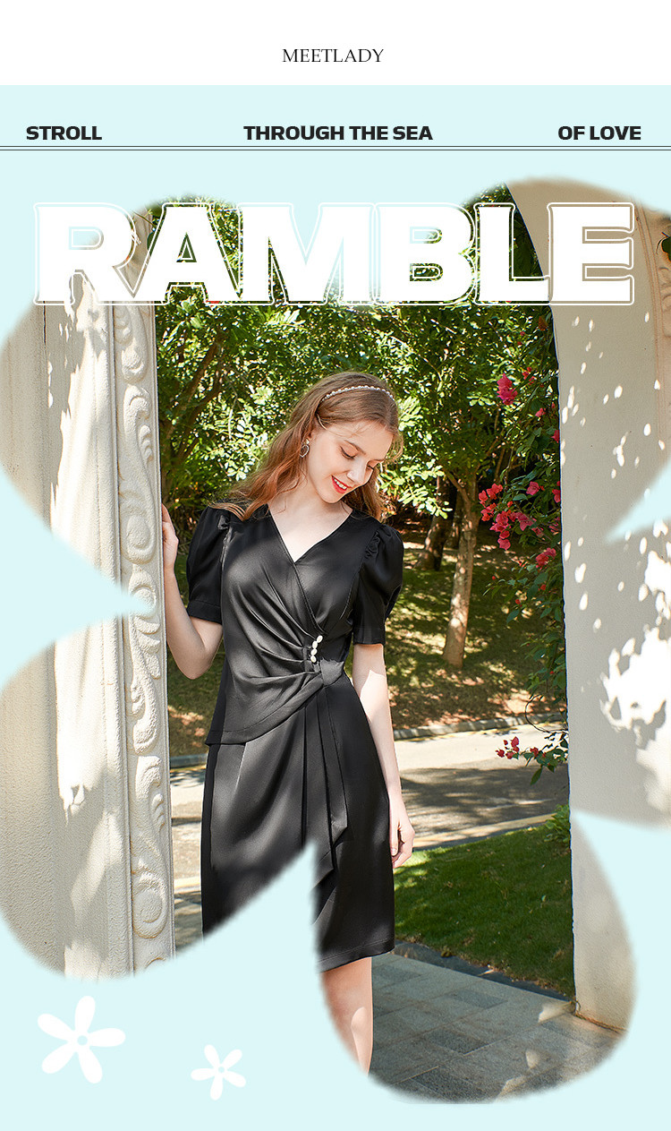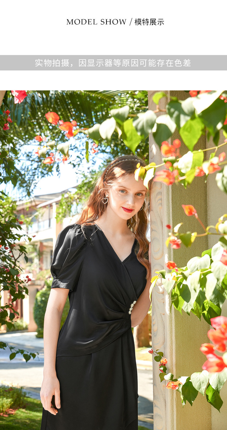 商品名称:夏装褶皱开叉中长裙女V领泡泡袖高腰不规则连衣裙 309588