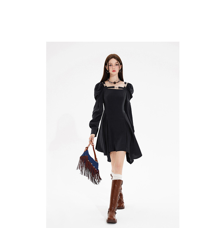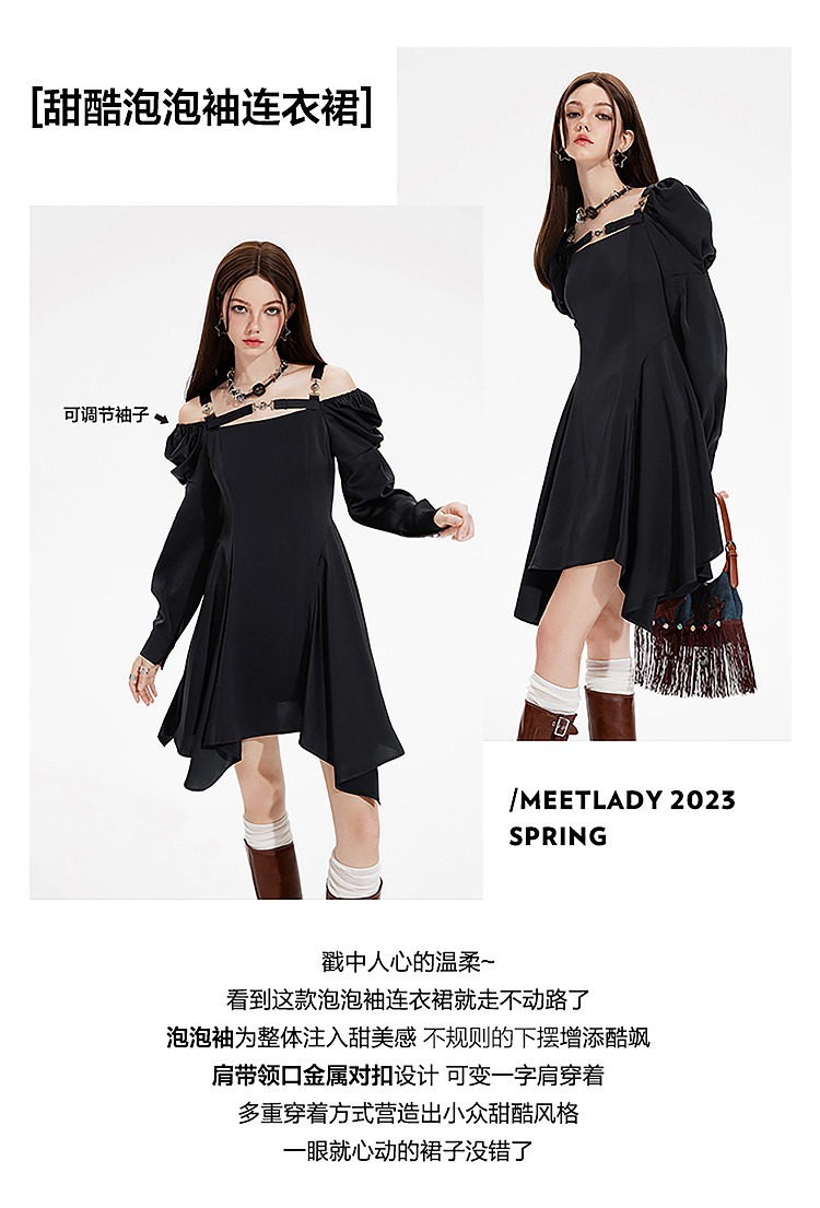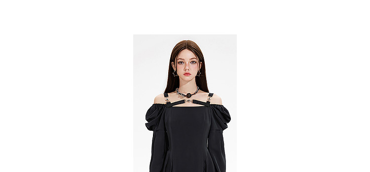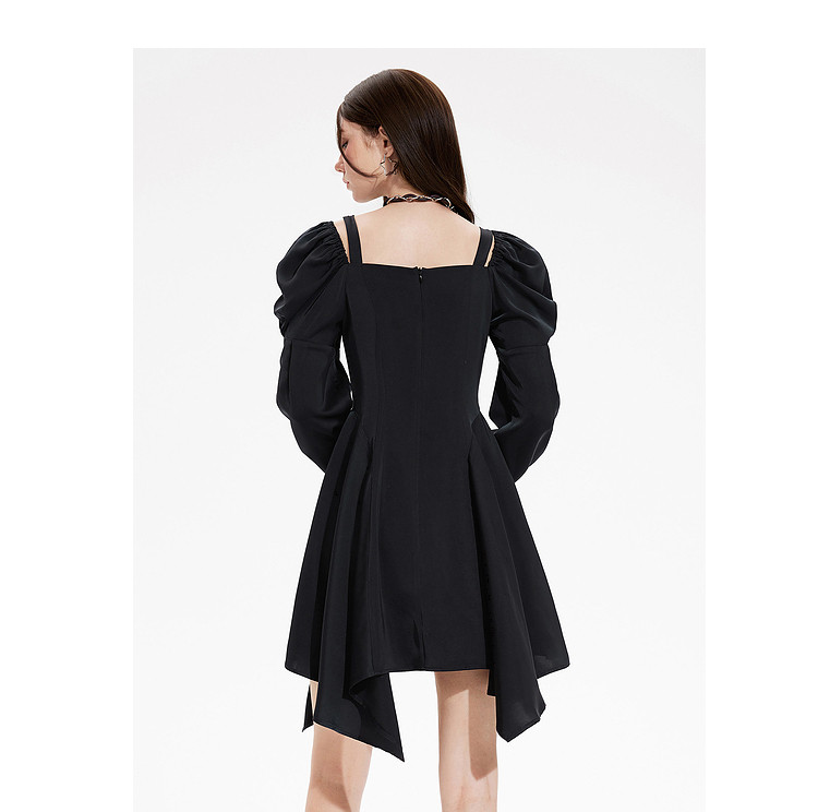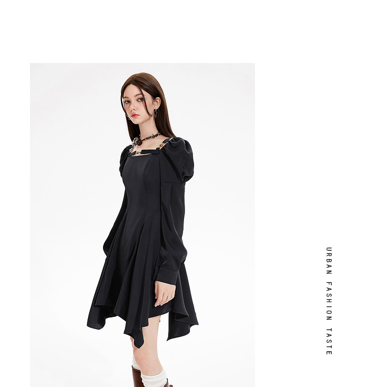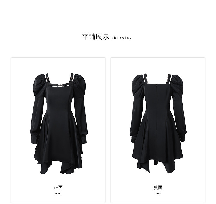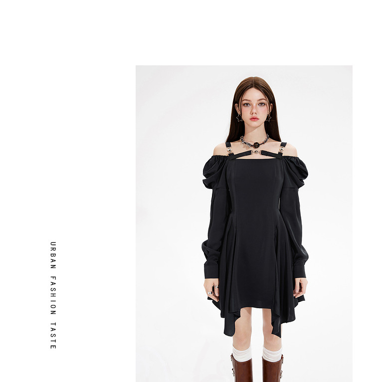 商品名称:春秋露肩黑色连衣裙女纯欲甜酷设计小众小黑裙 907412