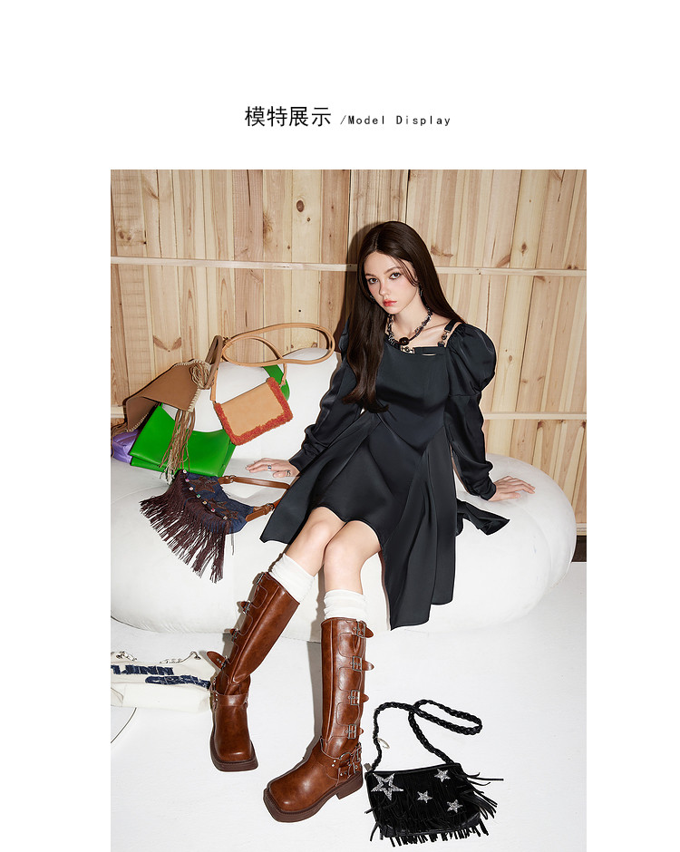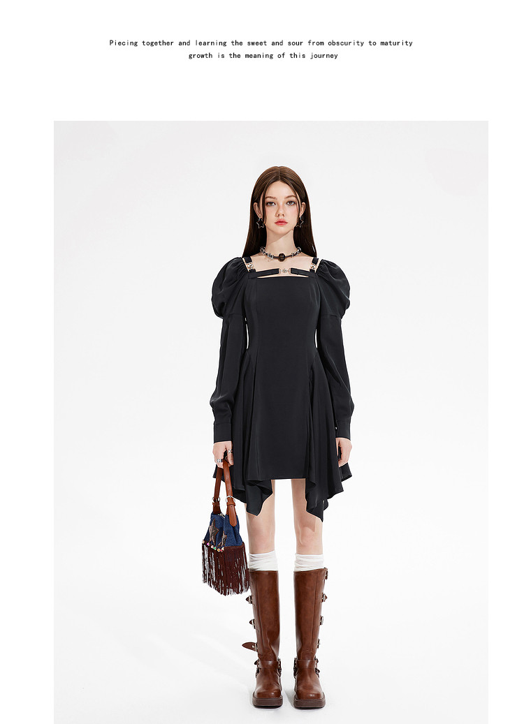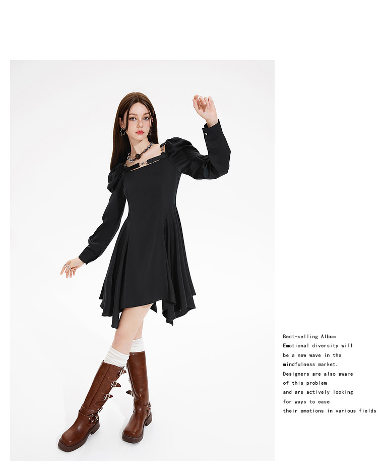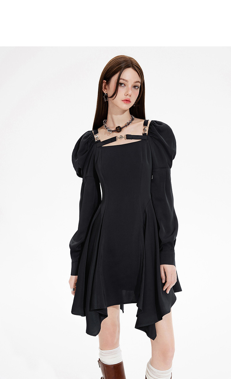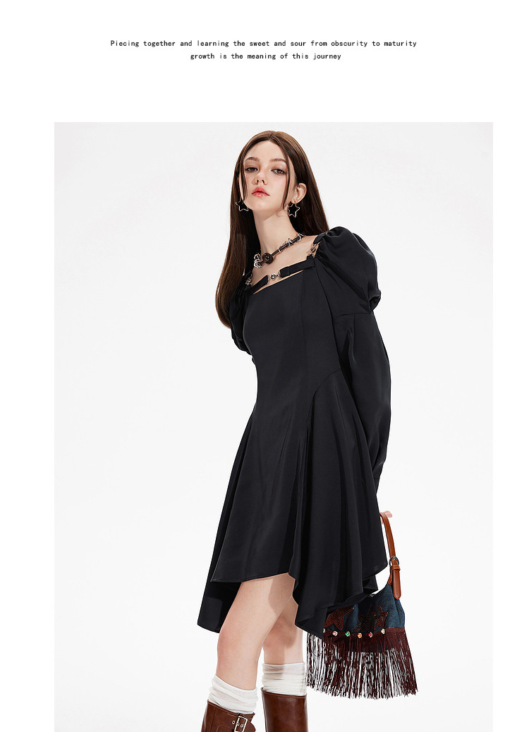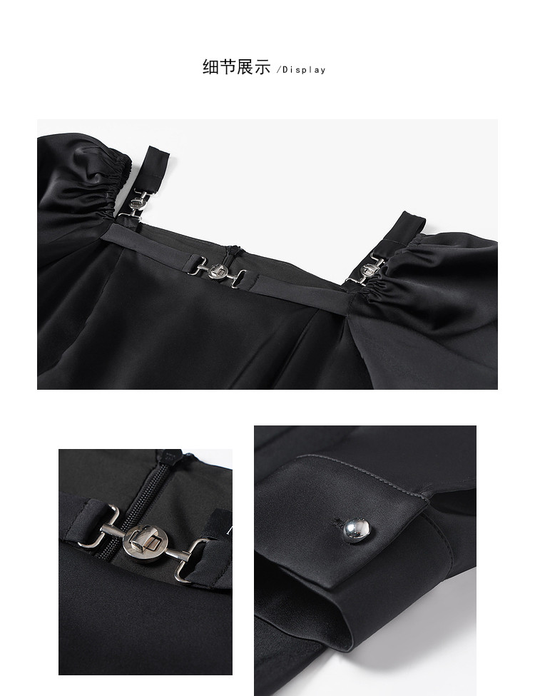 商品名称:春秋露肩黑色连衣裙女纯欲甜酷设计小众小黑裙 907412