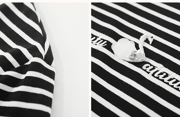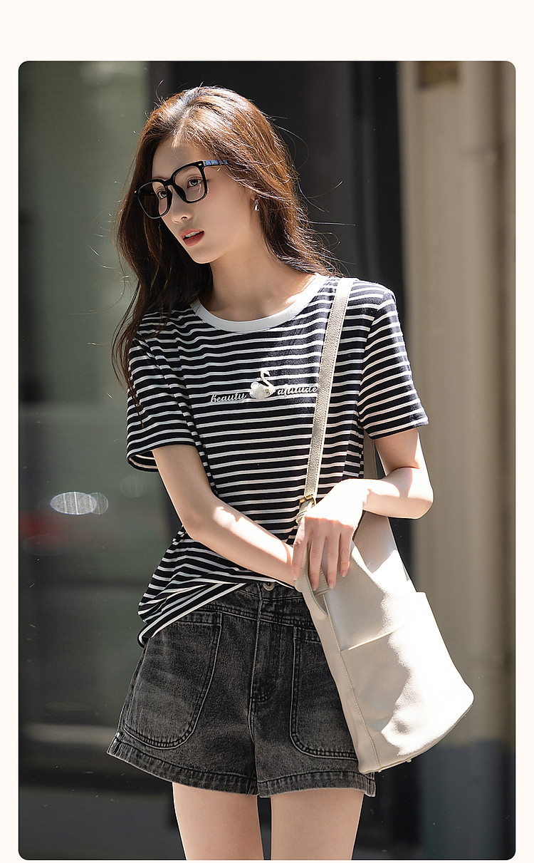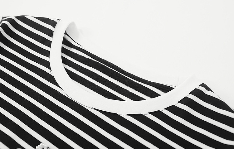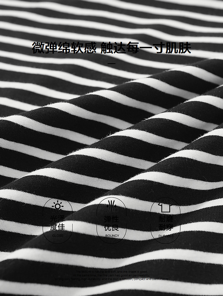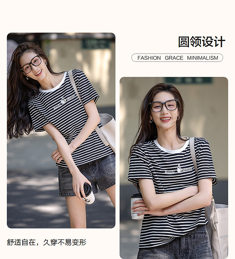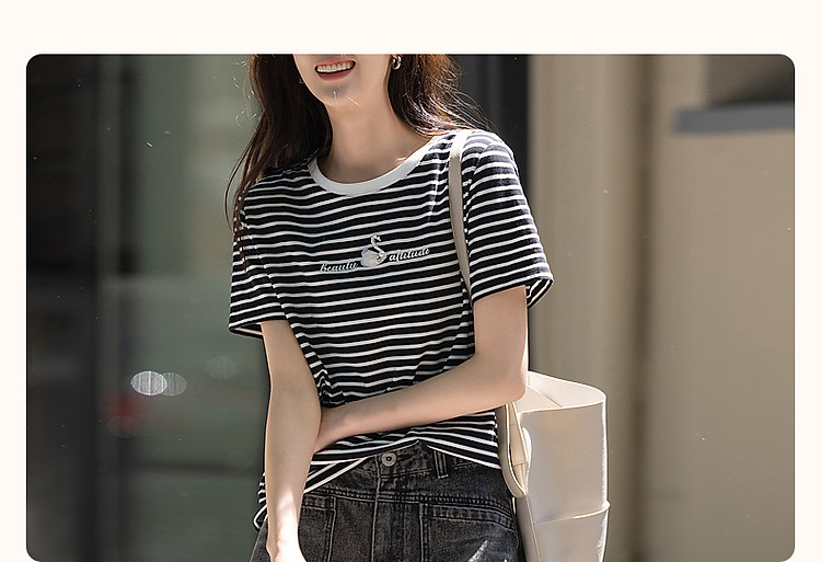 商品名称:【小天鹅棉氨字母印花T】春秋气质耐看撞色条纹圆领短袖女式t恤 051073