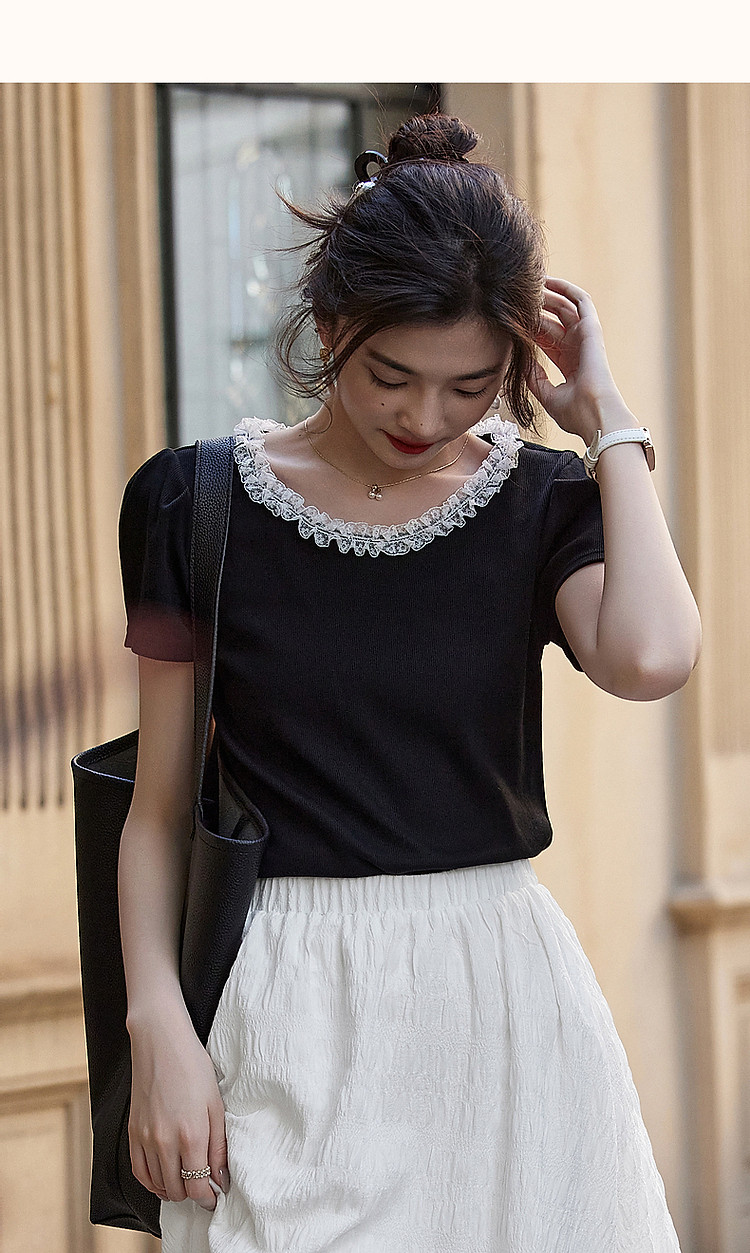 【口碑云朵T】夏轻熟风甜美圆领蕾丝泡泡袖短袖显瘦短款女式t恤 727489