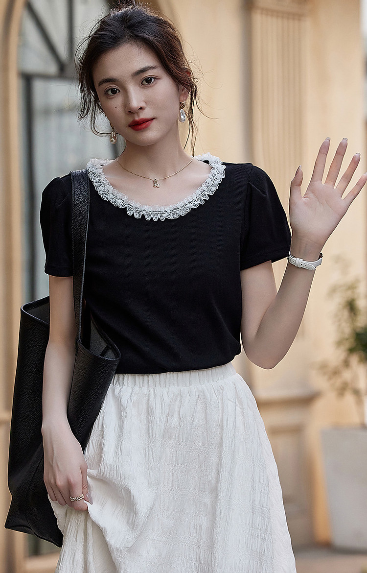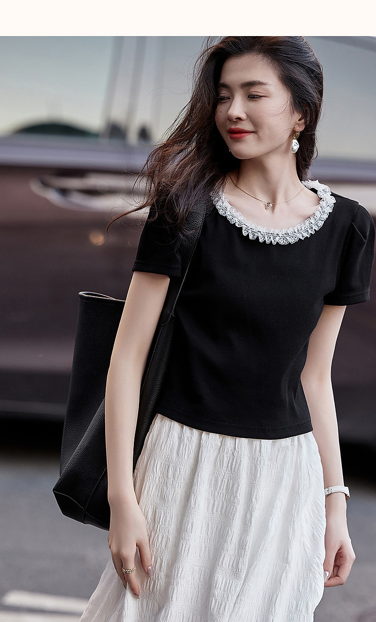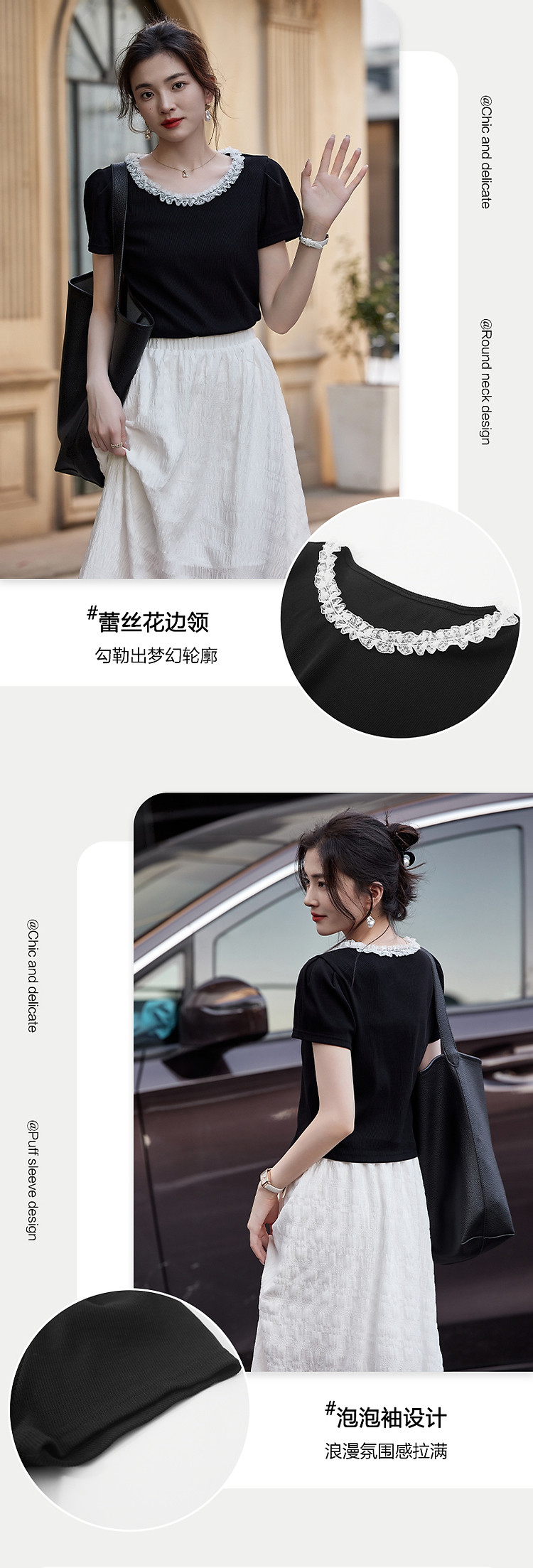 商品名称:【口碑云朵T】夏轻熟风甜美圆领蕾丝泡泡袖短袖显瘦短款女式t恤 727489