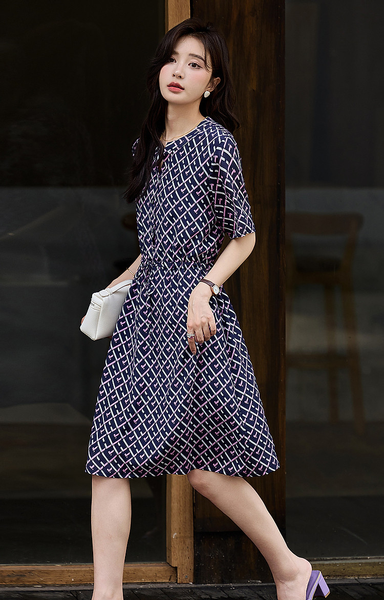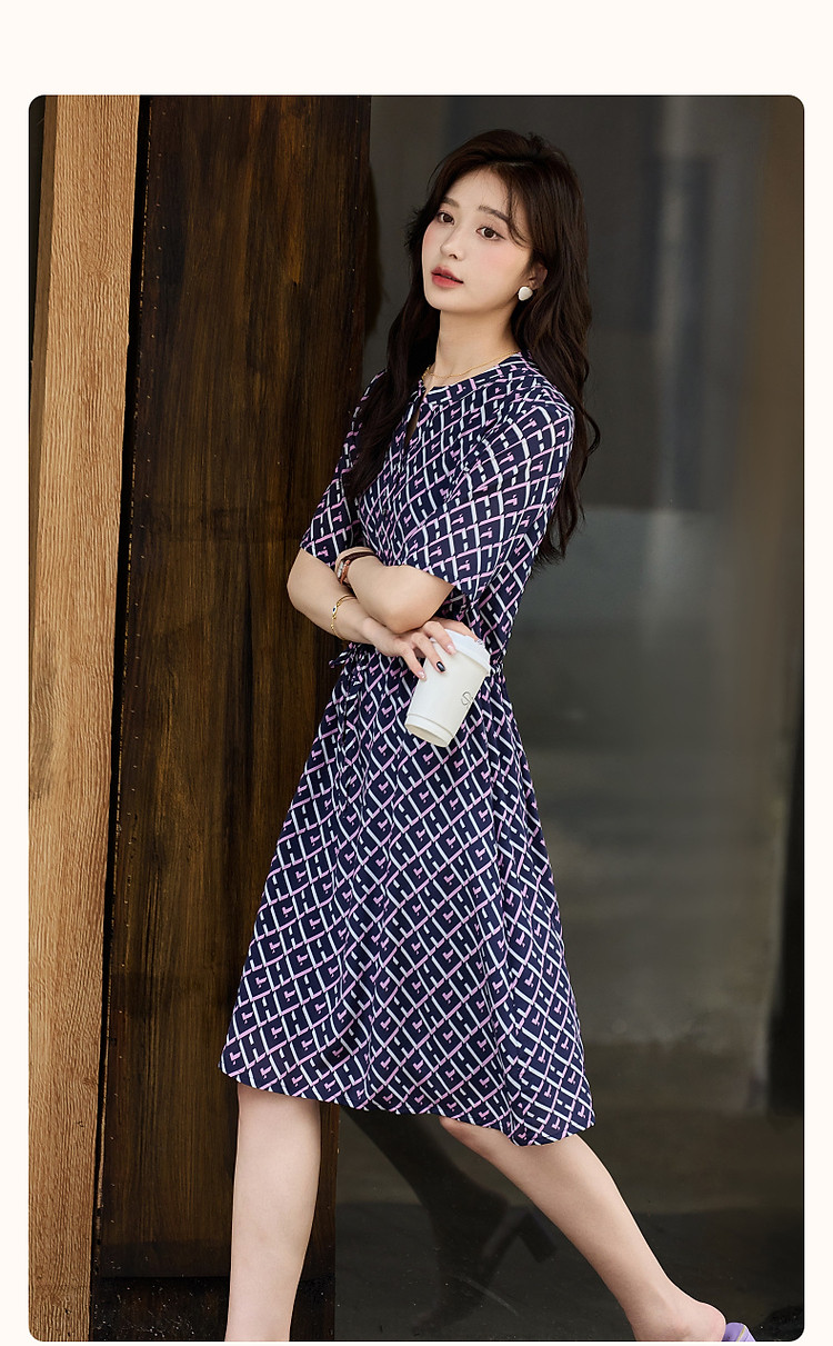 【花样年华】夏轻奢通勤V领格纹直筒抽绳桑蚕丝连衣裙女 805313