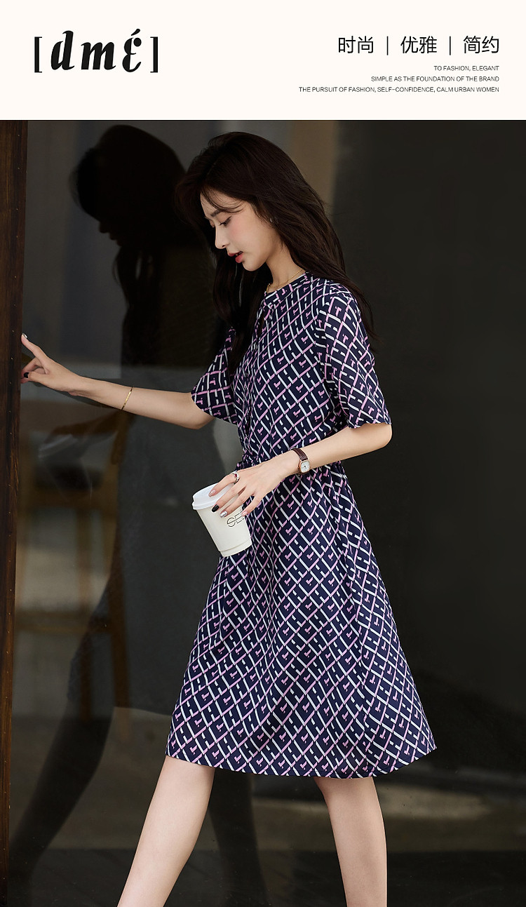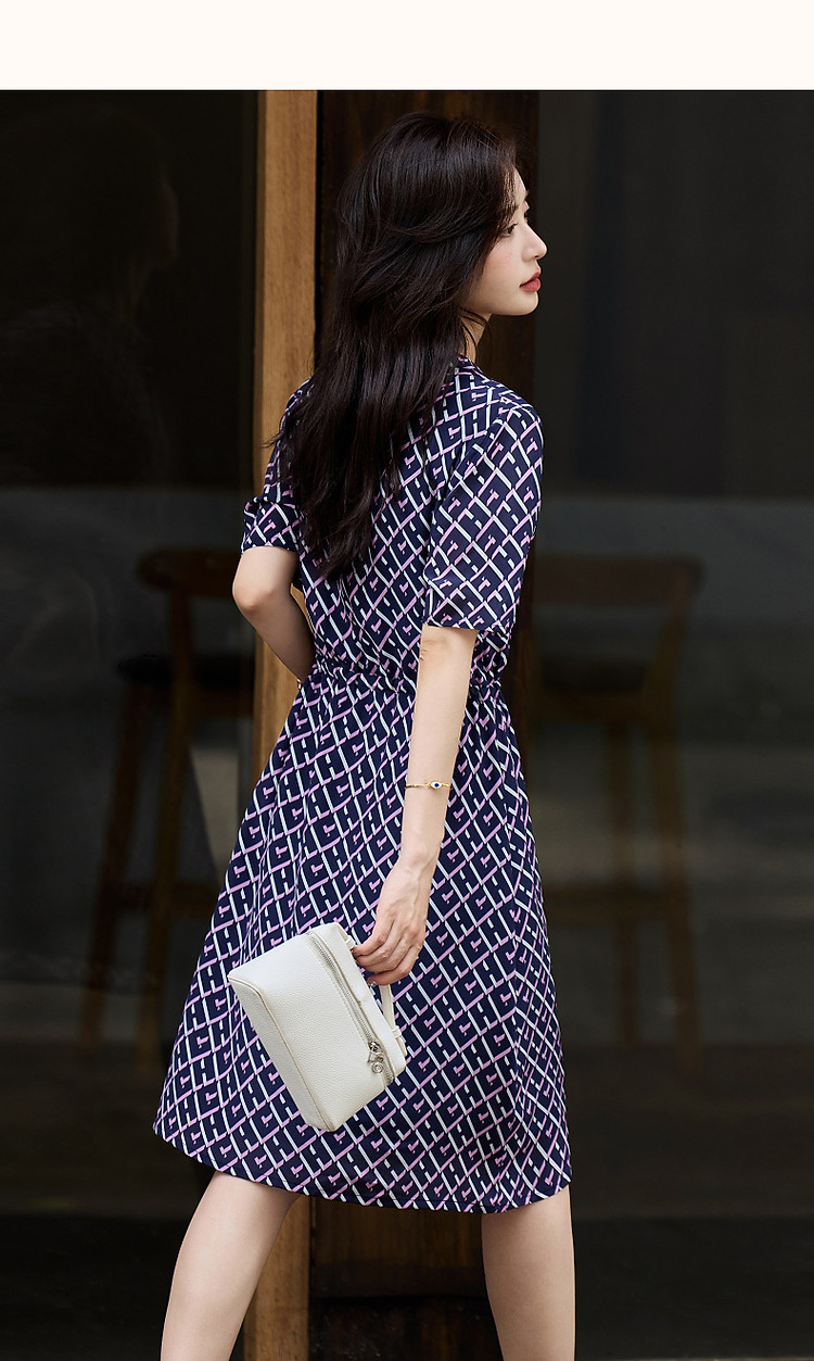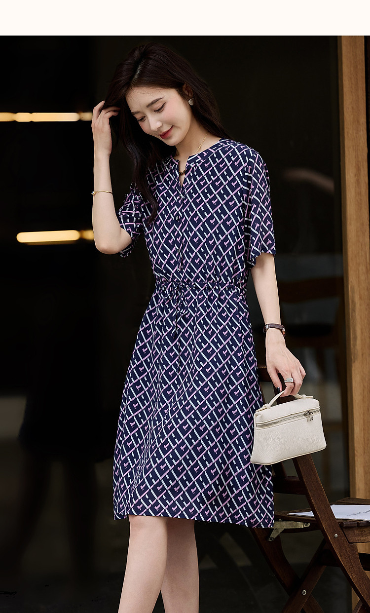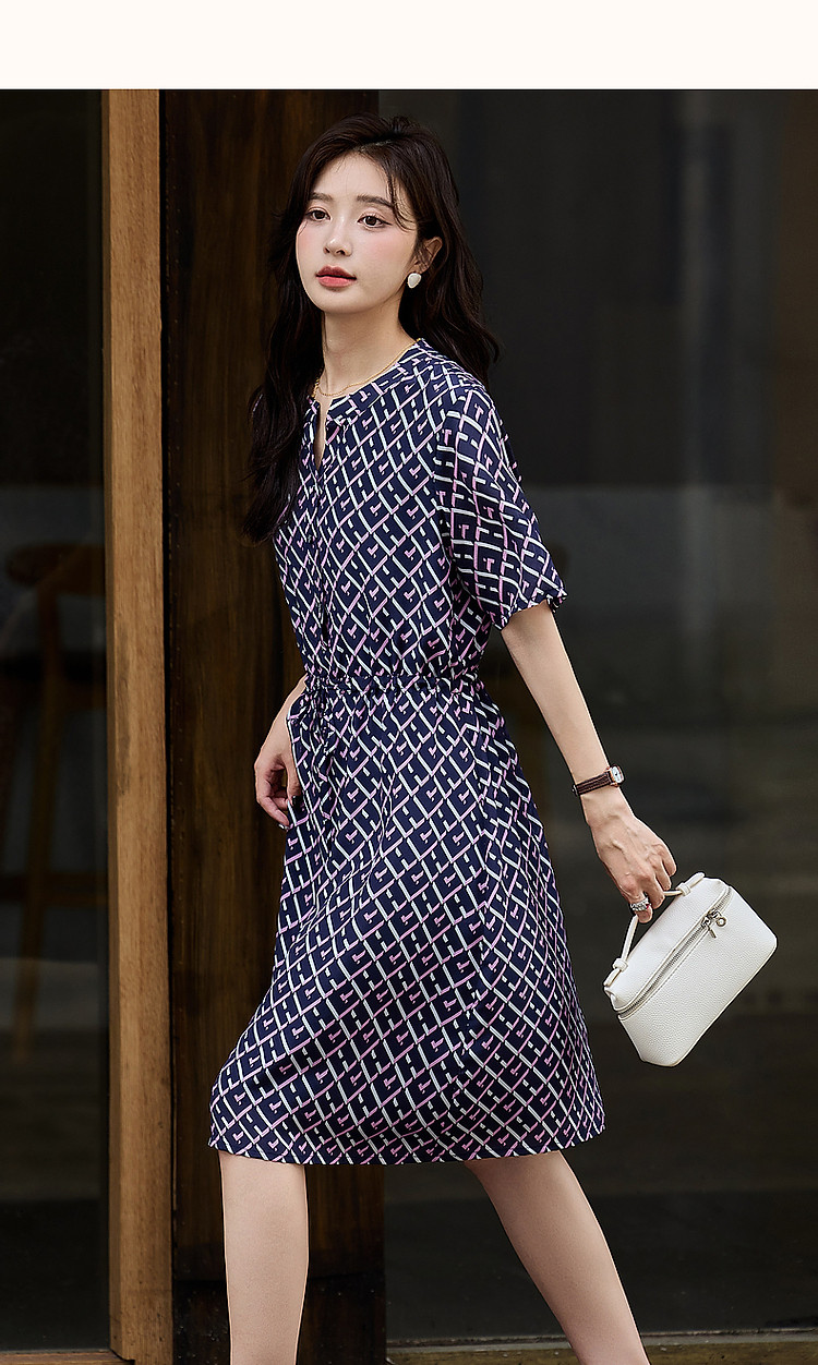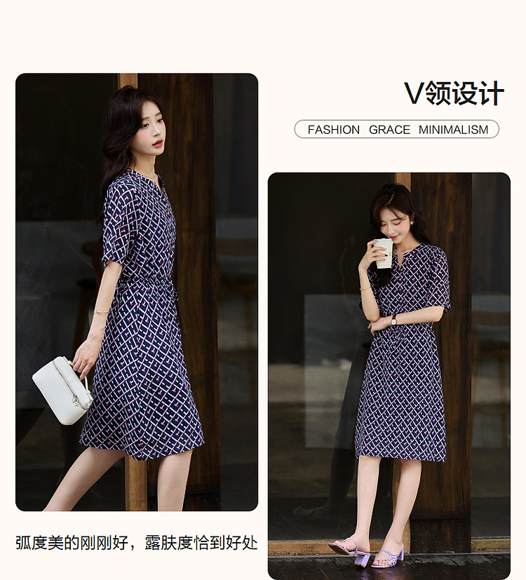 商品名称:【花样年华】夏轻奢通勤V领格纹直筒抽绳桑蚕丝连衣裙女 805313