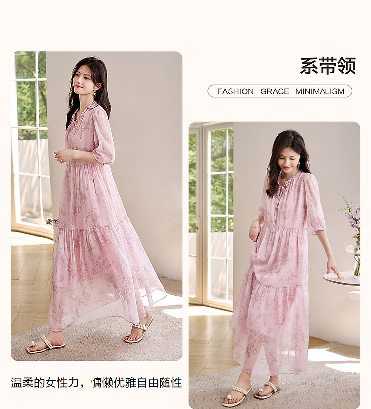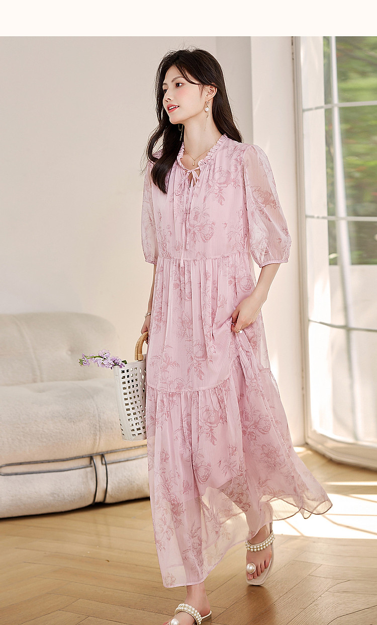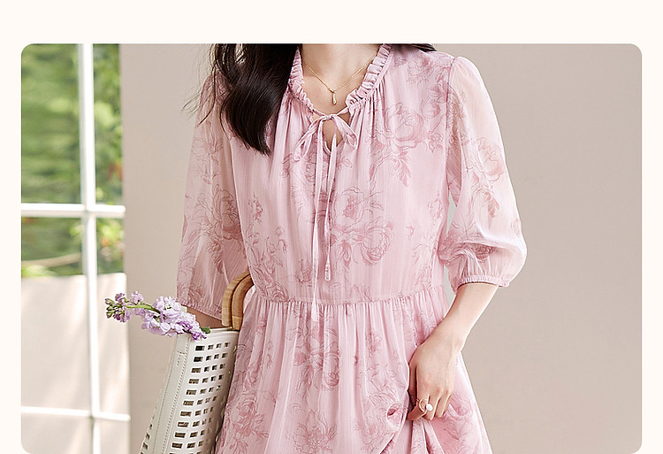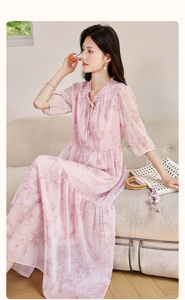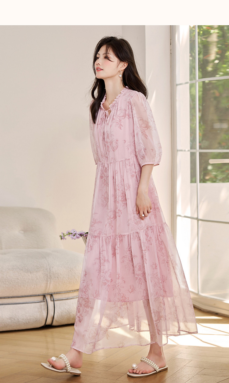 商品名称:【似罗绮飘香】夏国风新中式度假淑女系带领雪纺印花七分袖连衣裙 633281
