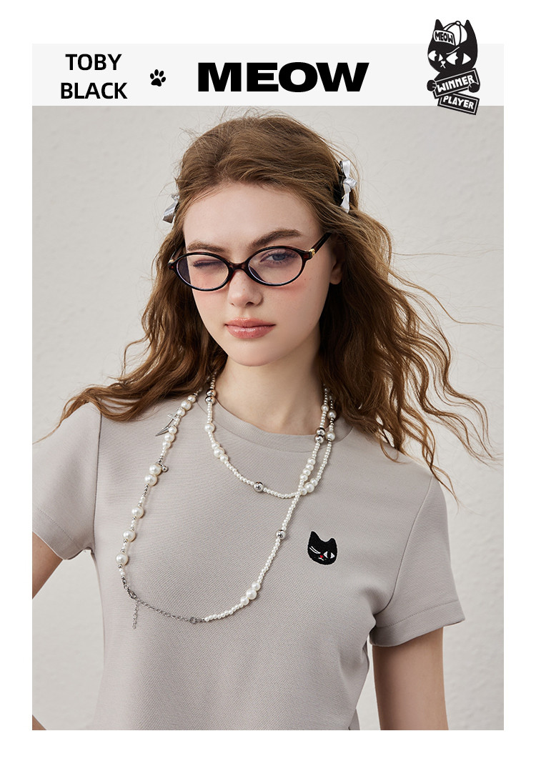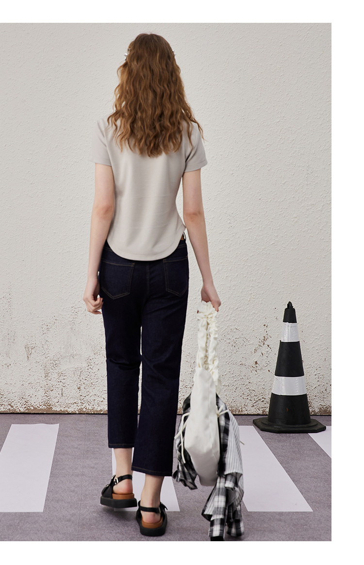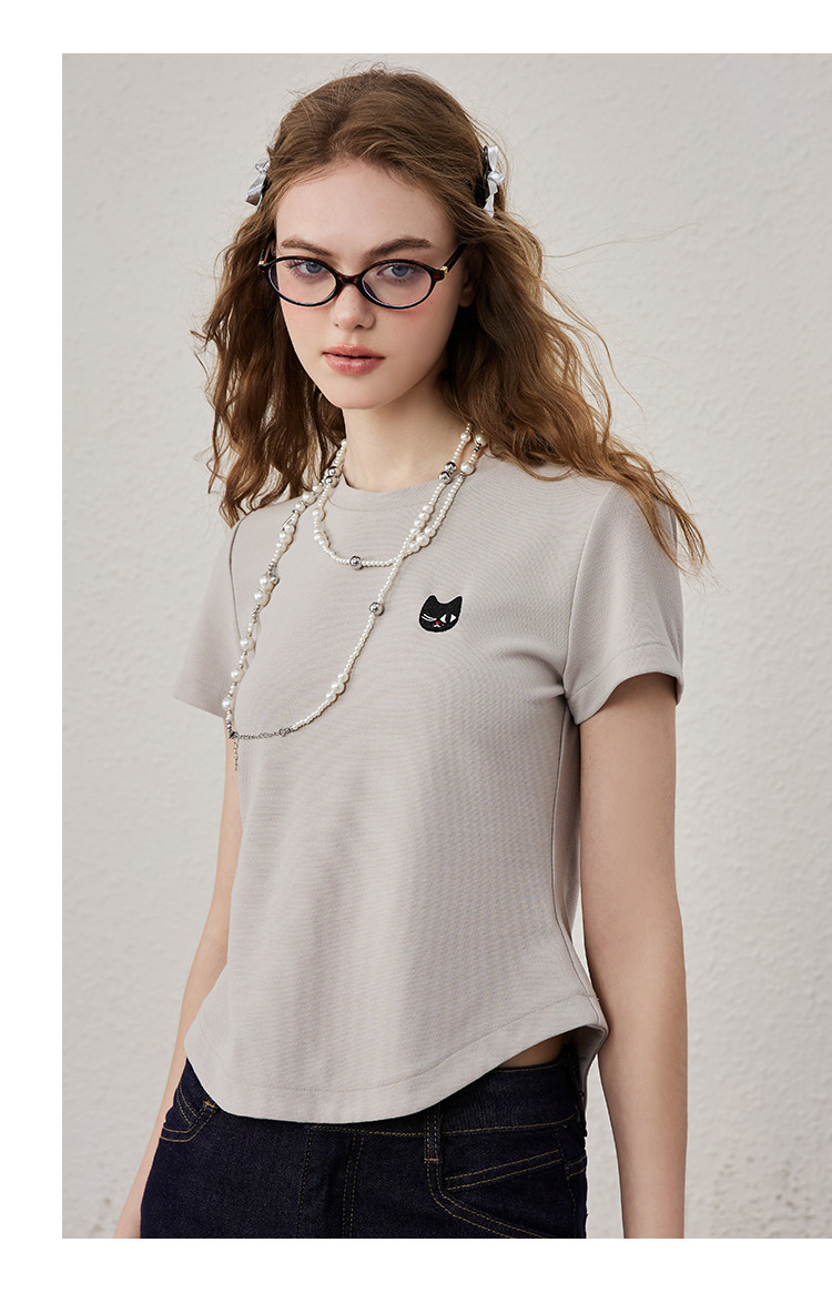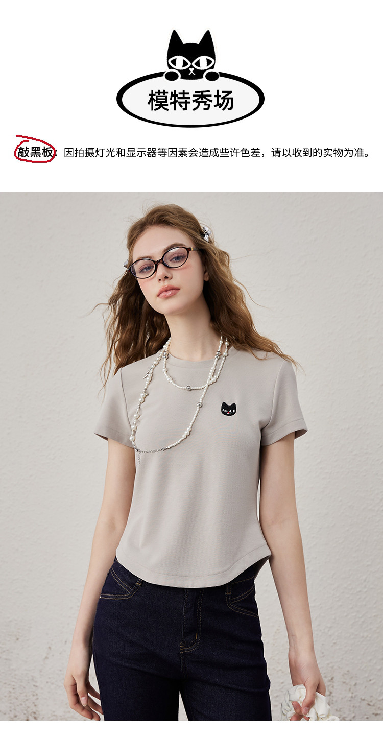 显瘦修身百搭遮胯女式T恤夏季正肩简约刺绣休闲短袖上衣 087901