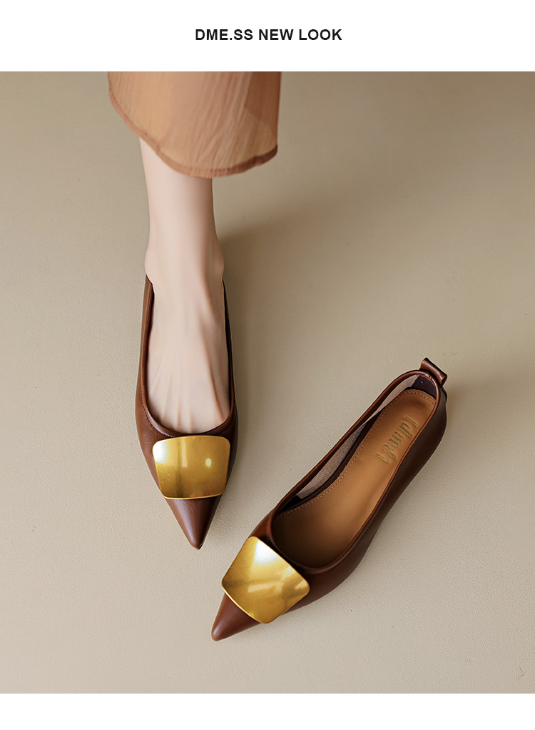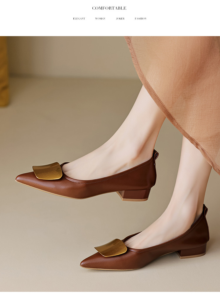 春季时尚简约百搭纯色金属方扣尖头方跟女单鞋 956097