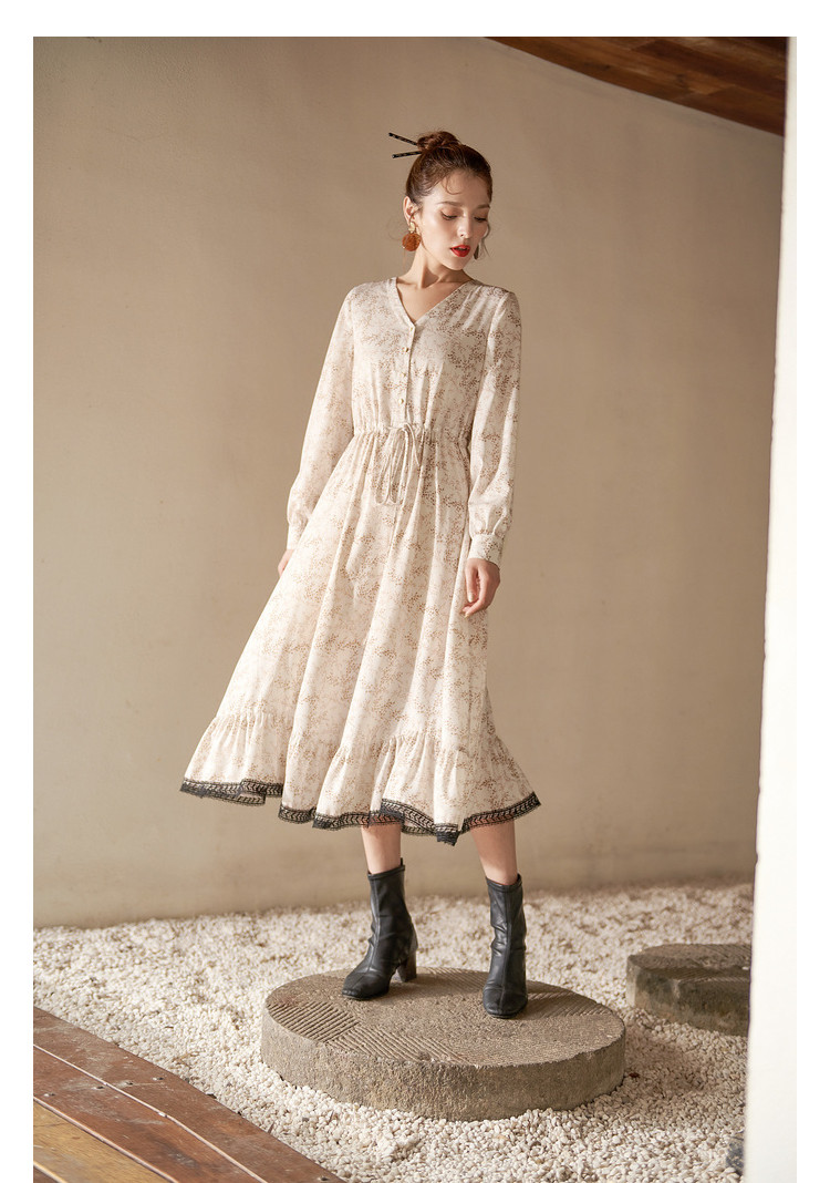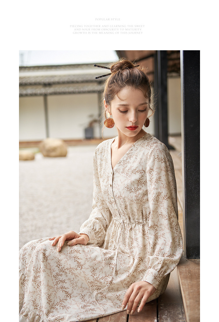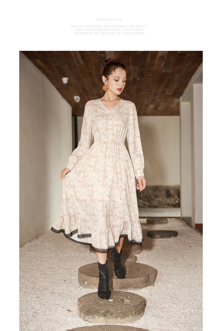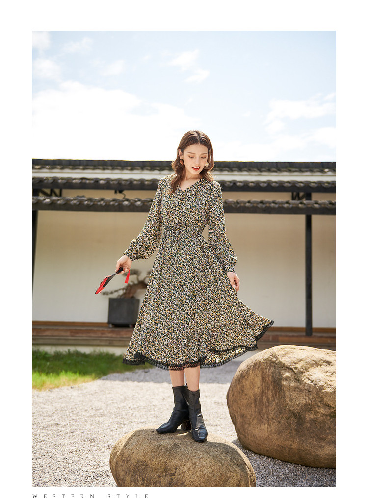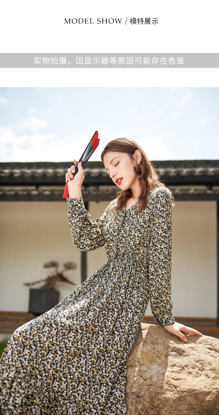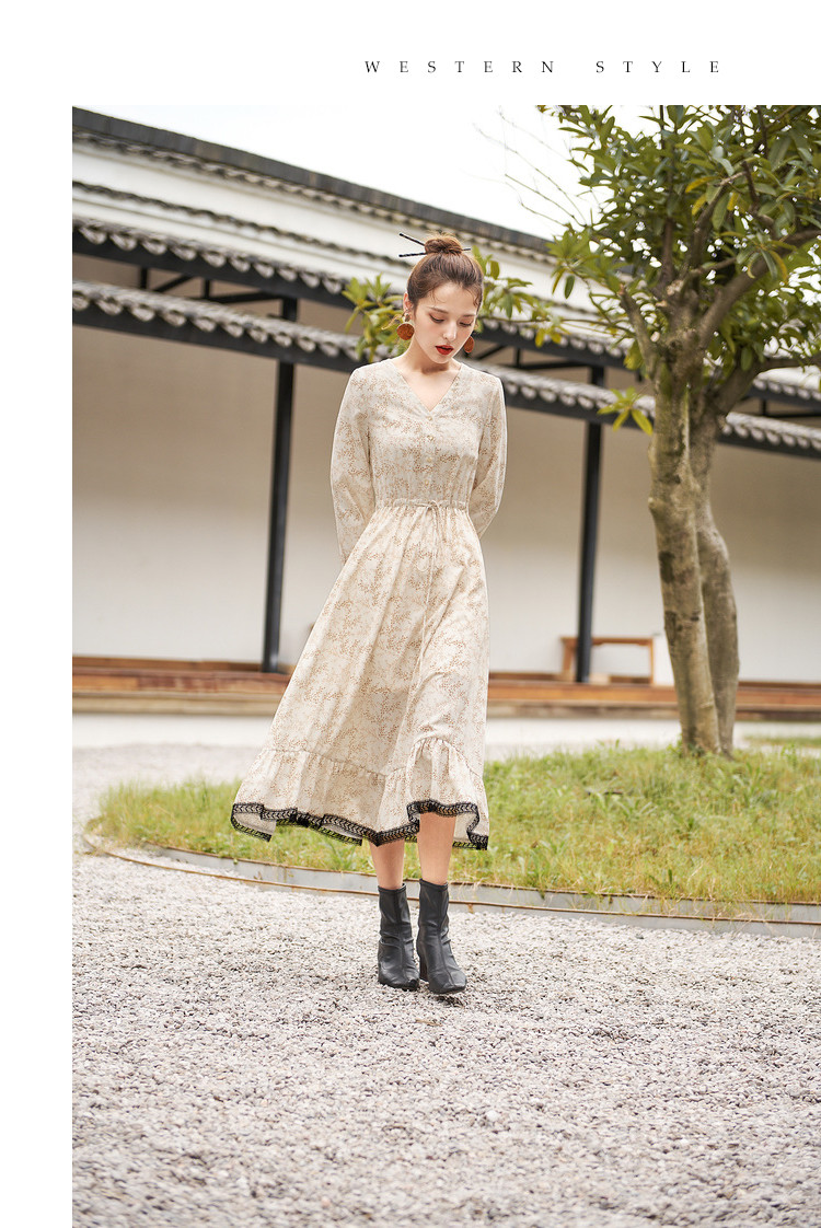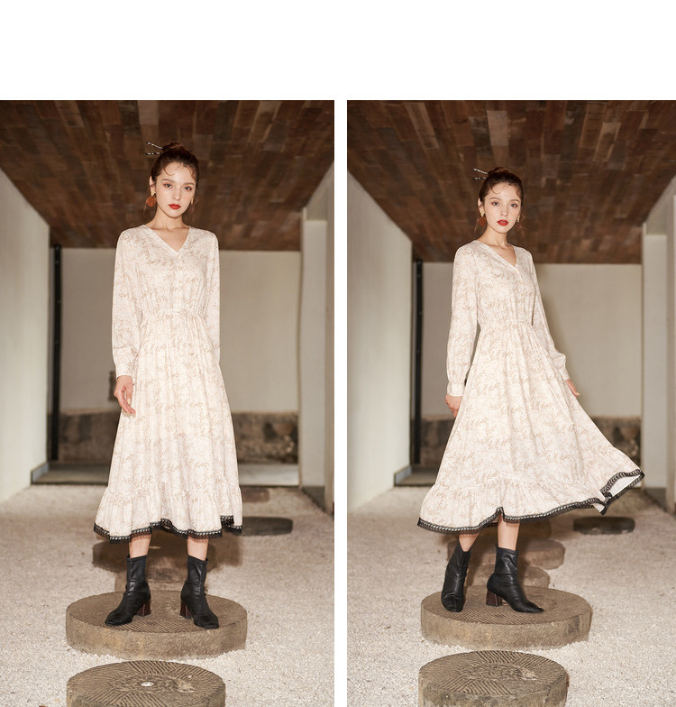 商品名称:【寻迹东方】秋装长袖高腰连衣裙女V领气质中长款裙子 103060