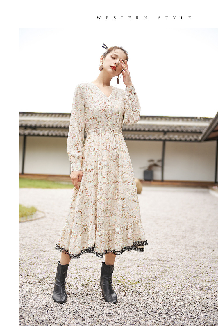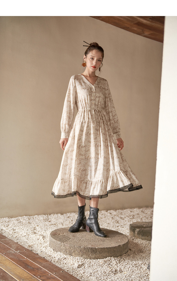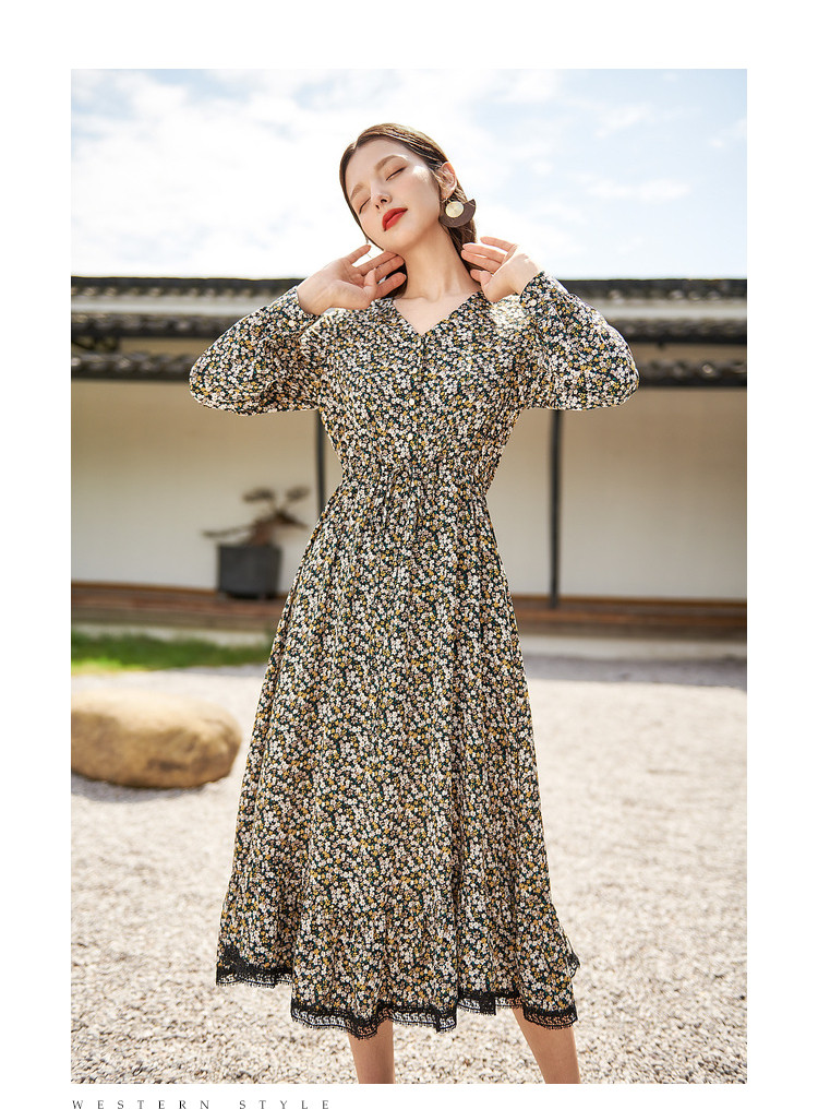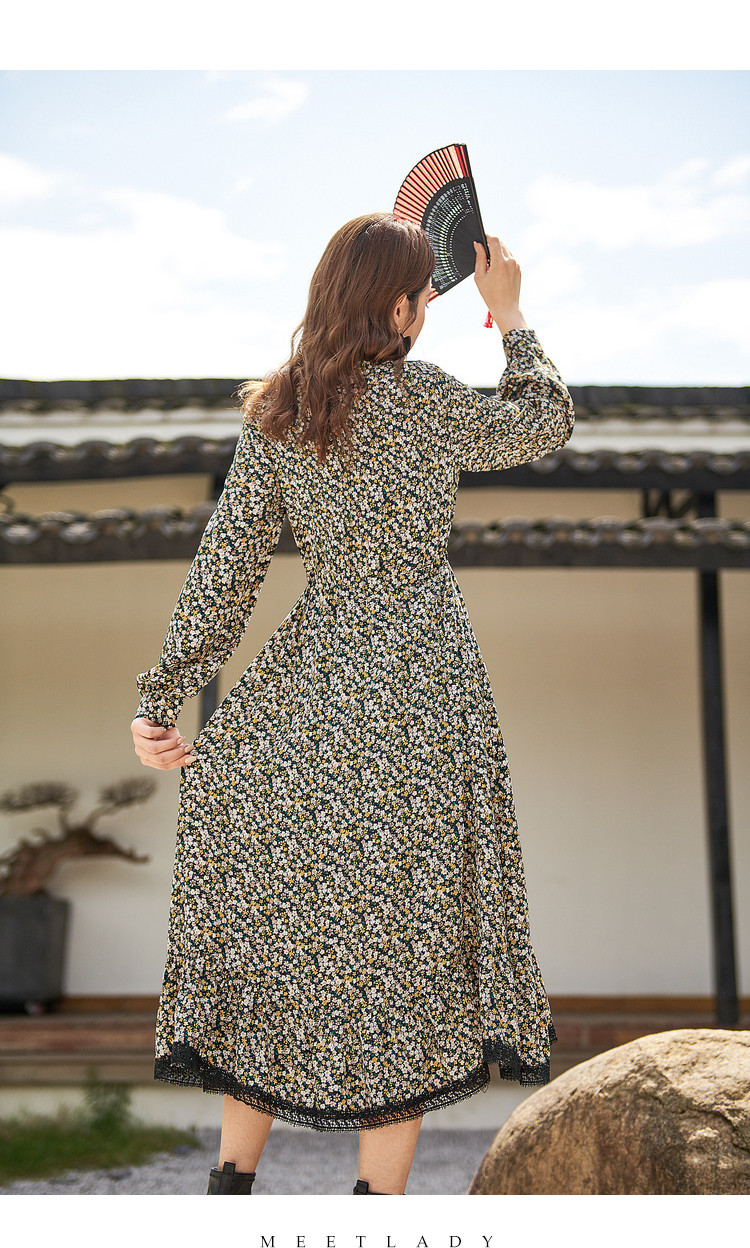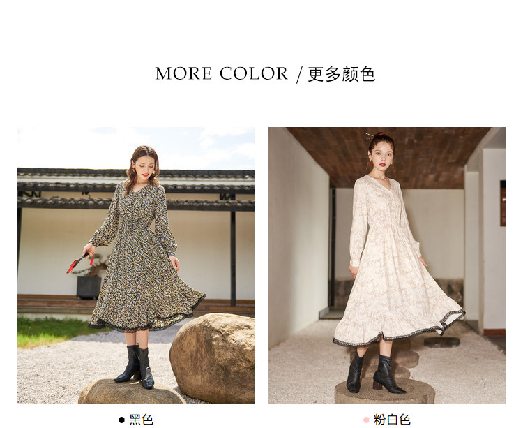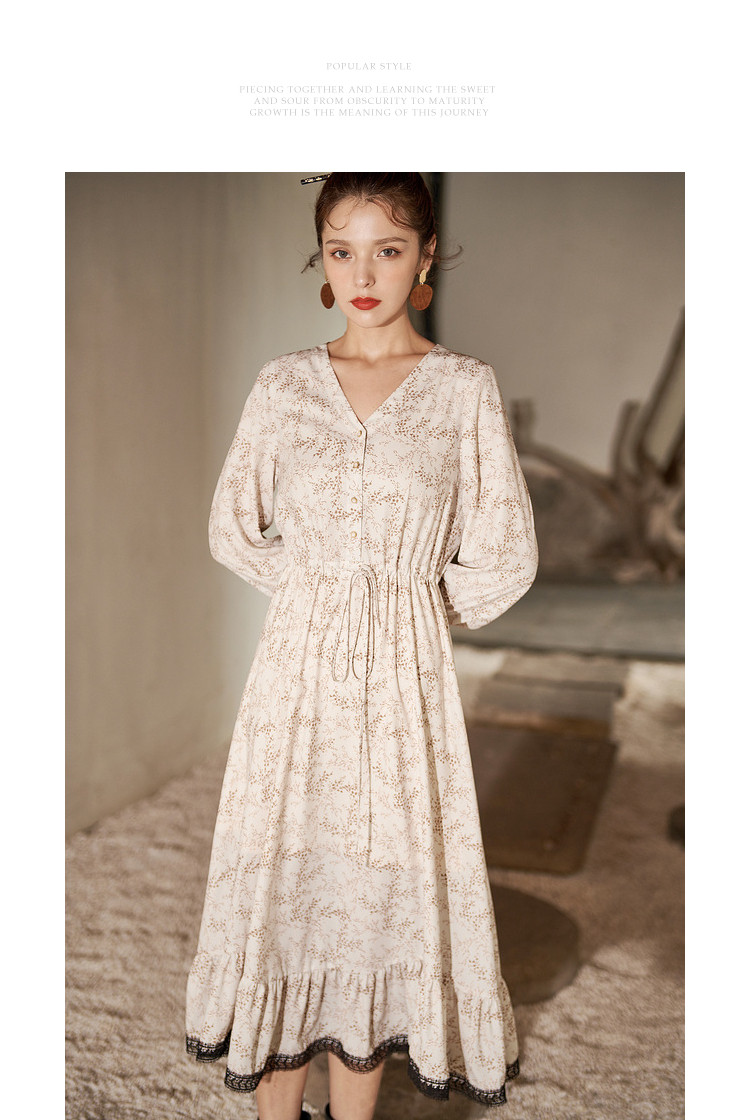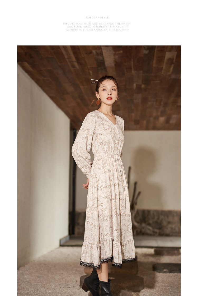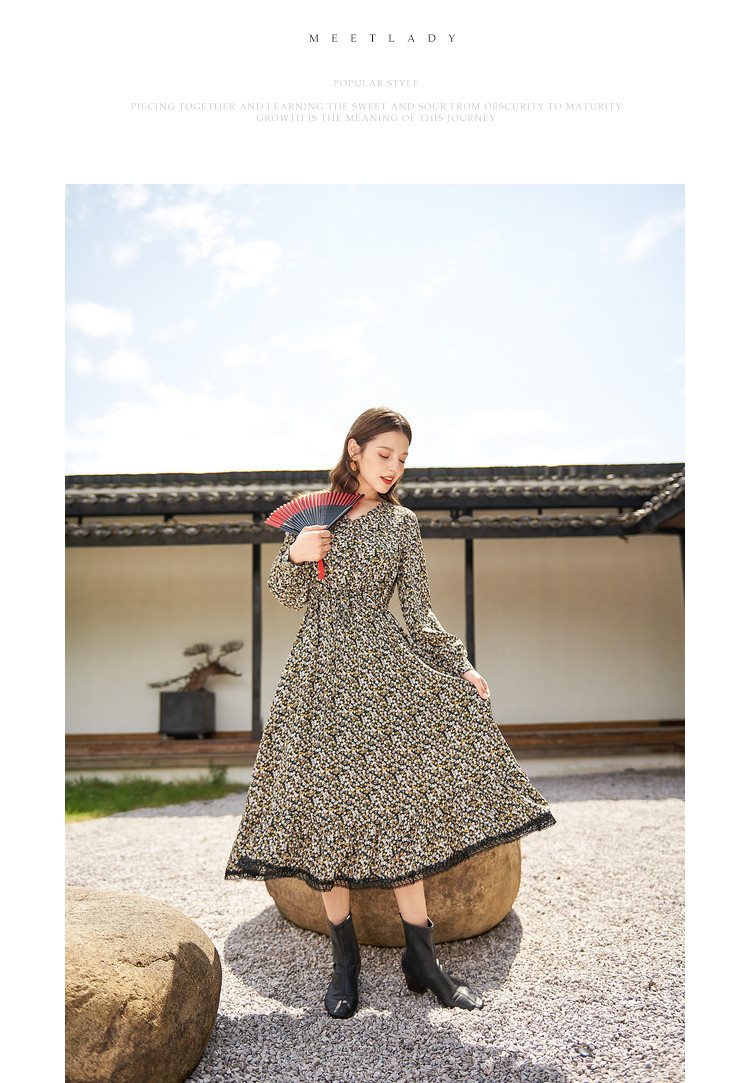 商品名称:【寻迹东方】秋装长袖高腰连衣裙女V领气质中长款裙子 103060