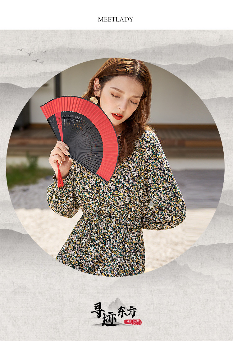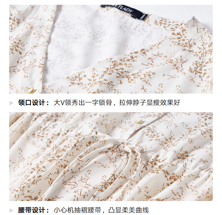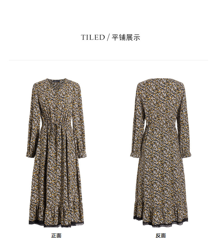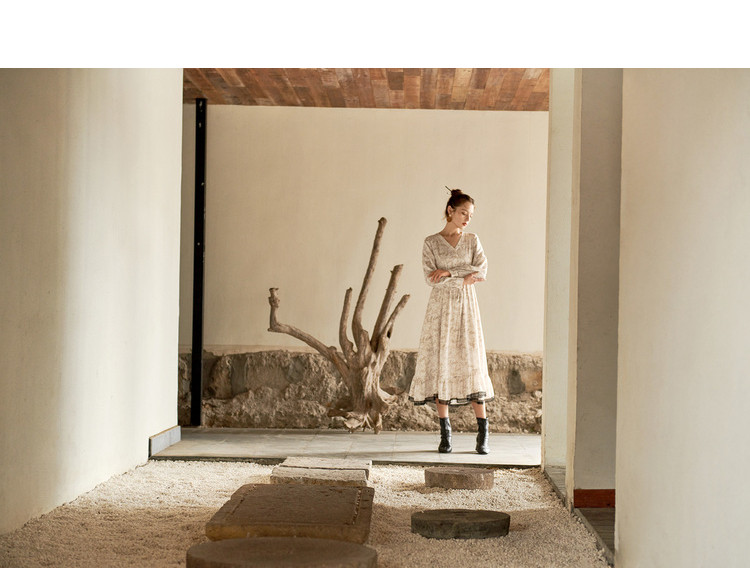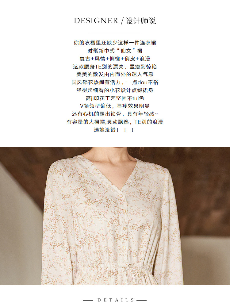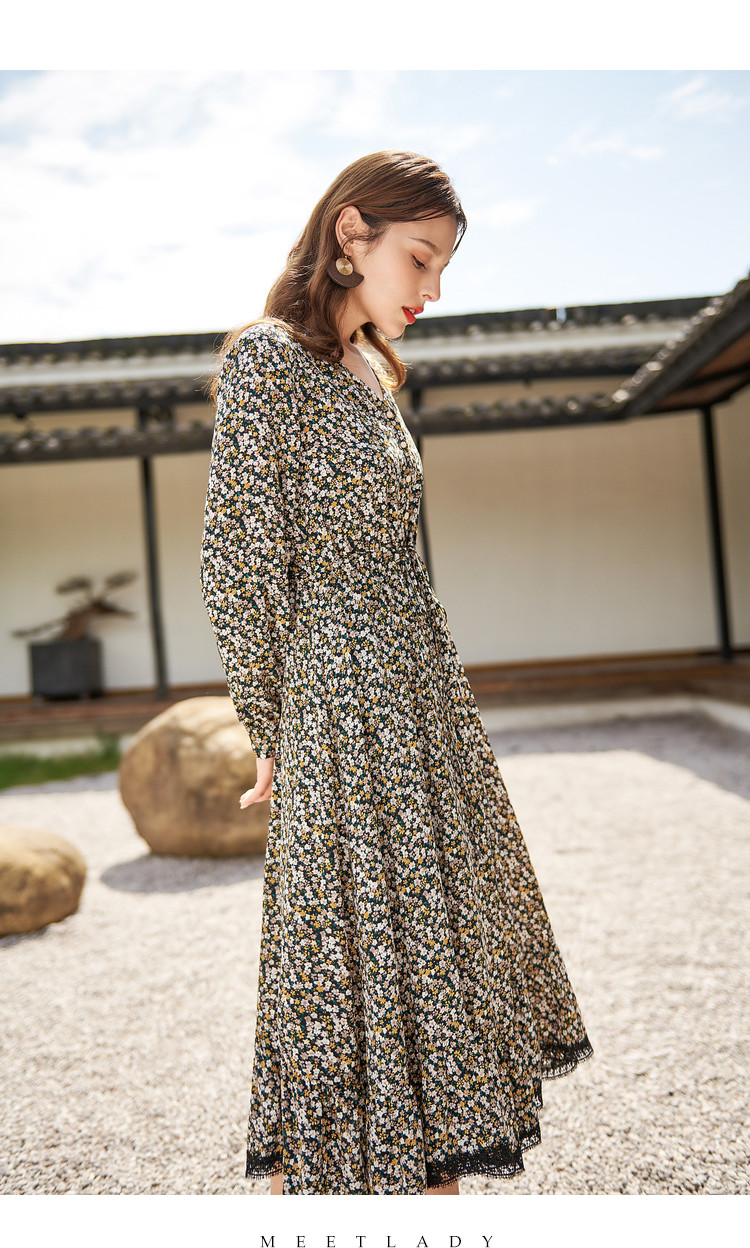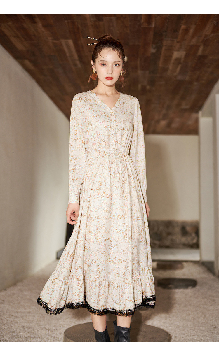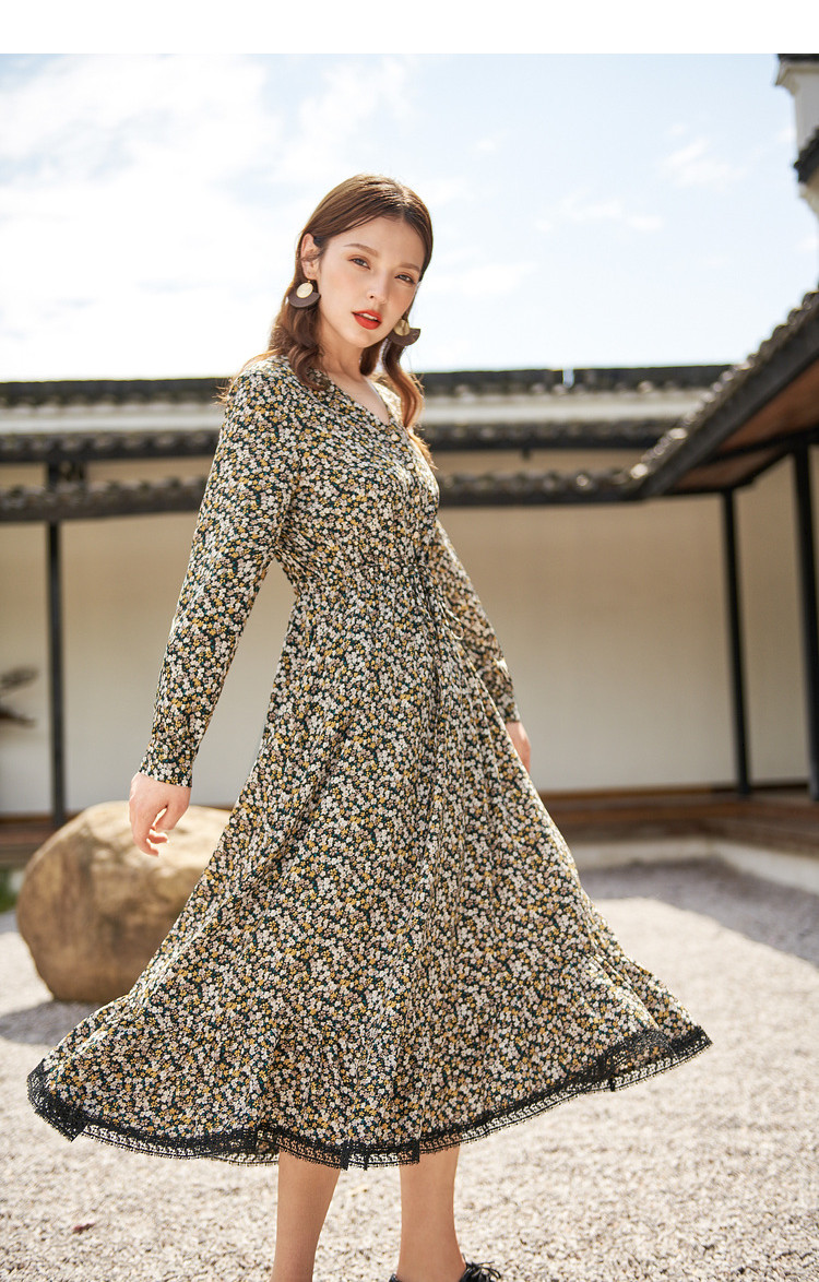 商品名称:【寻迹东方】秋装长袖高腰连衣裙女V领气质中长款裙子 103060