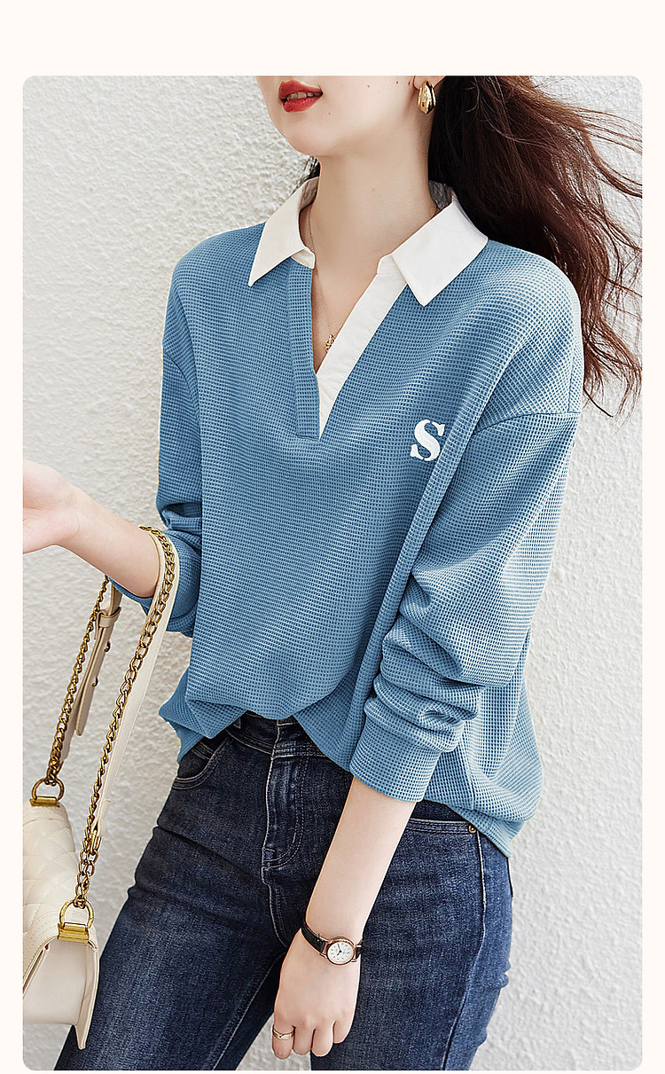【华夫格拼接卫衣】春季学院风字母刺绣翻领宽松藏肉休闲女式上衣 375745