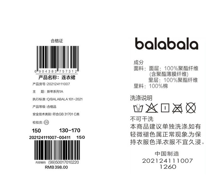 商品名称:巴拉巴拉女童小香风背带裙大童春秋内搭儿童连衣裙 641349