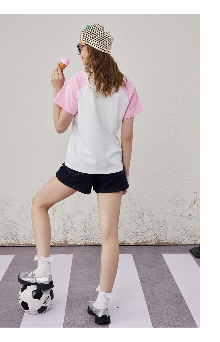 【100%棉】撞色插肩袖运动舒适女式T恤夏季休闲短袖 304861
