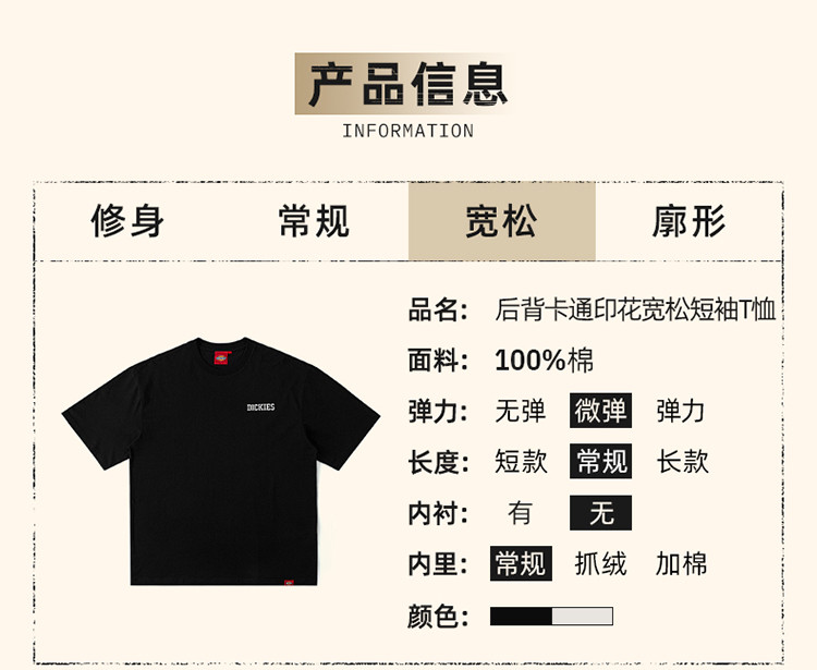 商品名称:Dickies春夏日常 后背卡通印花圆领短袖T恤男女 023298