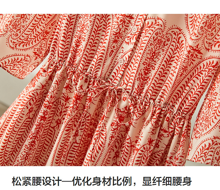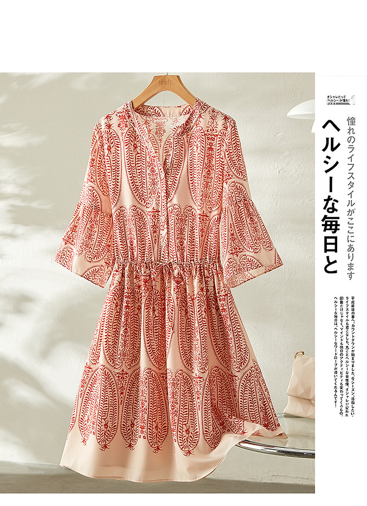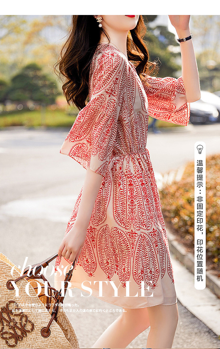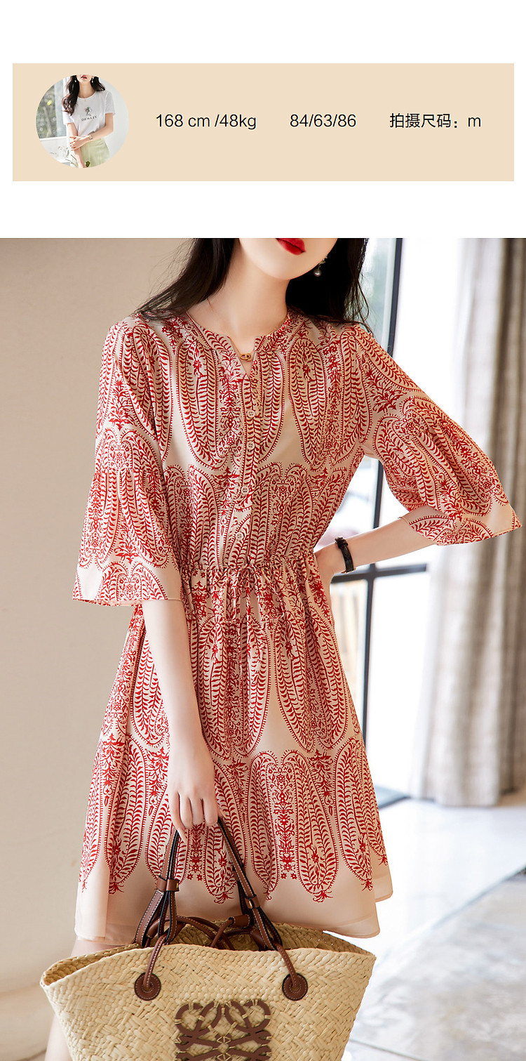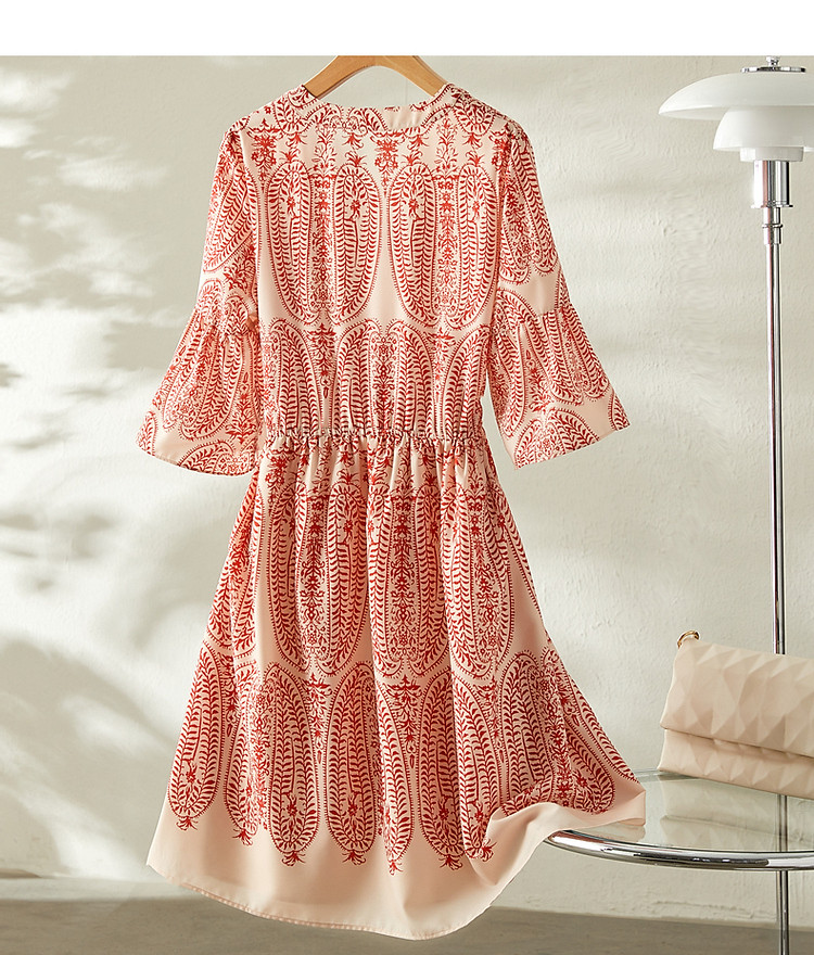商品名称:【佩斯利印花】夏V领五分袖绑带X型伞裙a字连衣裙女中长款 387713