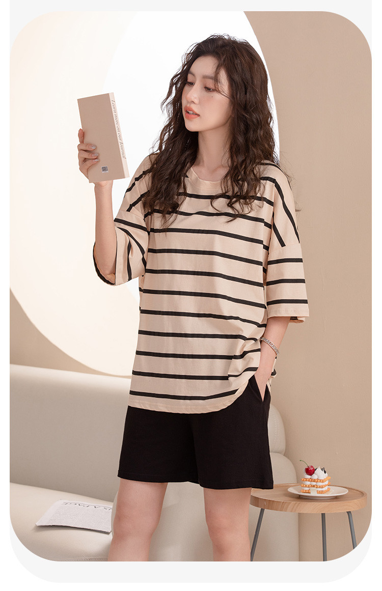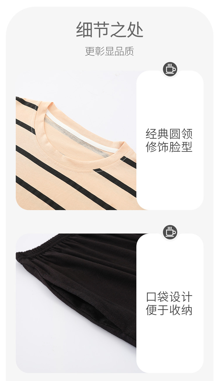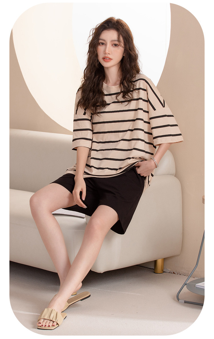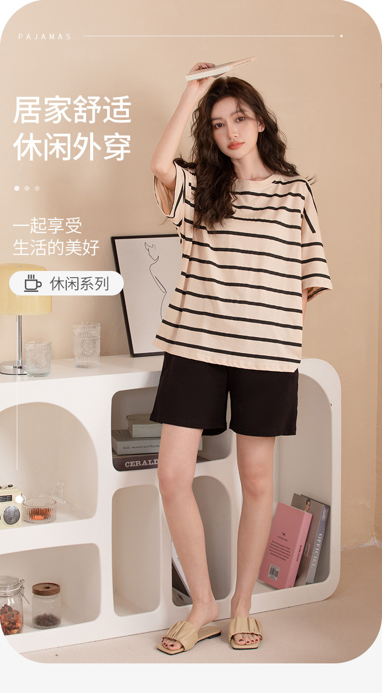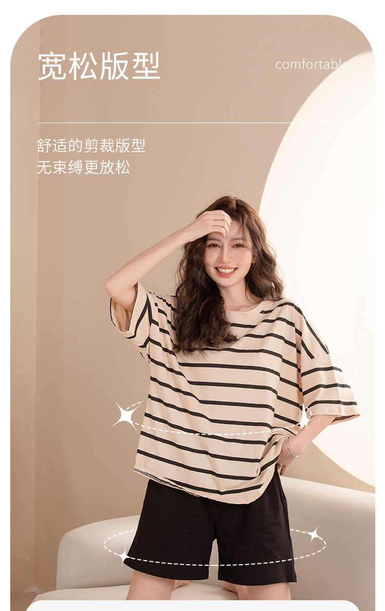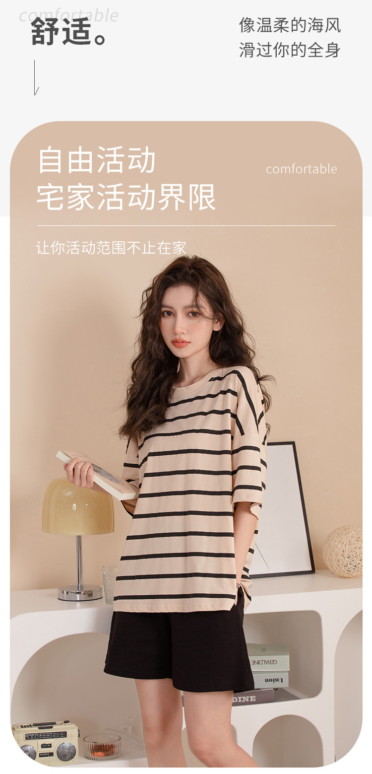 商品名称:【设计师推荐】夏季条纹短袖纯棉睡衣休闲韩版宽松女士家居服套装 298315