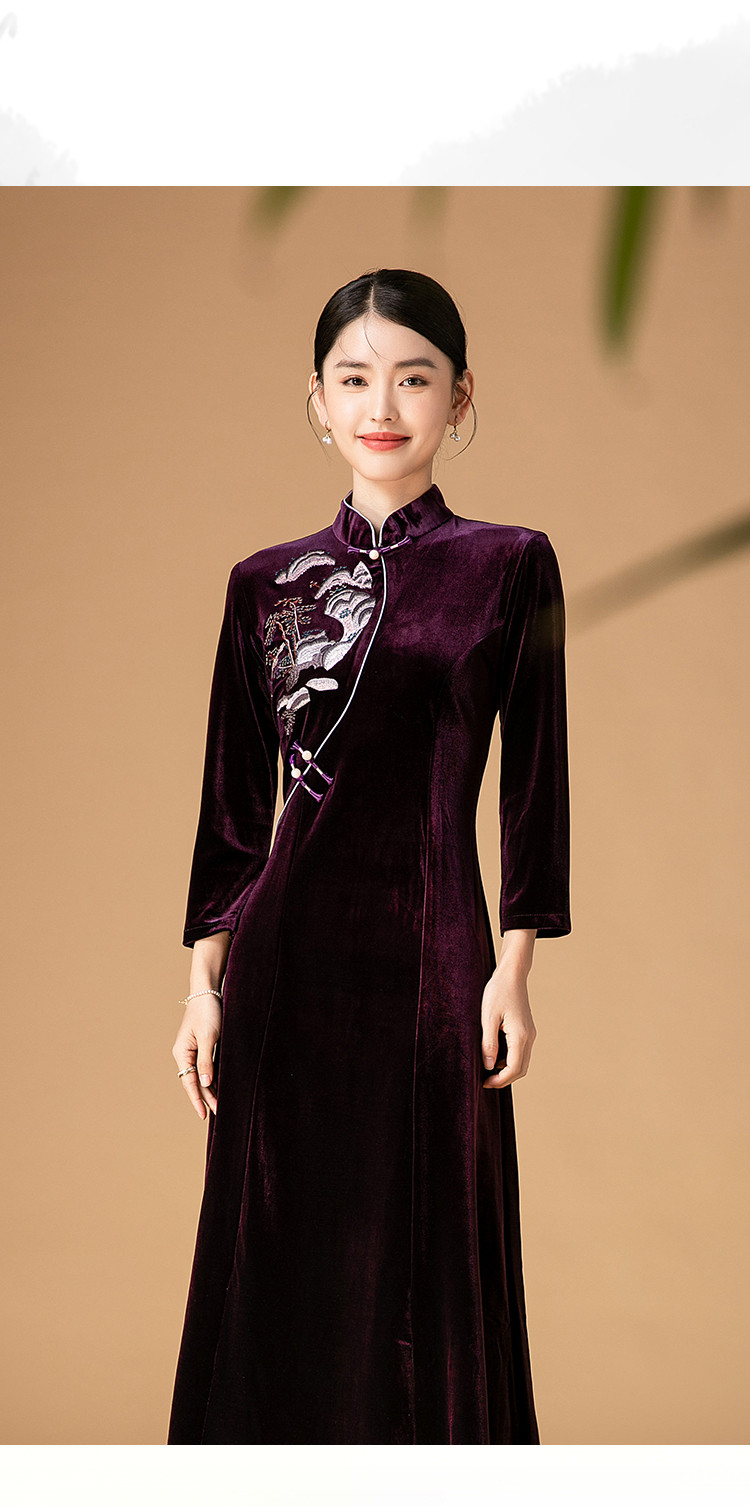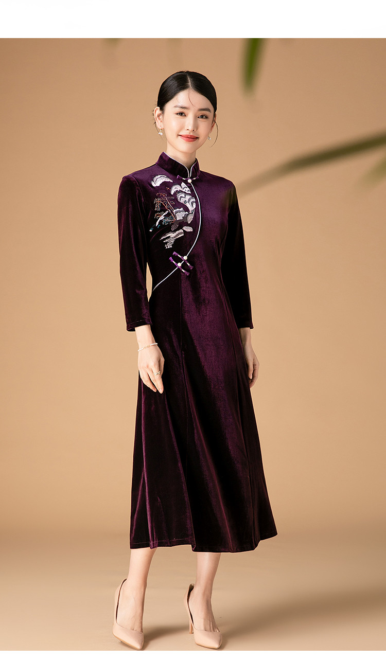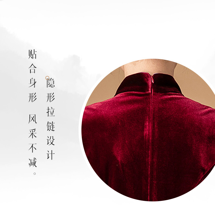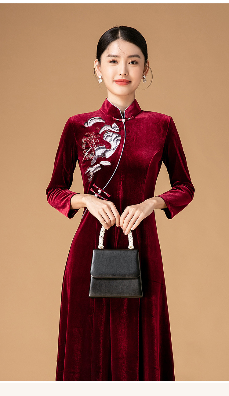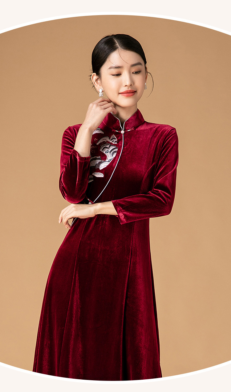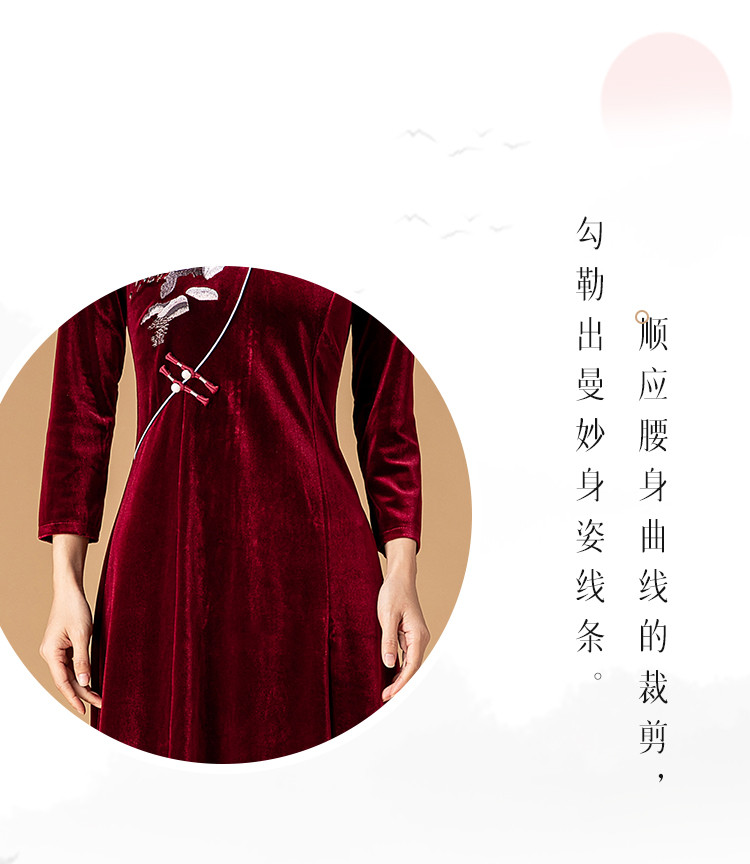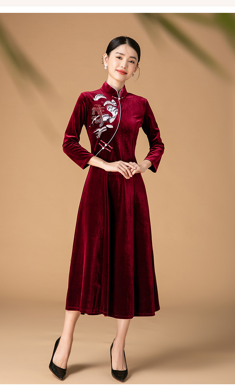 商品名称:波尔多红金丝绒刺绣旗袍中长款显瘦连衣裙立领复古高级感连衣裙 153887