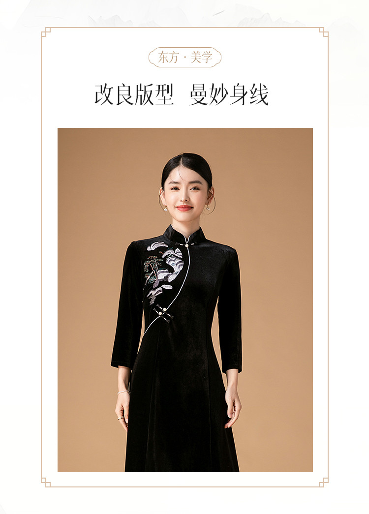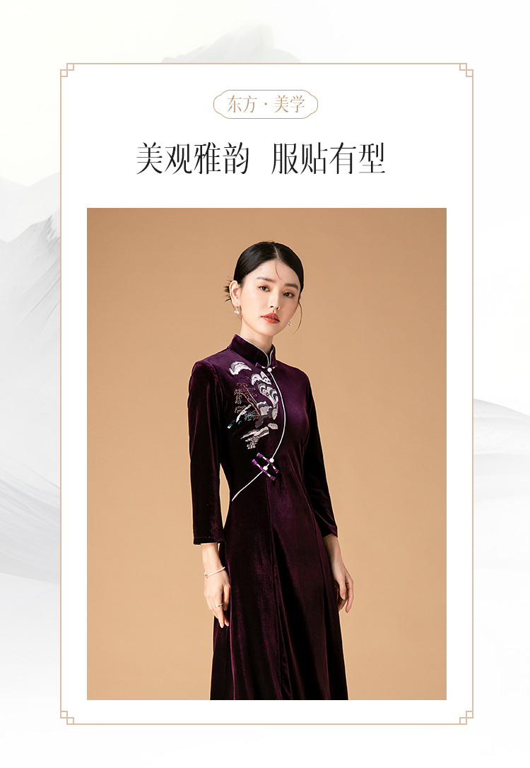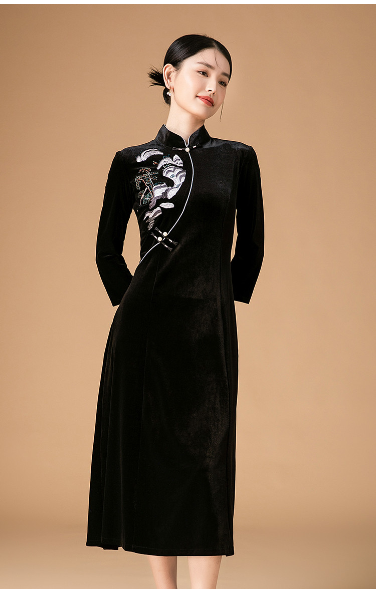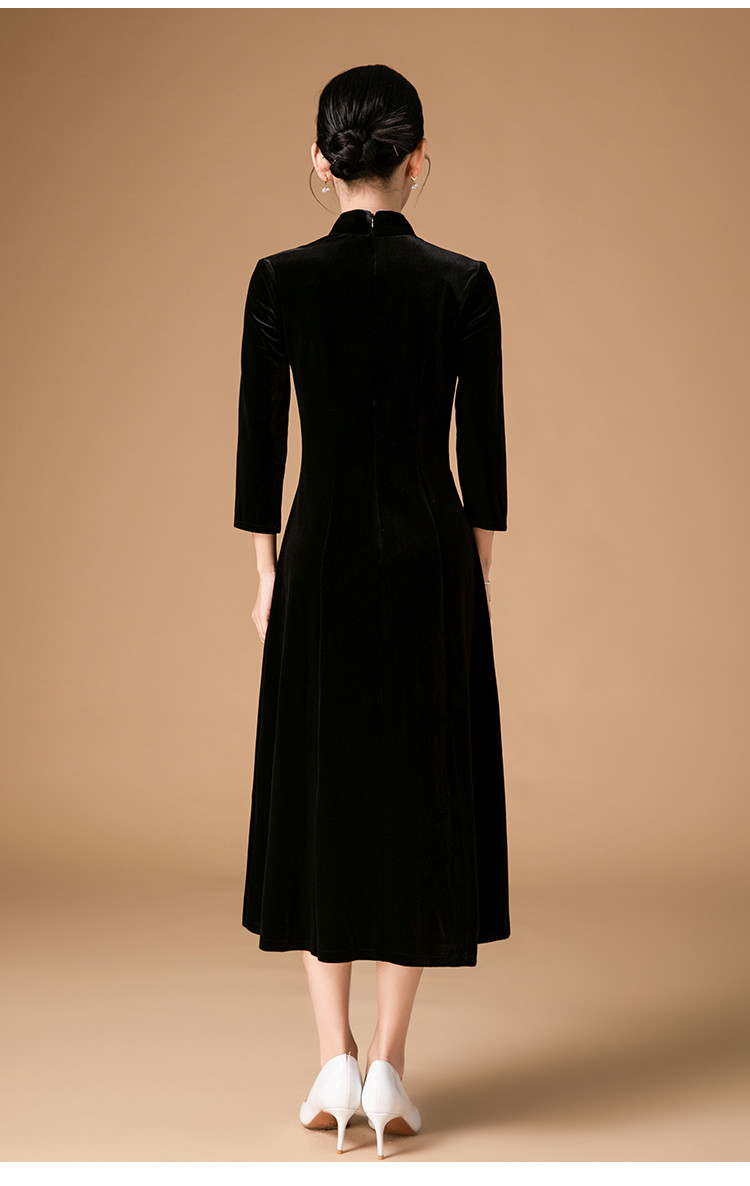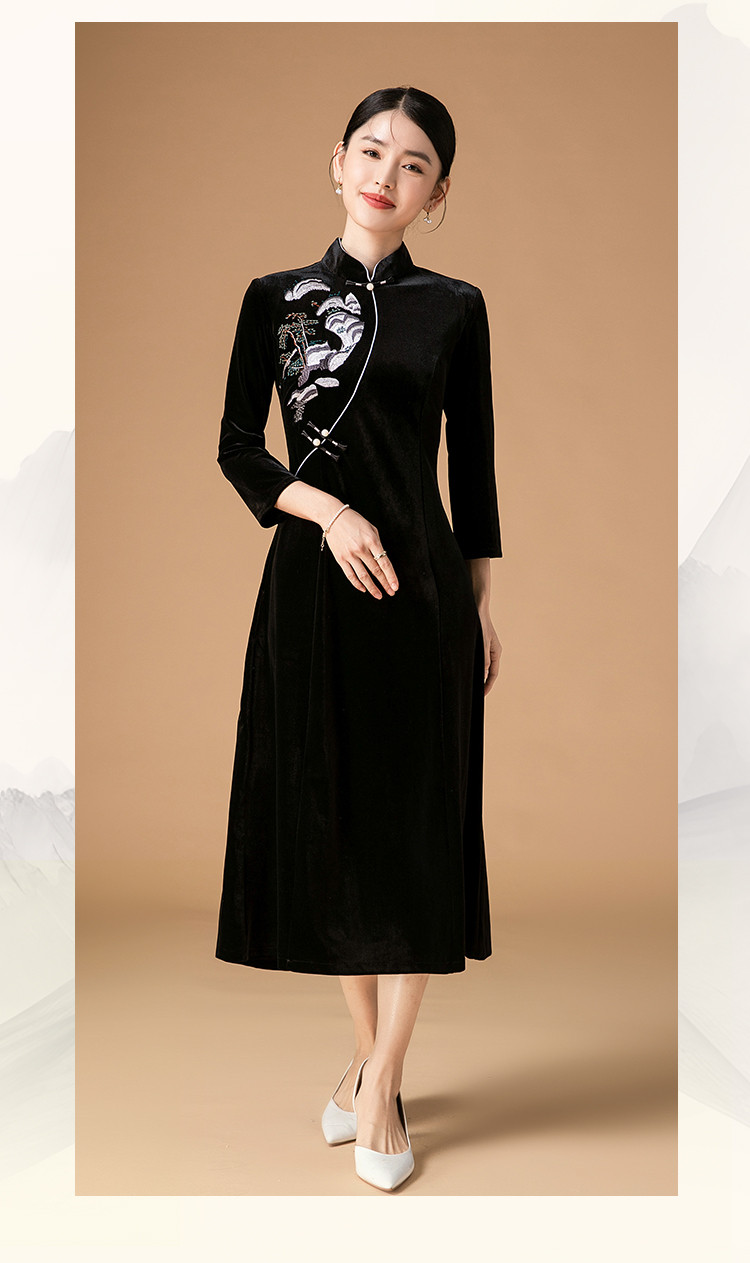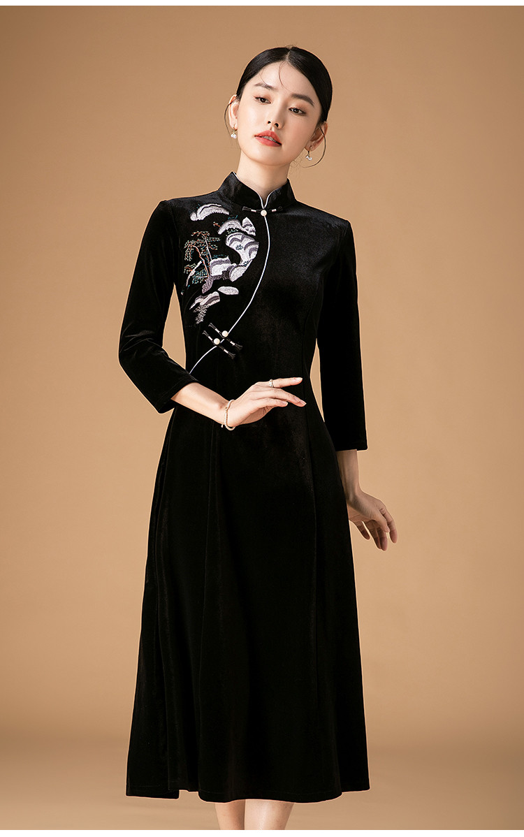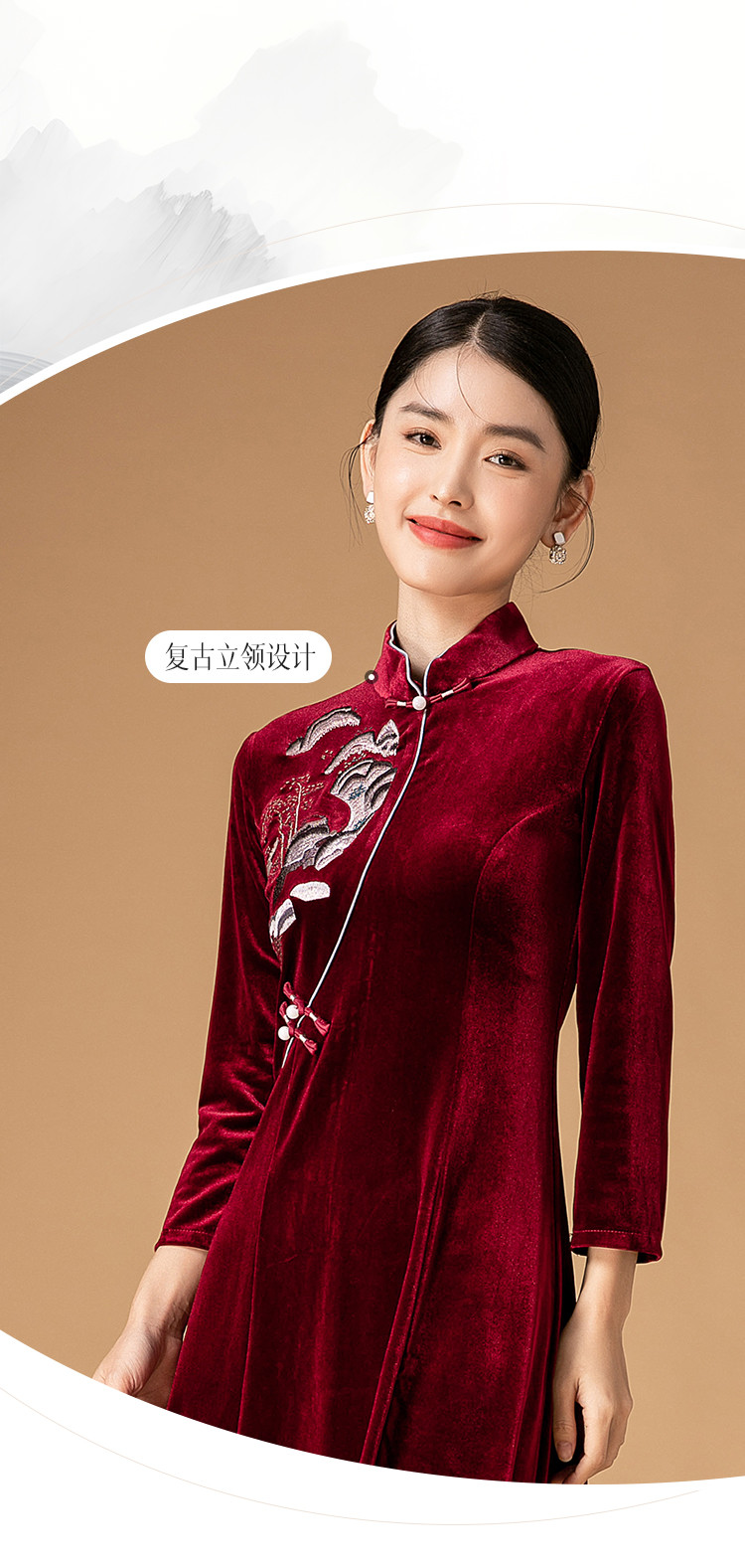 商品名称:波尔多红金丝绒刺绣旗袍中长款显瘦连衣裙立领复古高级感连衣裙 153887