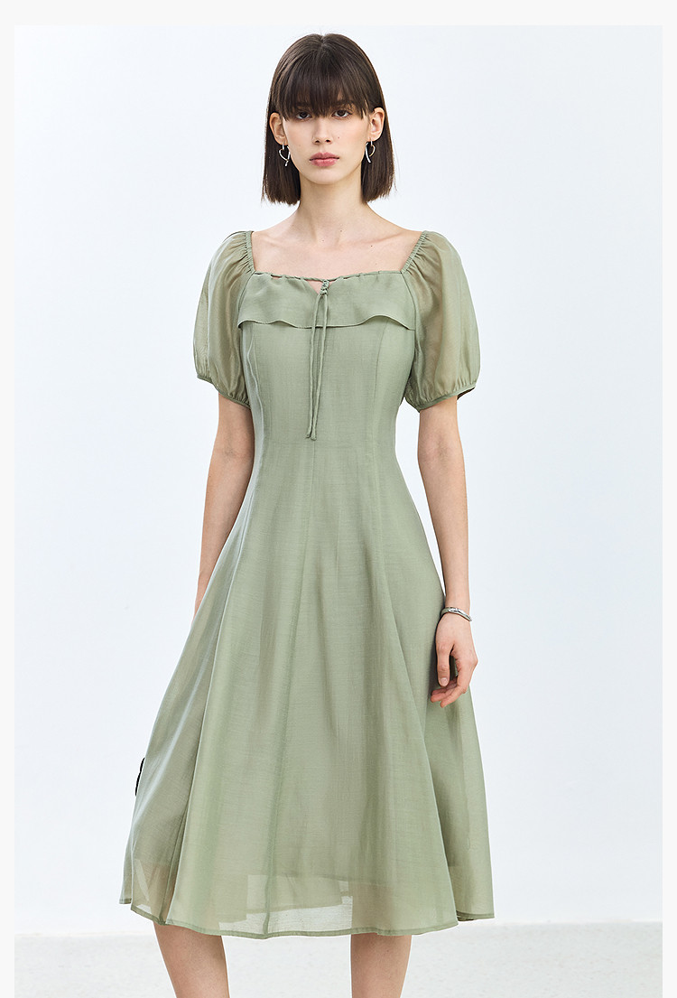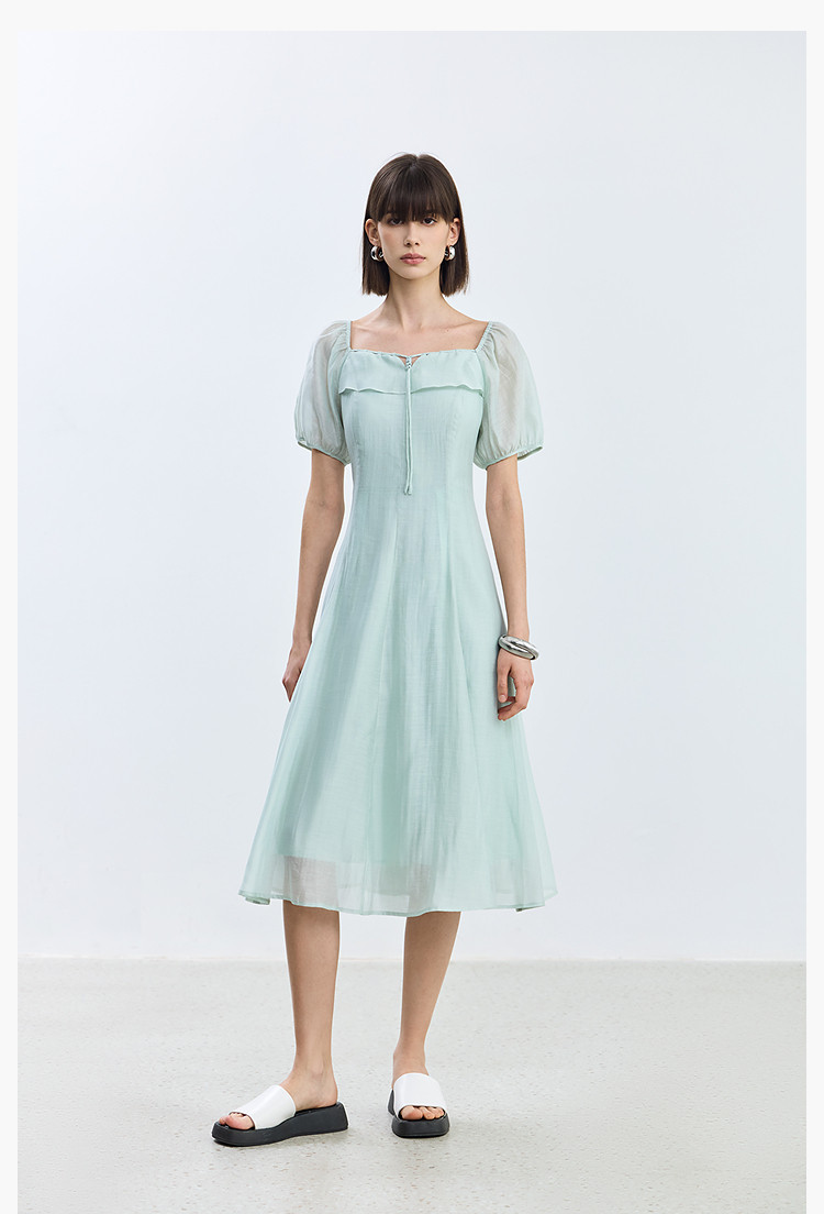 夏季浪漫通勤款复古气质方领泡泡袖长款收腰连衣裙 222619