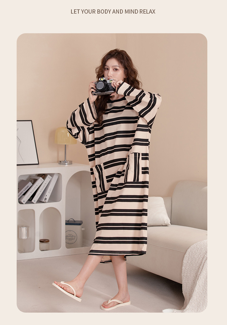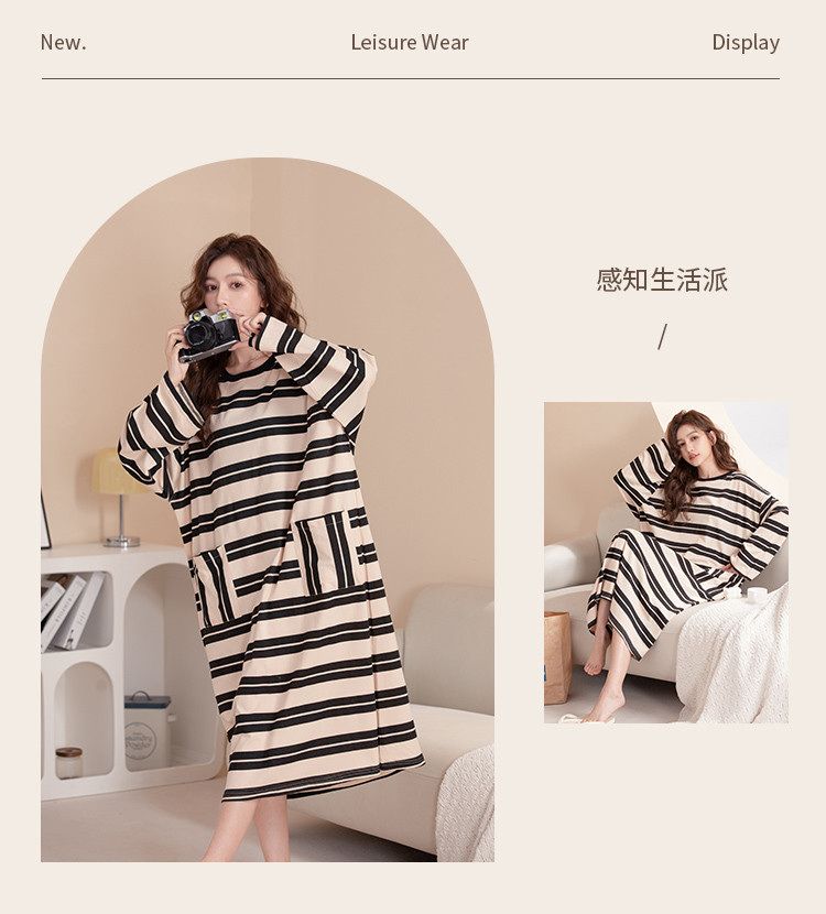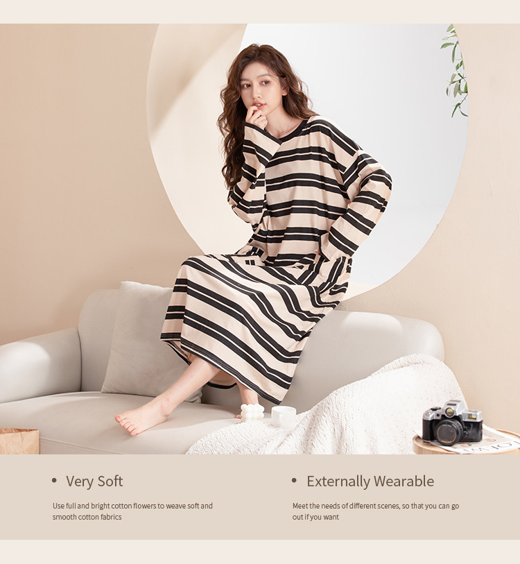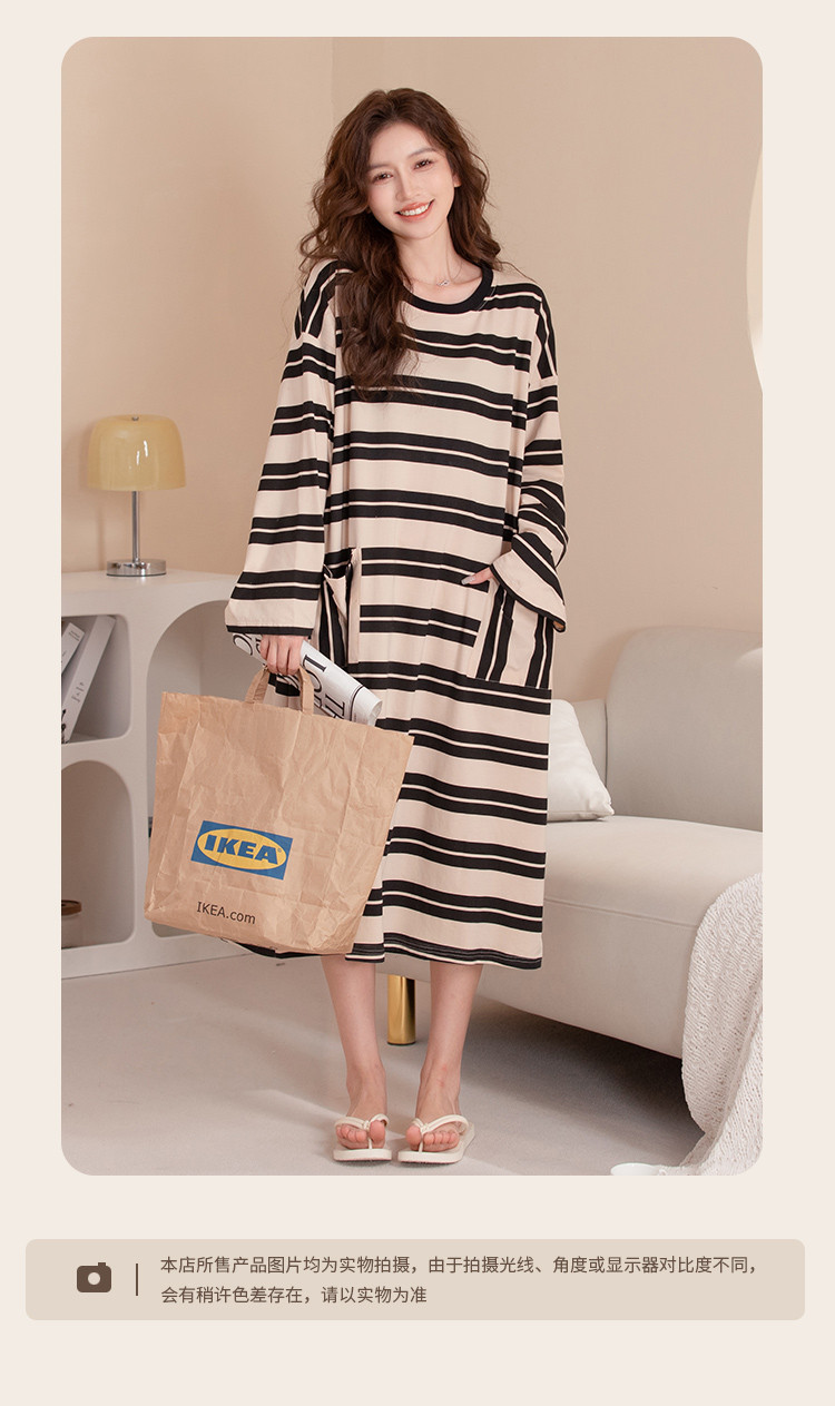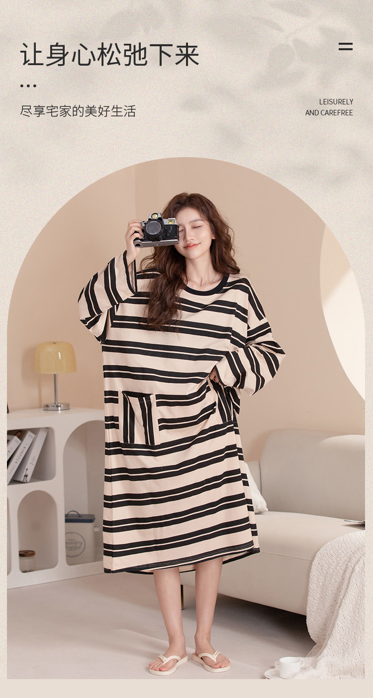 商品名称:【100%棉】慵懒风条纹长袖睡裙女春秋款高级感纯棉家居服睡衣 735691