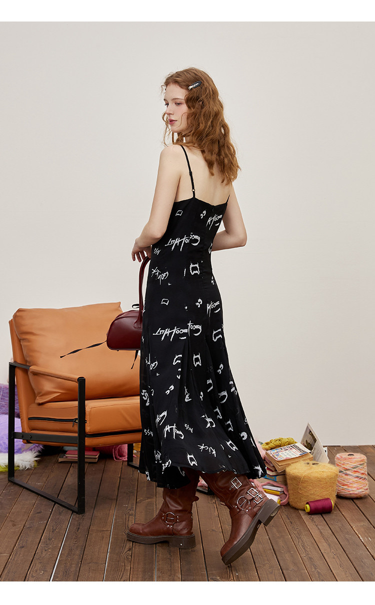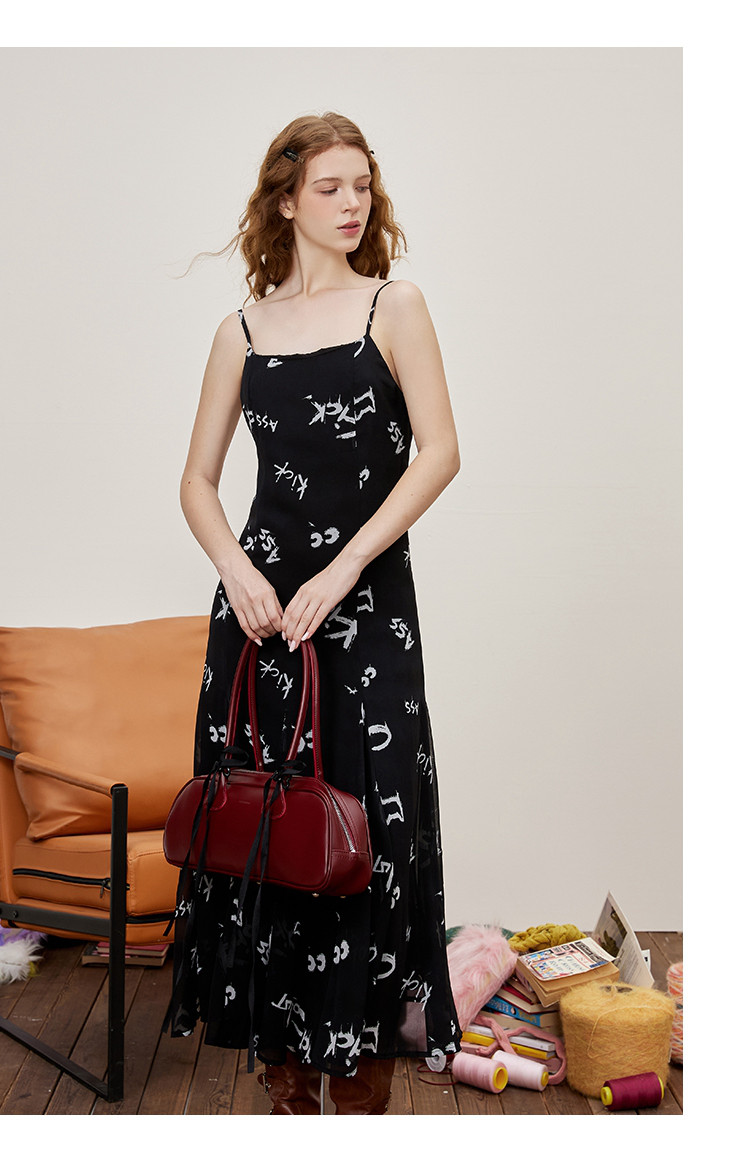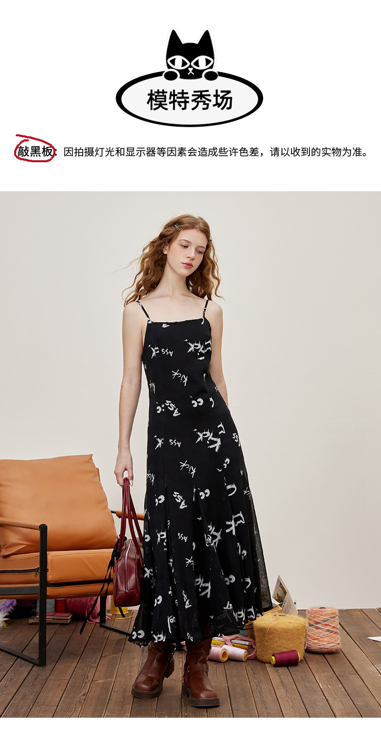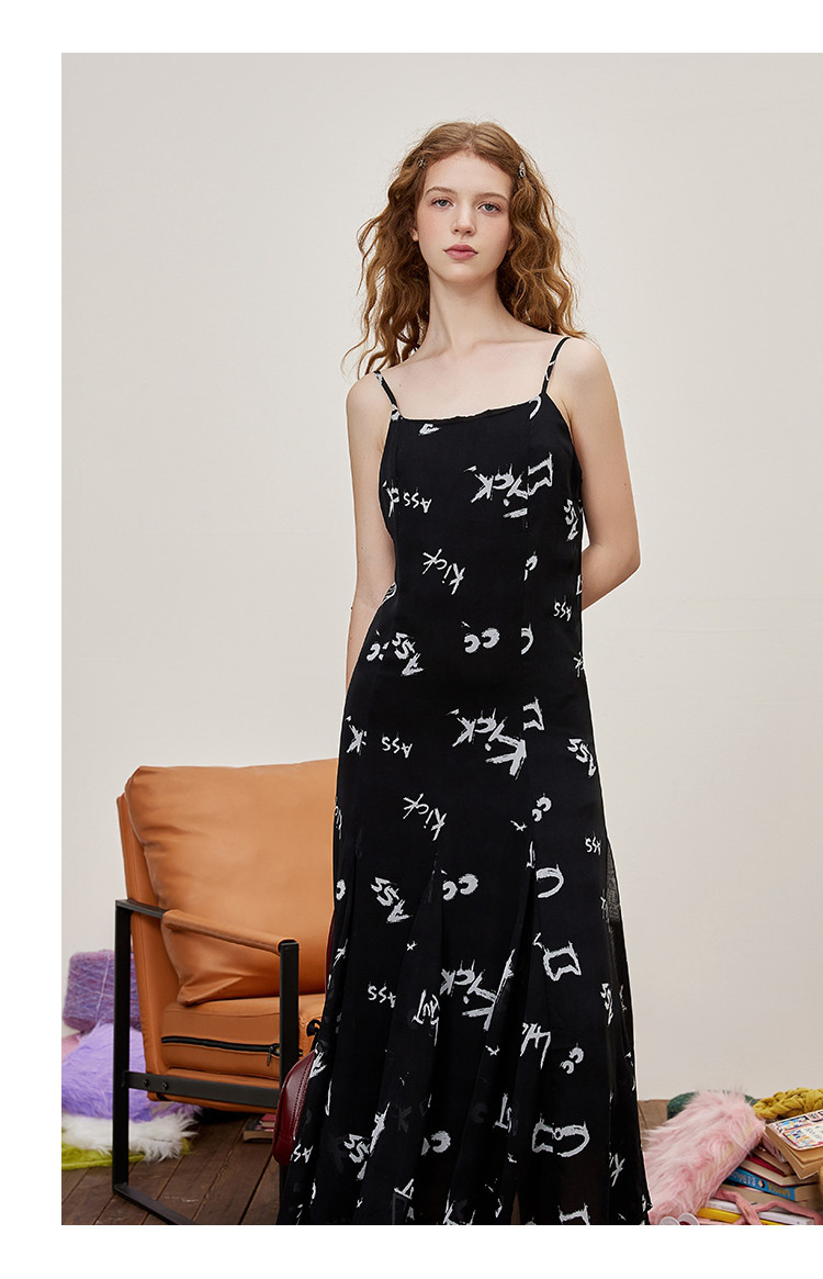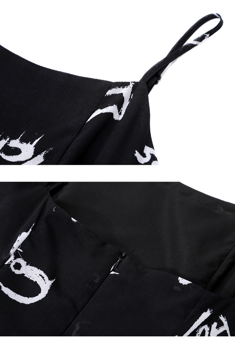 个性涂鸦印设计荷叶边开叉吊带裙夏季休闲度假风连衣裙 761757
