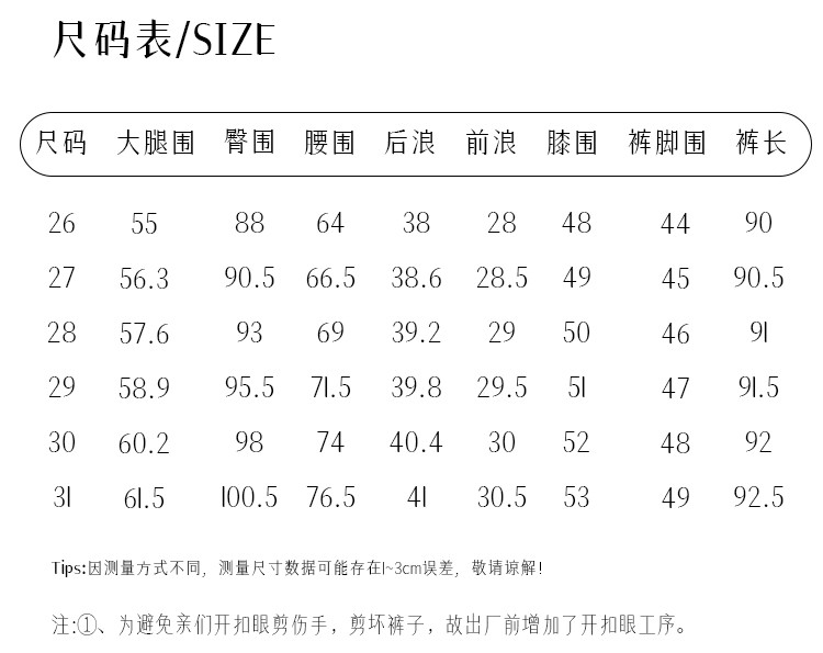 | 尺码 | 大腿围(cm) | 裤脚围(cm) | 前浪(cm) | 后浪(cm) | 腰围(cm) | 裤长(cm) | 膝围(cm) | 臀围(cm) | 号型 |