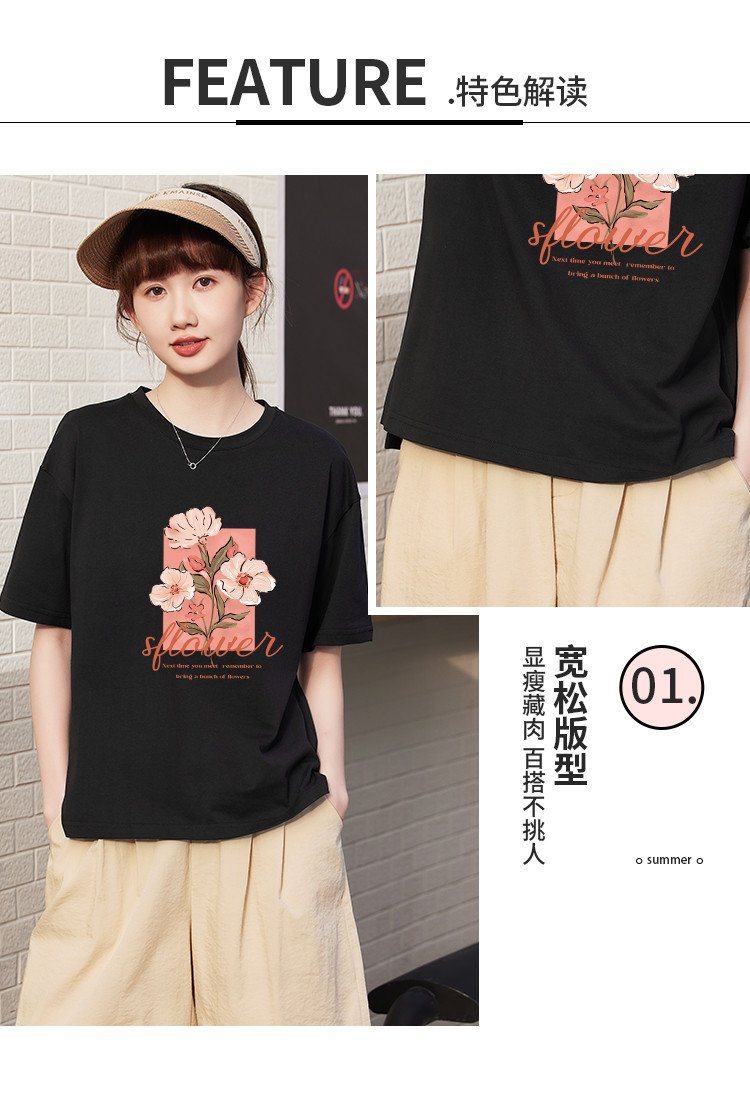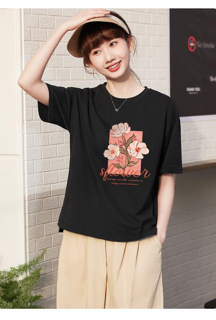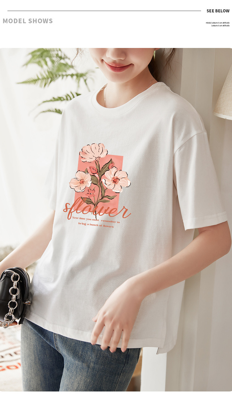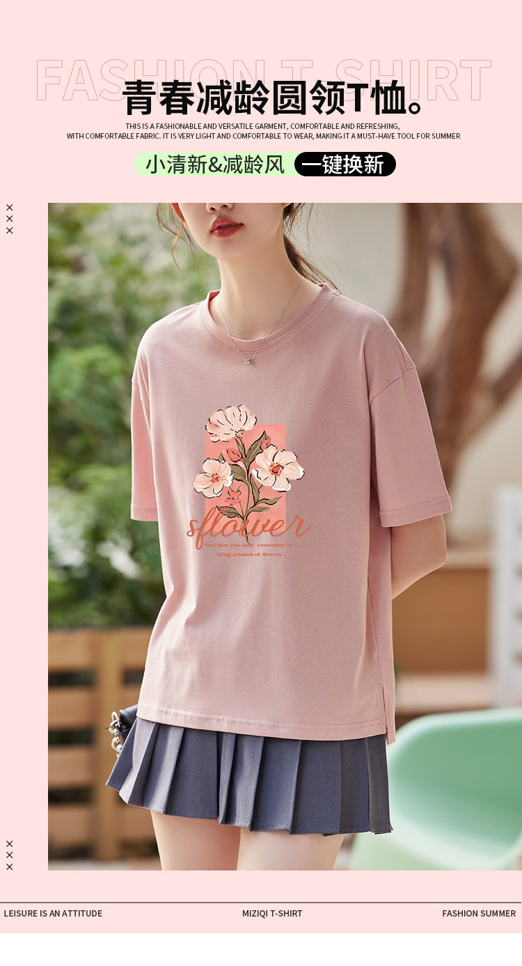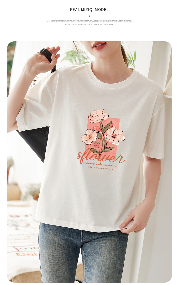 商品名称:米子旗夏季款圆领大码T恤花朵印花女宽松休闲短袖上衣 159194