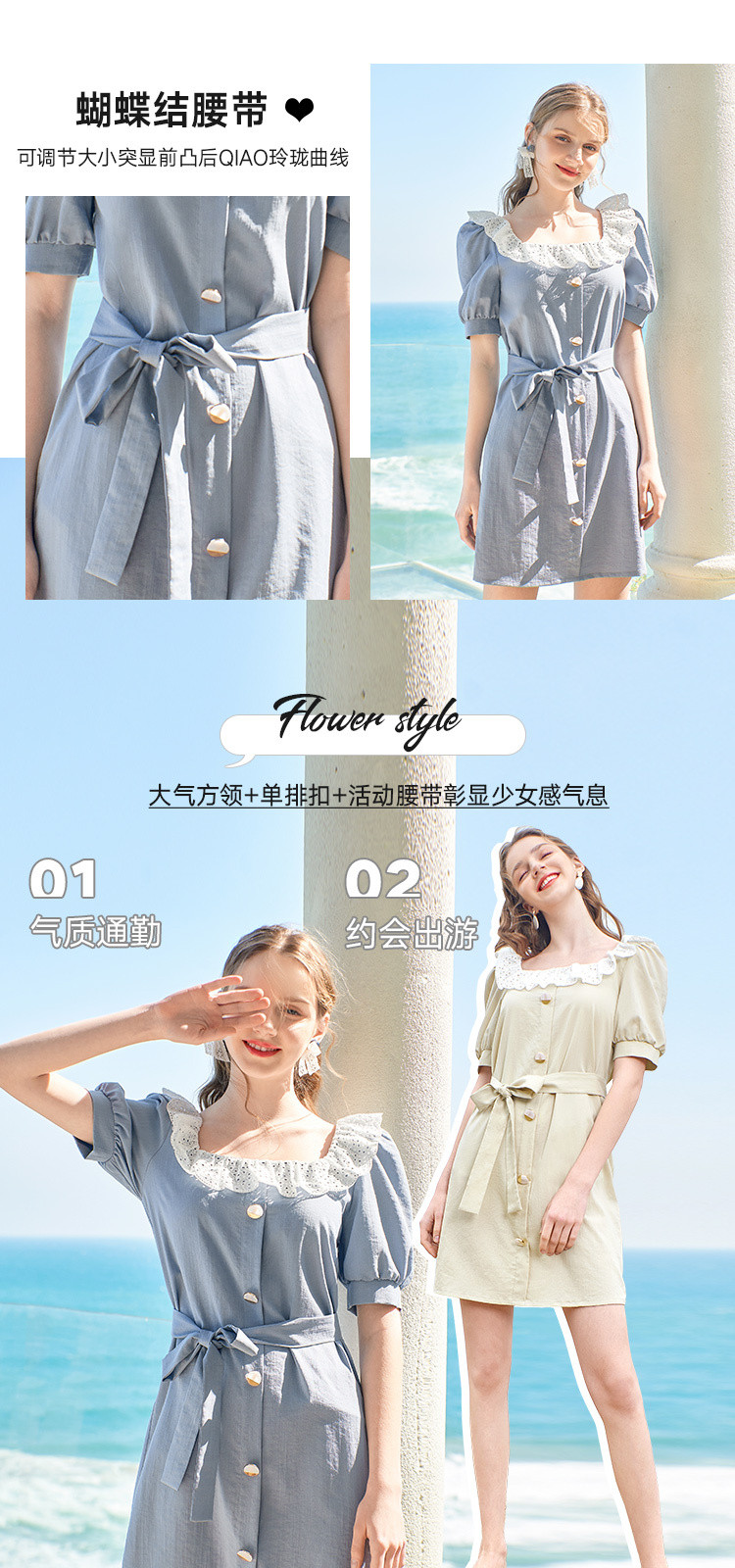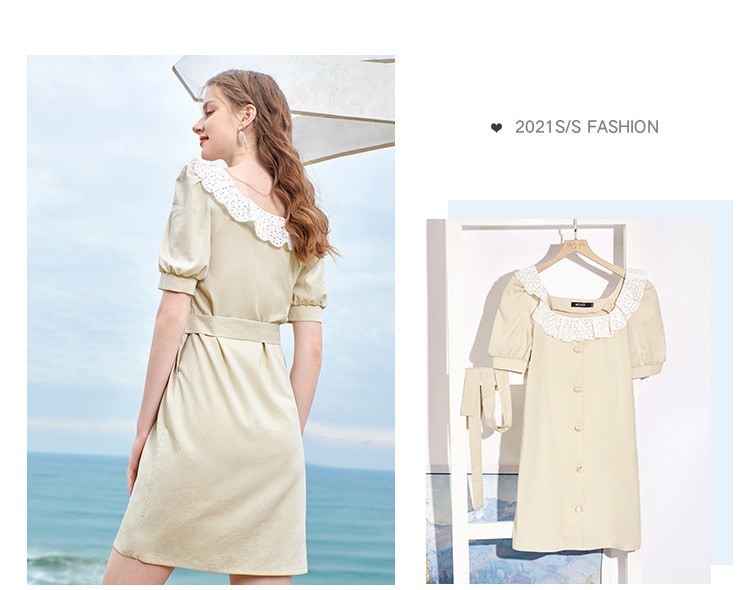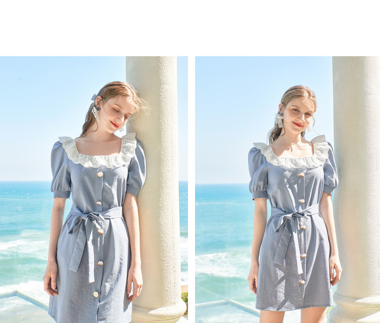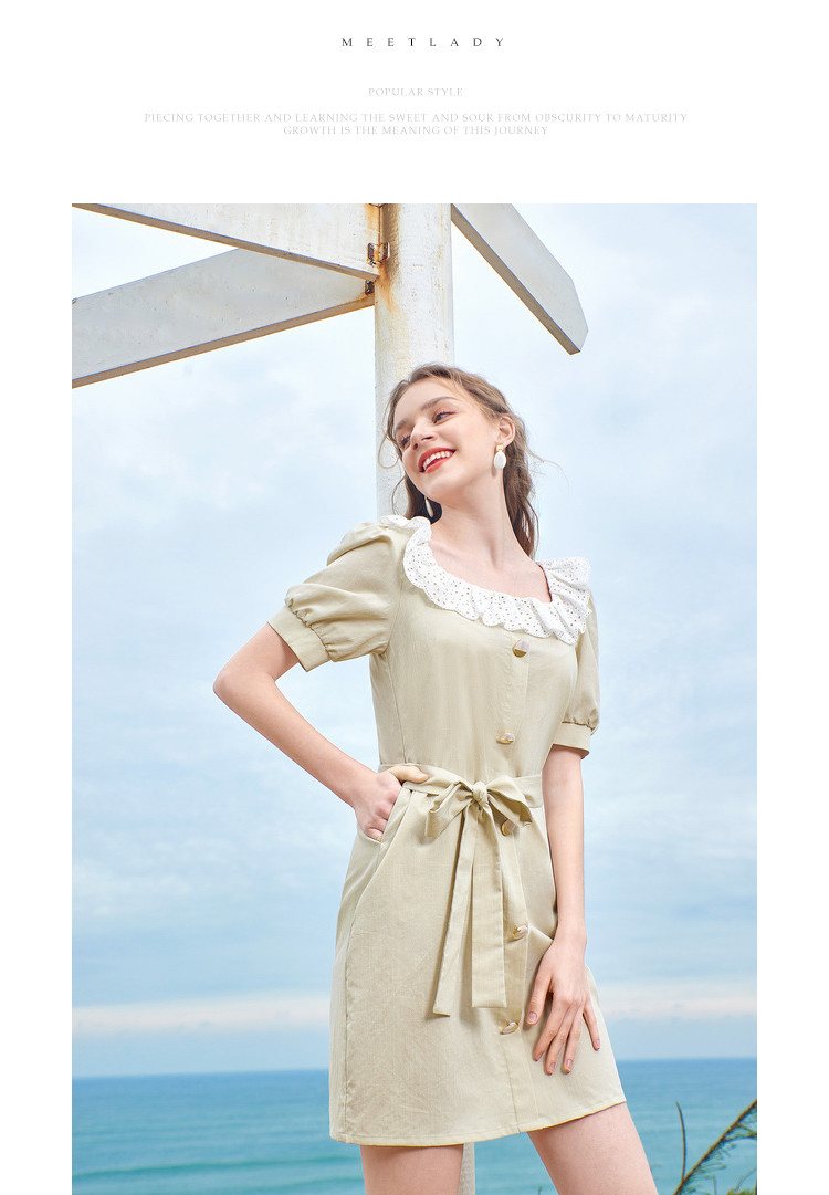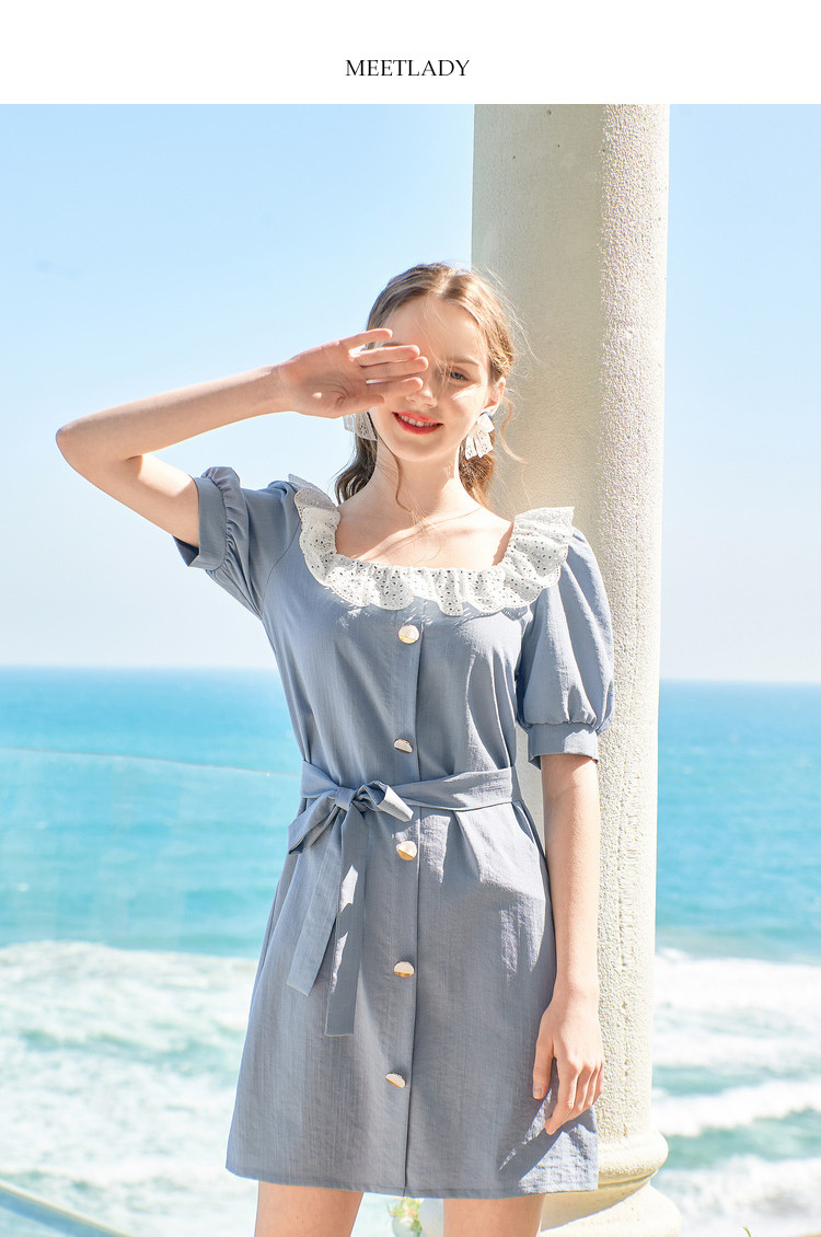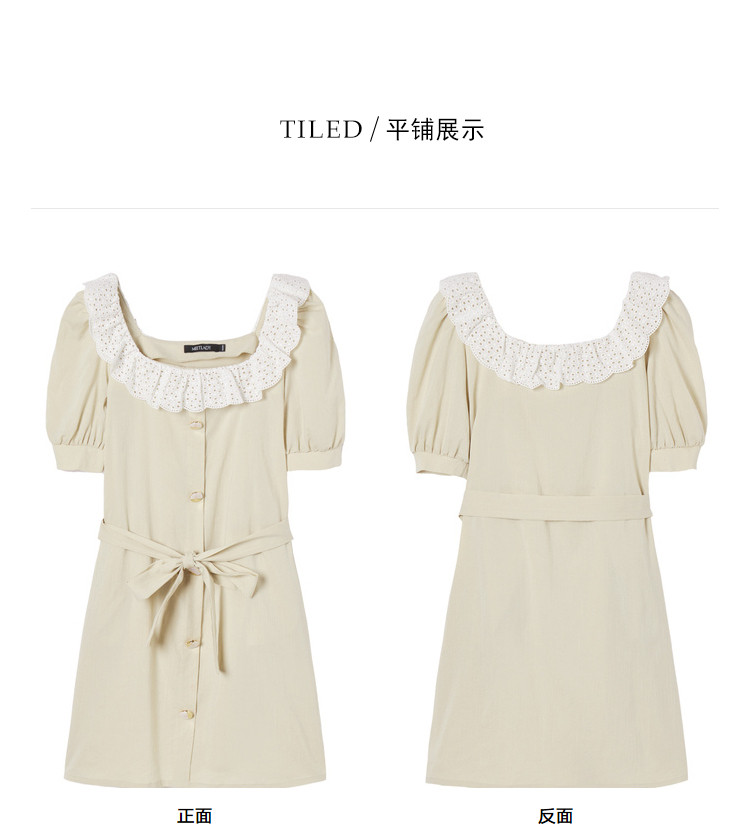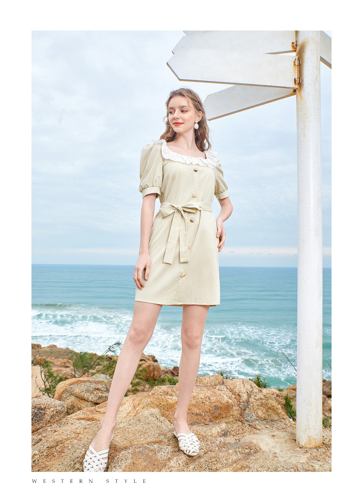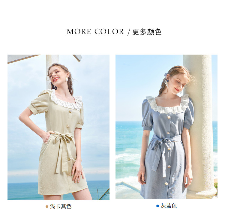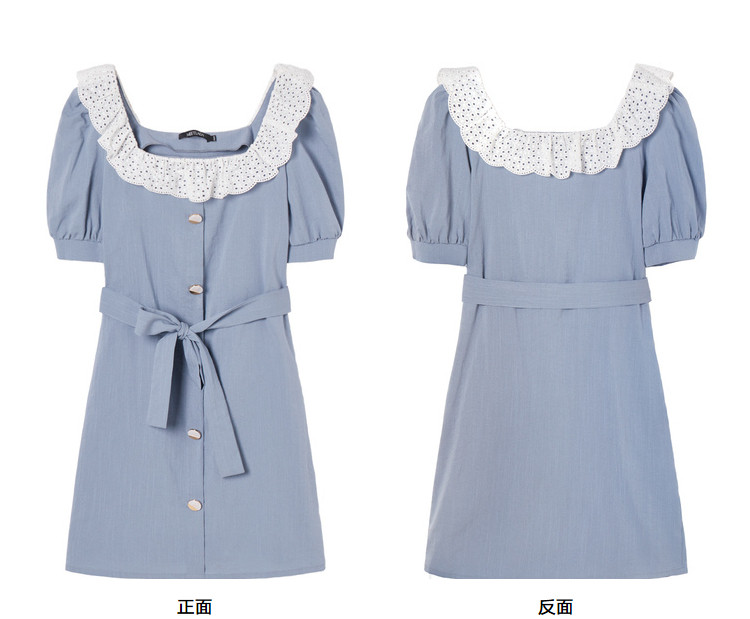 夏装简约方领拼接撞色连衣裙女泡泡袖收腰a字裙 532884