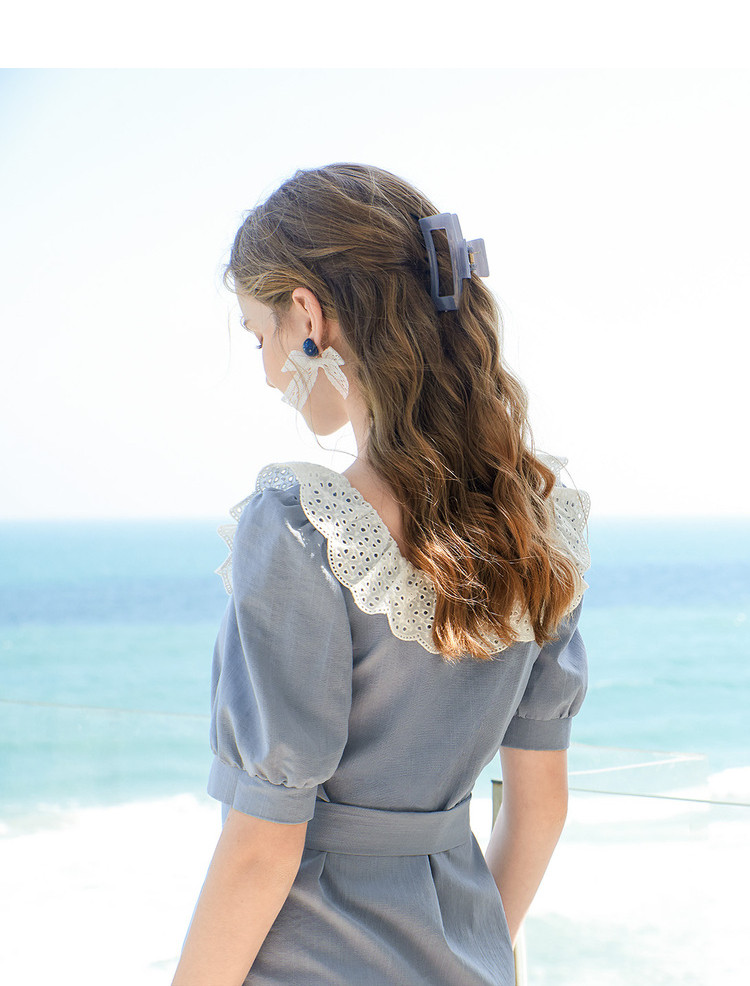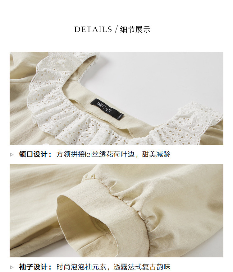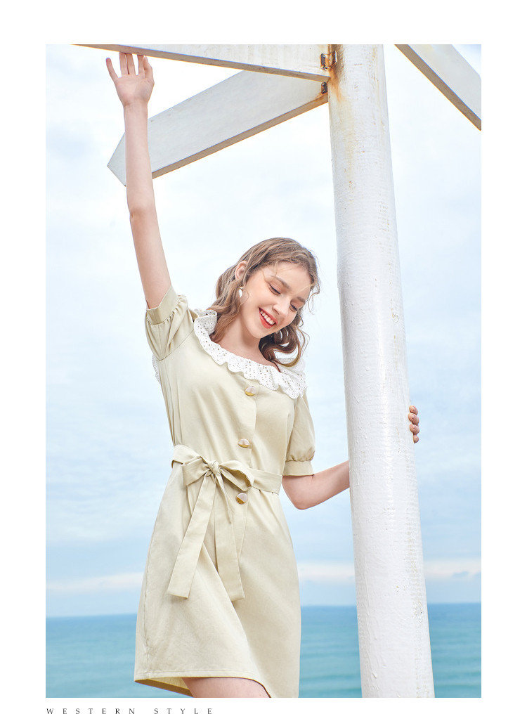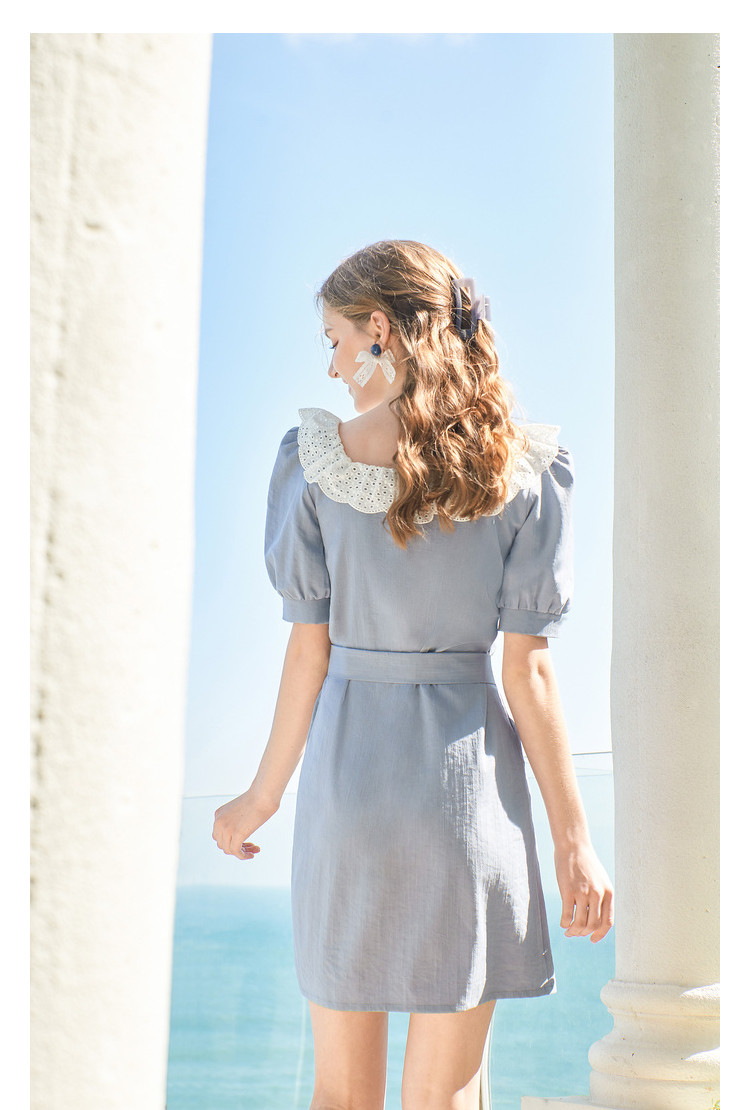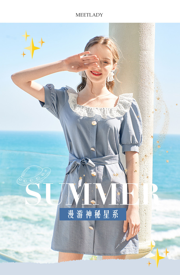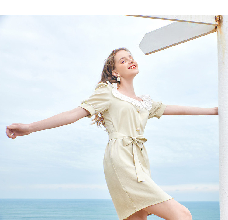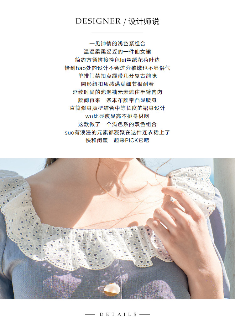 夏装简约方领拼接撞色连衣裙女泡泡袖收腰a字裙 532884