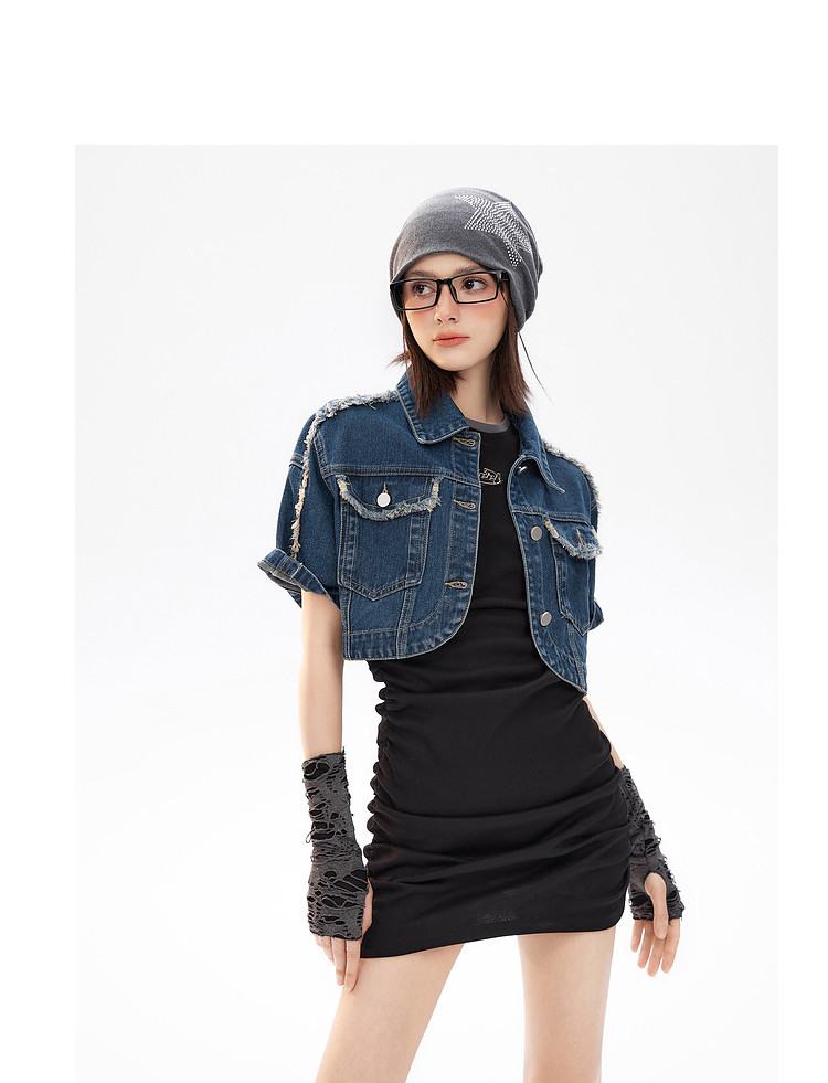 早秋复古毛边牛仔小坎肩女甜酷辣妹风短袖小衬衫 160276