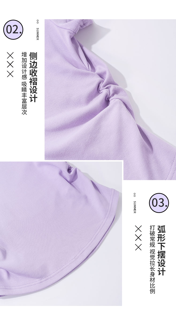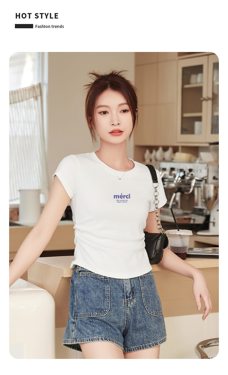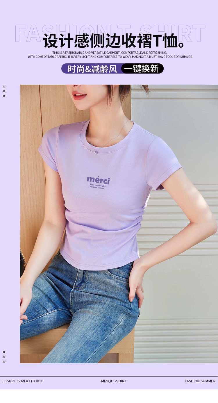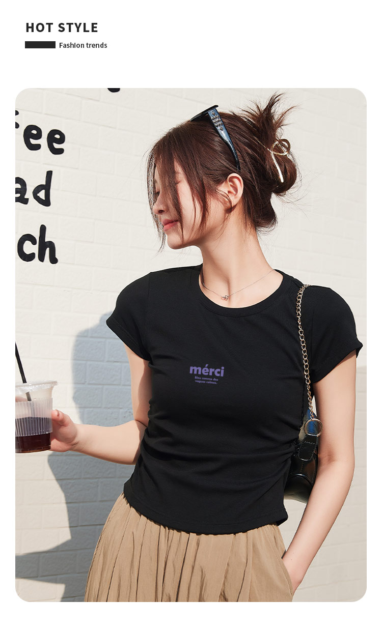 商品名称:米子旗夏季圆领字母印花女式T恤侧边抽褶短款修身简约短袖上衣 551450