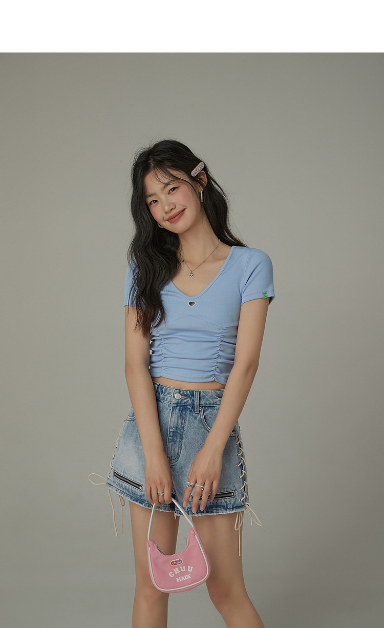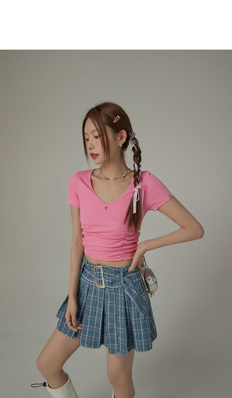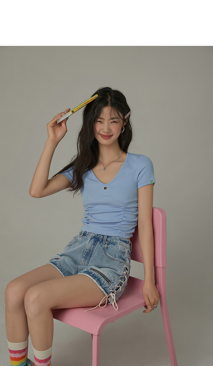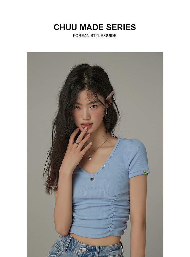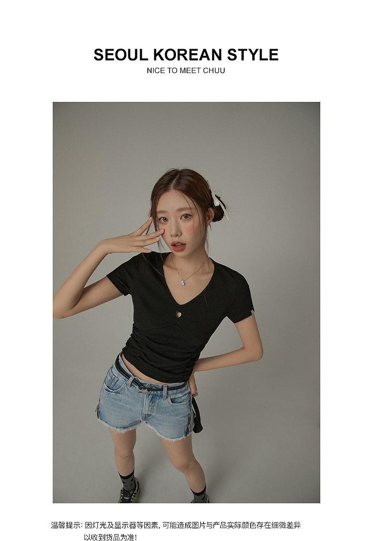 商品名称:爱心镂空T恤女春夏设计感褶皱修身显瘦甜辣短款上衣 342803