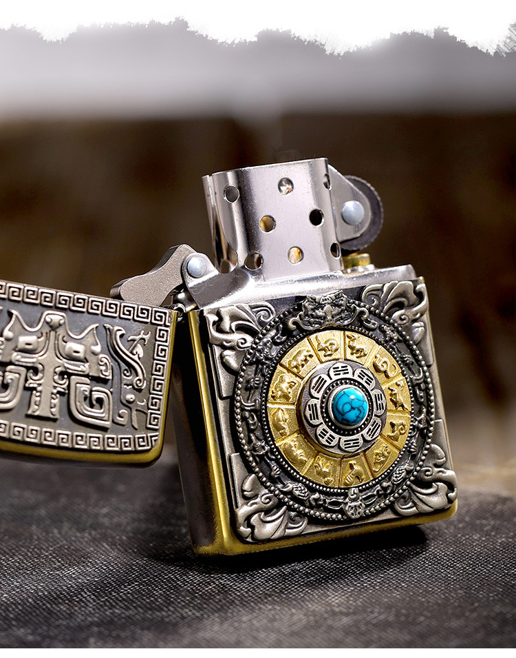 【国风】原装煤油打火机立体浮雕八卦盘镶嵌松石吉祥收藏礼物 399198