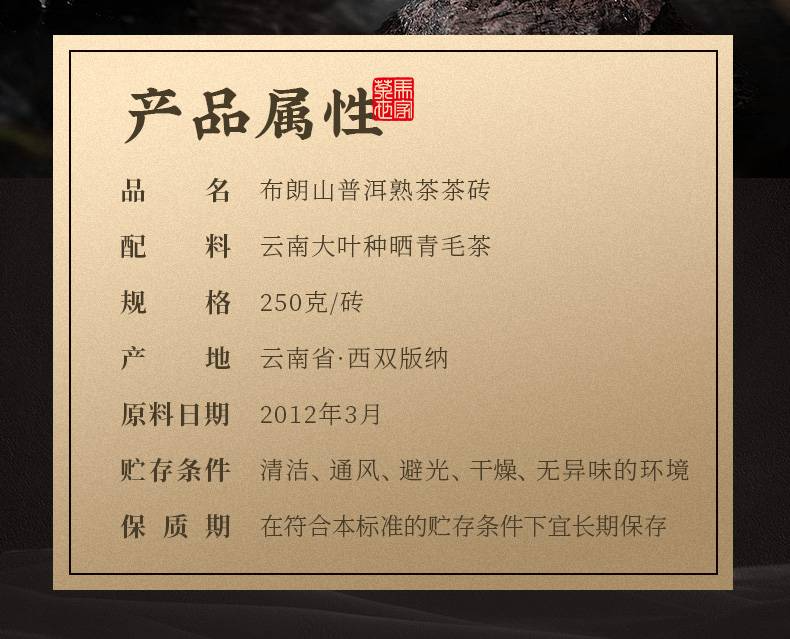 商品名称:茶马世家布朗山12年陈料云南勐海普洱茶砖古树老茶砖陈香茶叶