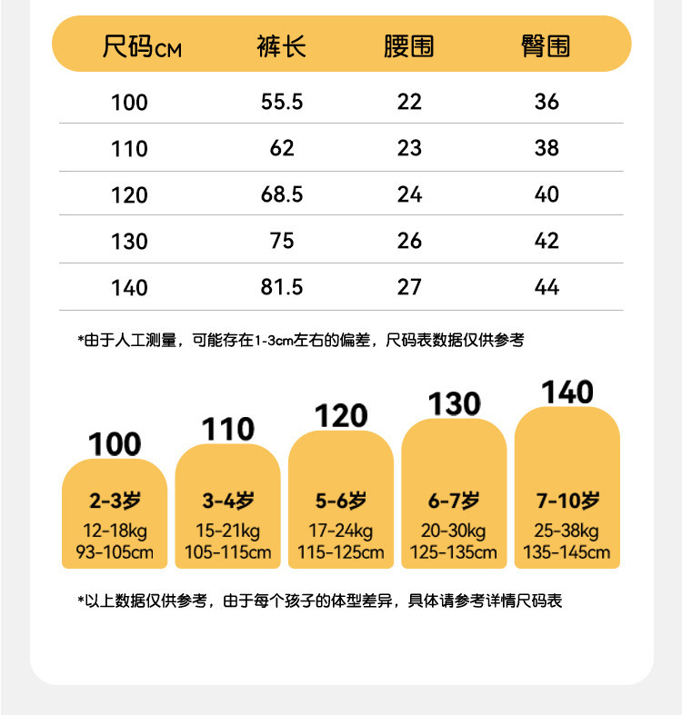 | 尺码 | 身高(cm) | 腰围(cm) | 裤长(cm) | 臀围(cm) | 适合年龄 | 号型 |