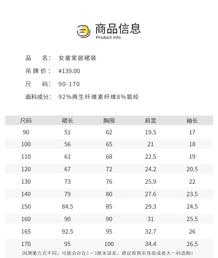 | 尺码 | 裙长(cm) | 肩宽(cm) | 身高(cm) | 袖长(cm) | 适合年龄 | 胸围(cm) | 号型 |
