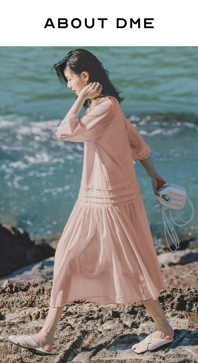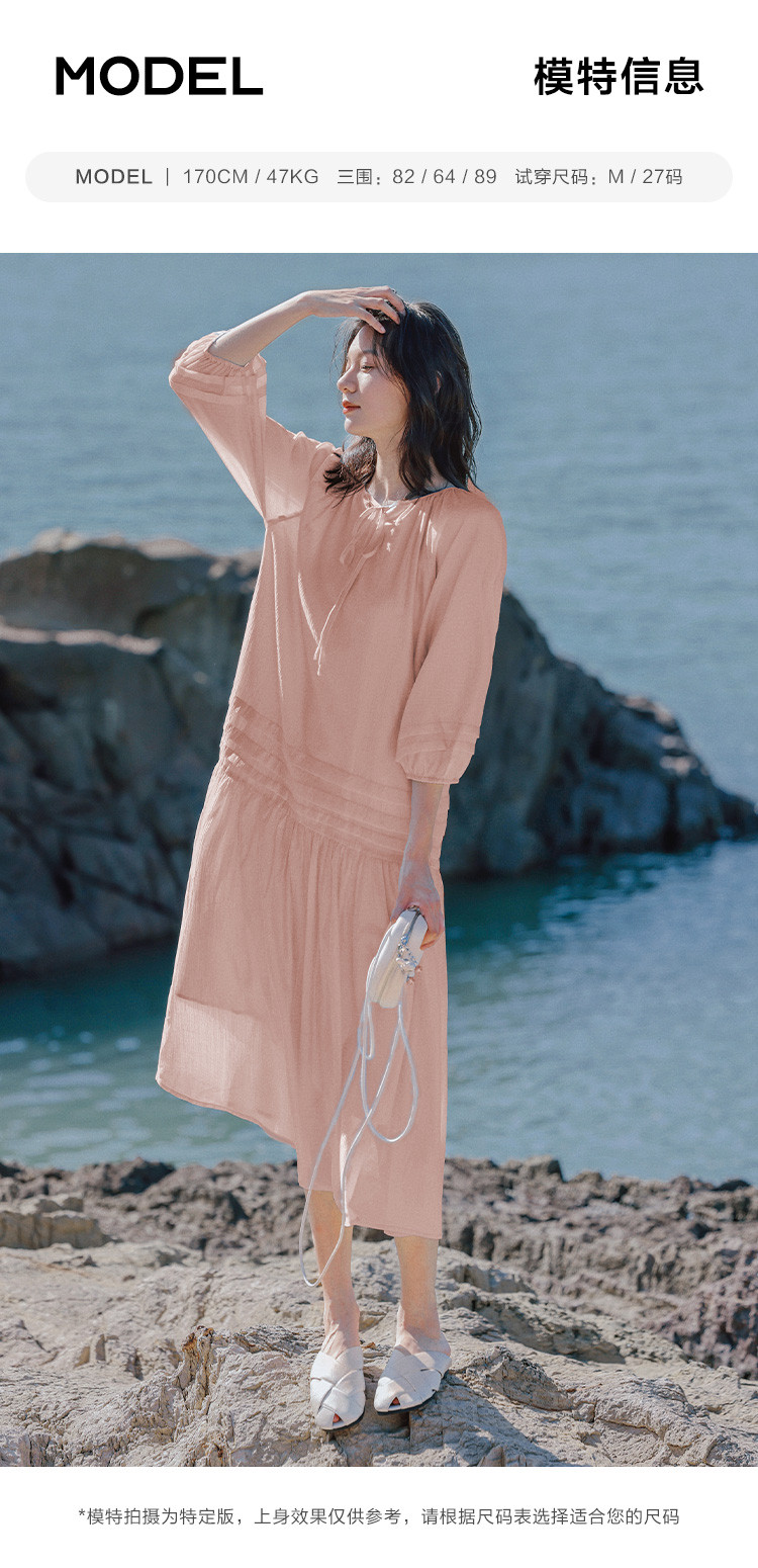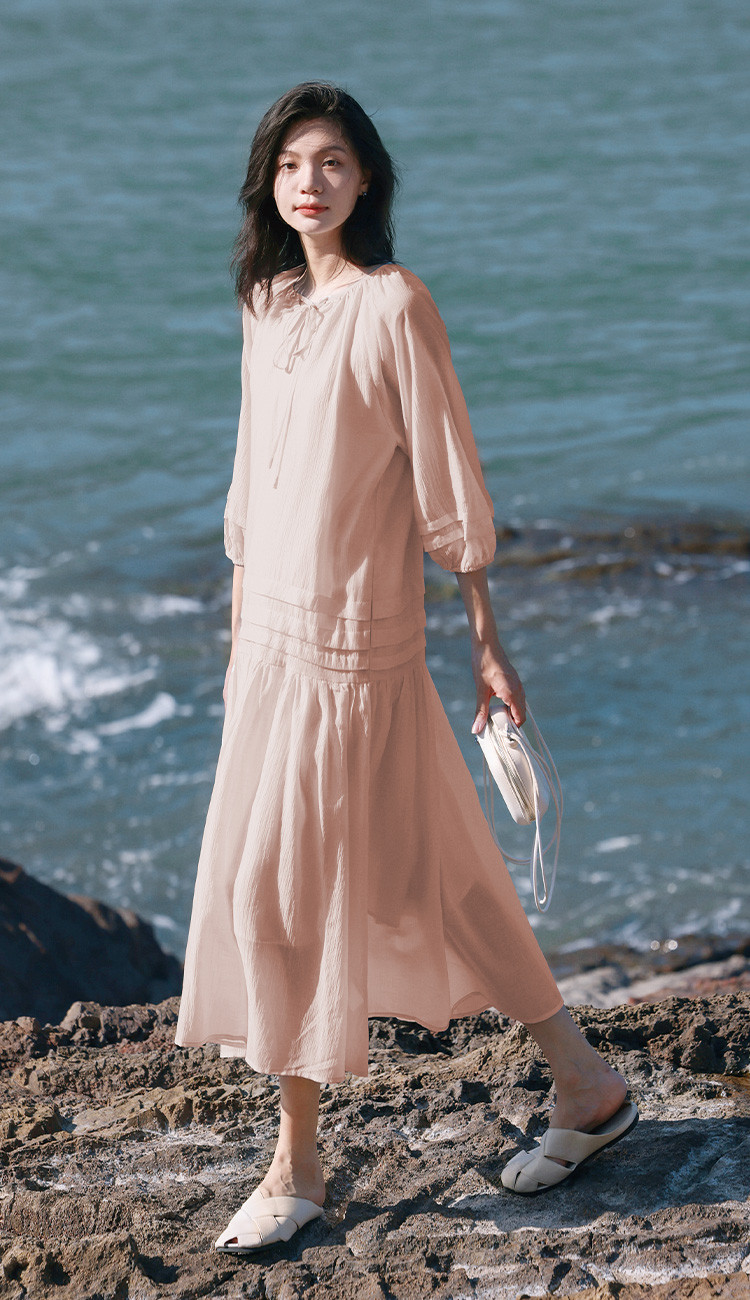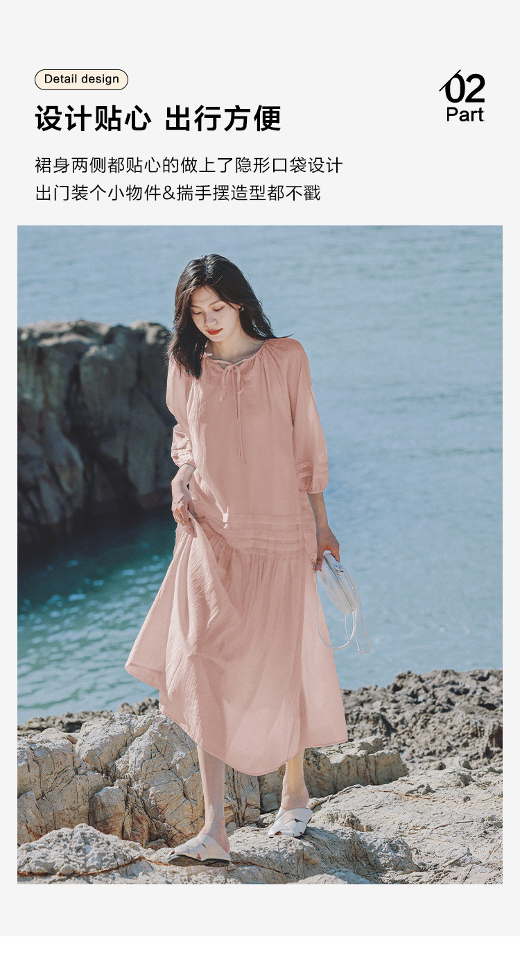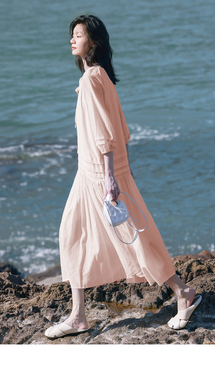 商品名称:【优雅气质粉长裙】夏圆领领口系带中袖连衣裙 231042