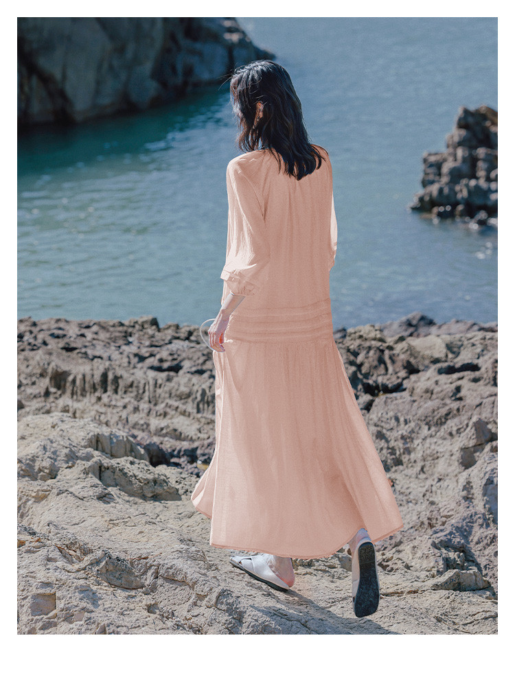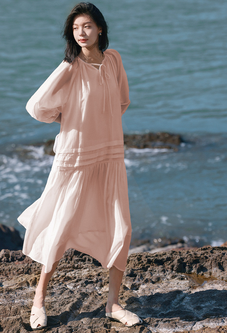 【优雅气质粉长裙】夏圆领领口系带中袖连衣裙 231042